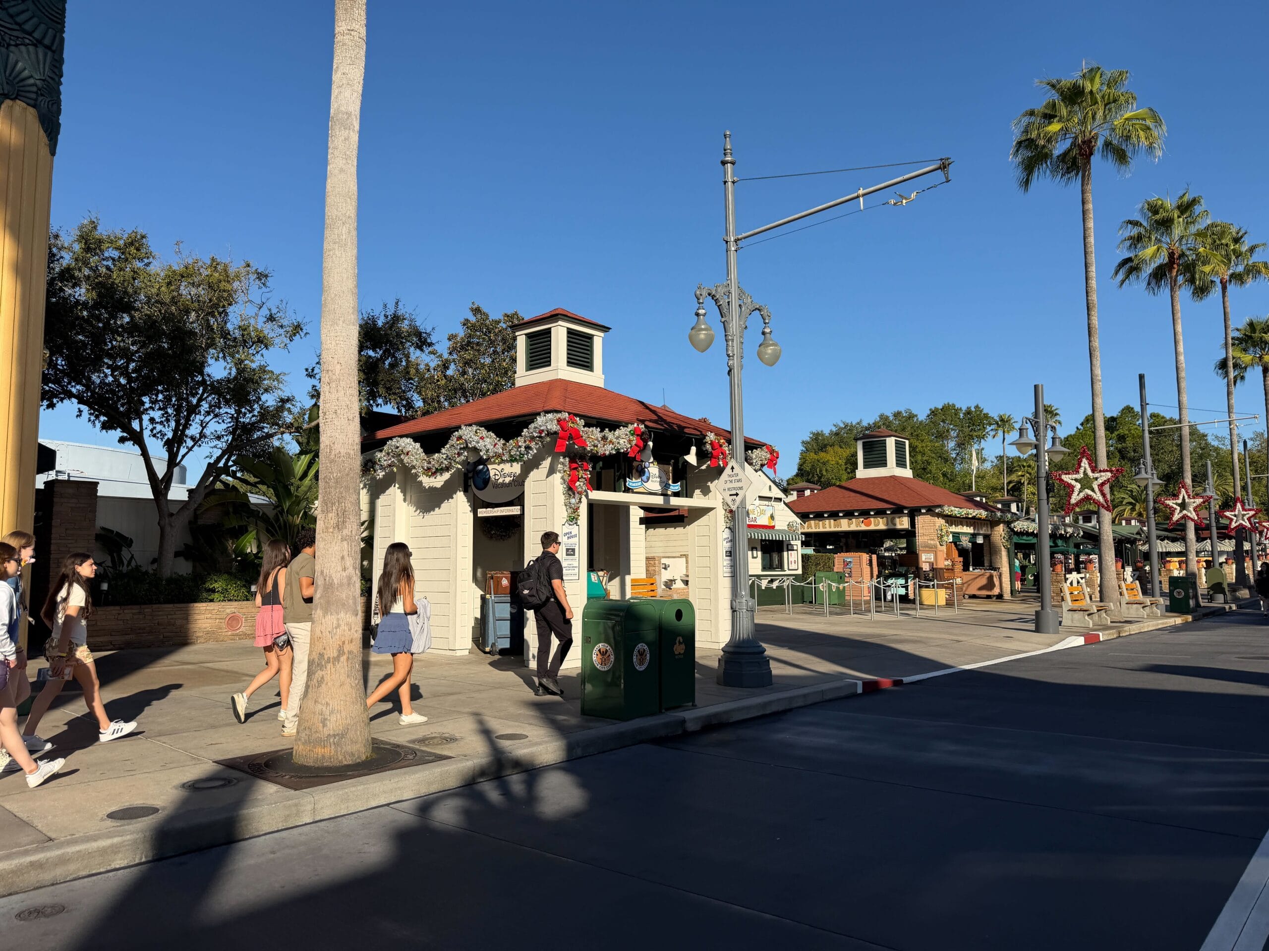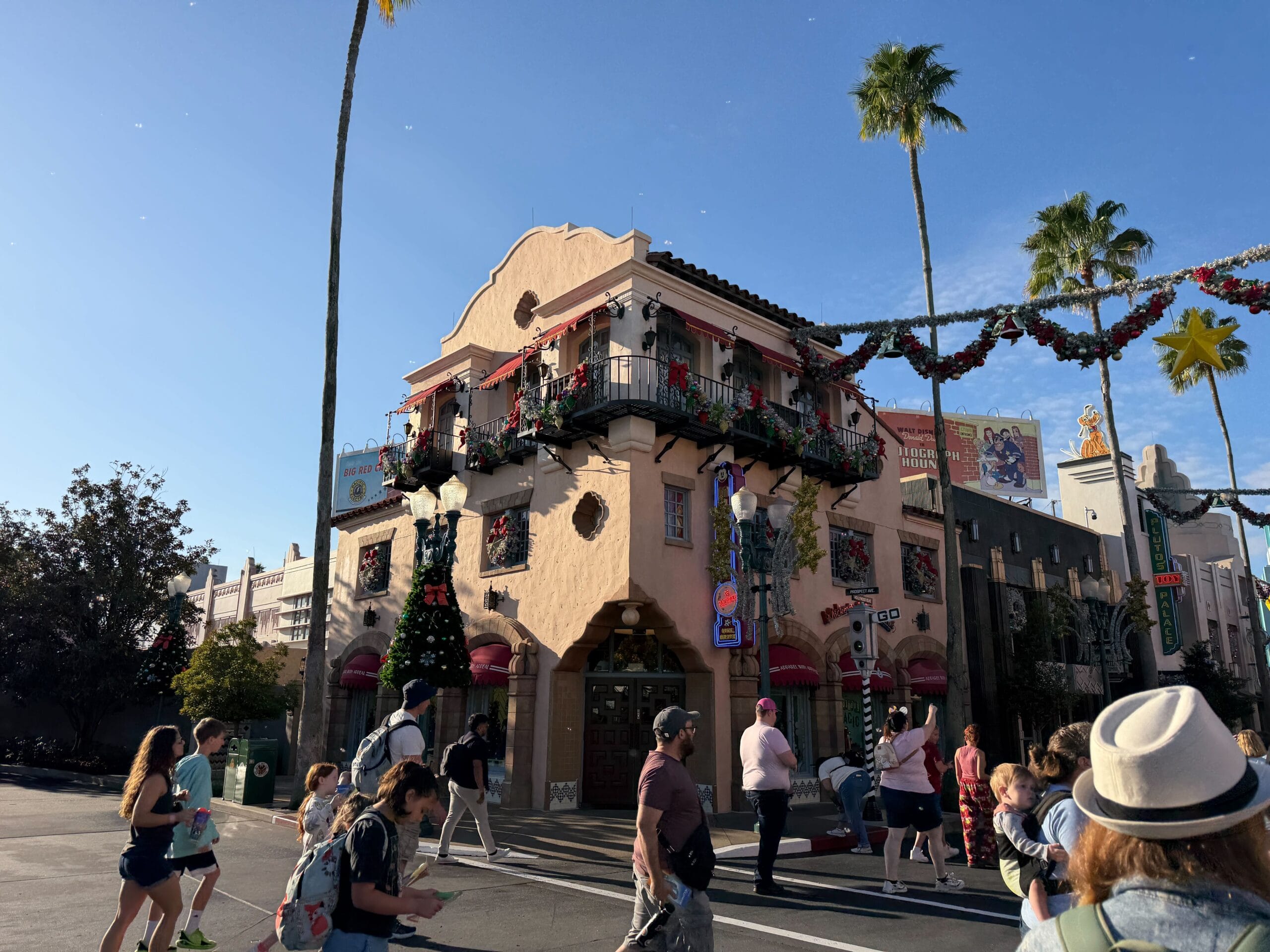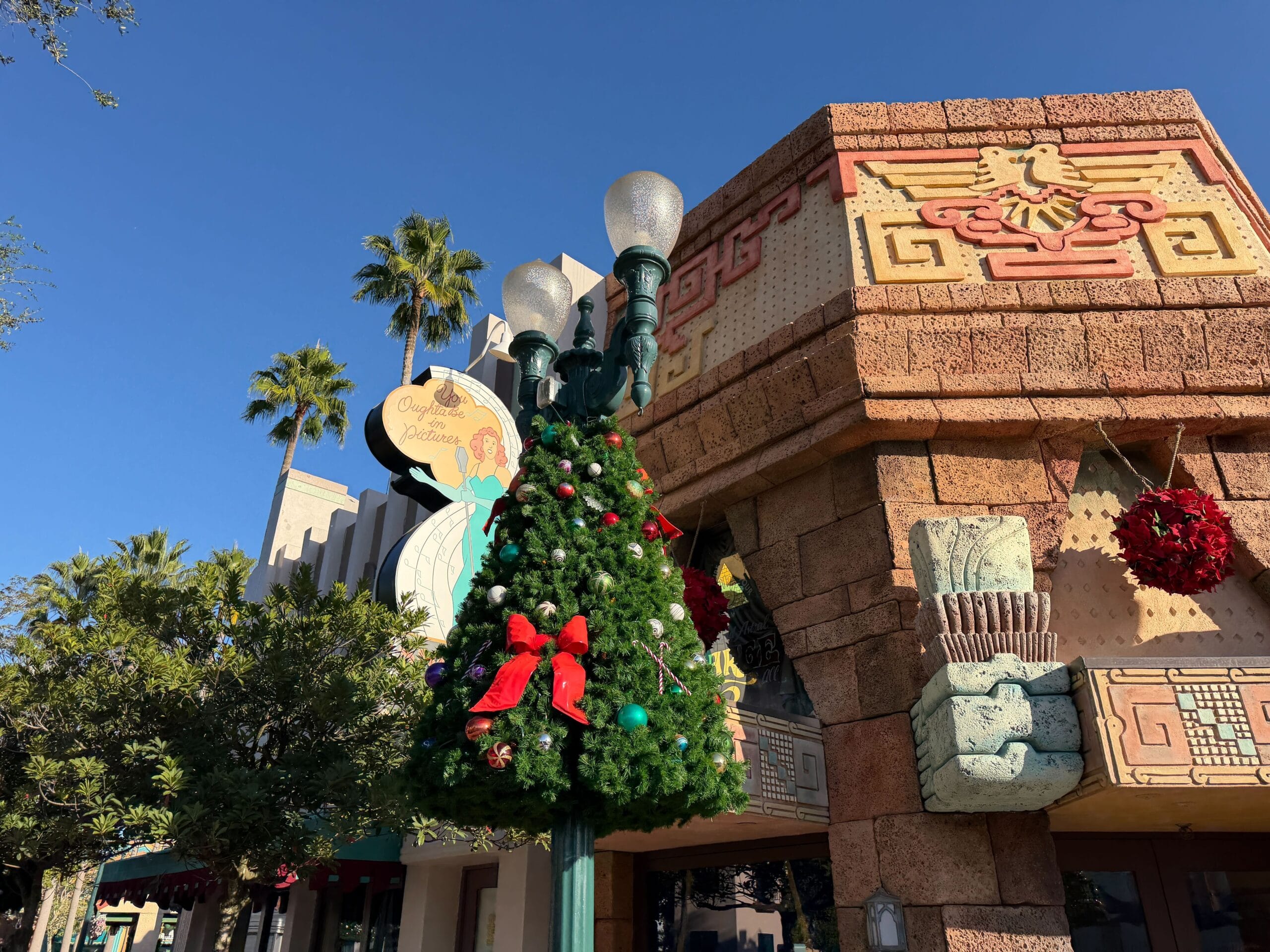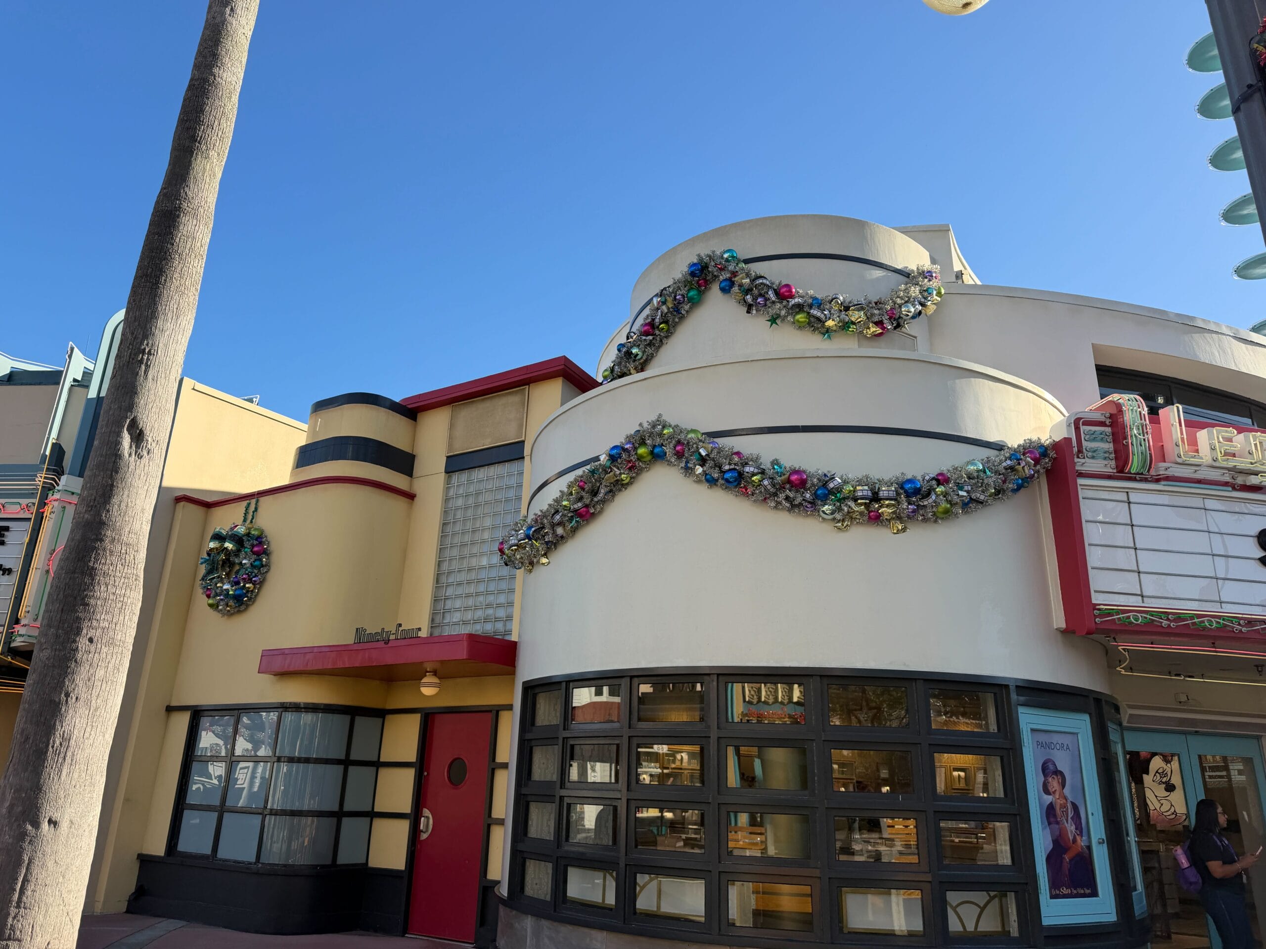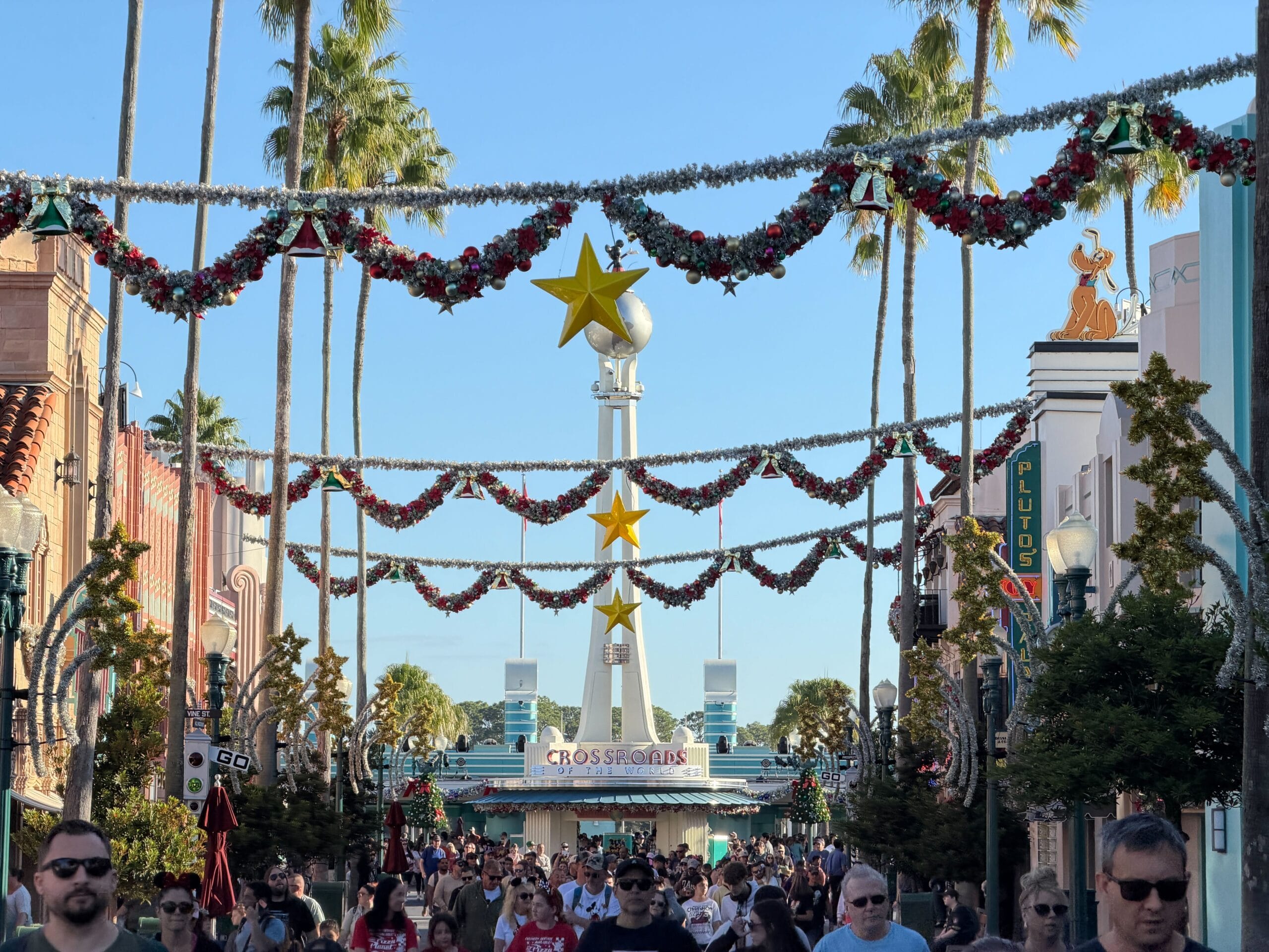 There’s garland everywhere inside the park, too. It lines the Crossroads of the World roof and various shop facades. It also stretches across Hollywood Boulevard above guests heads.