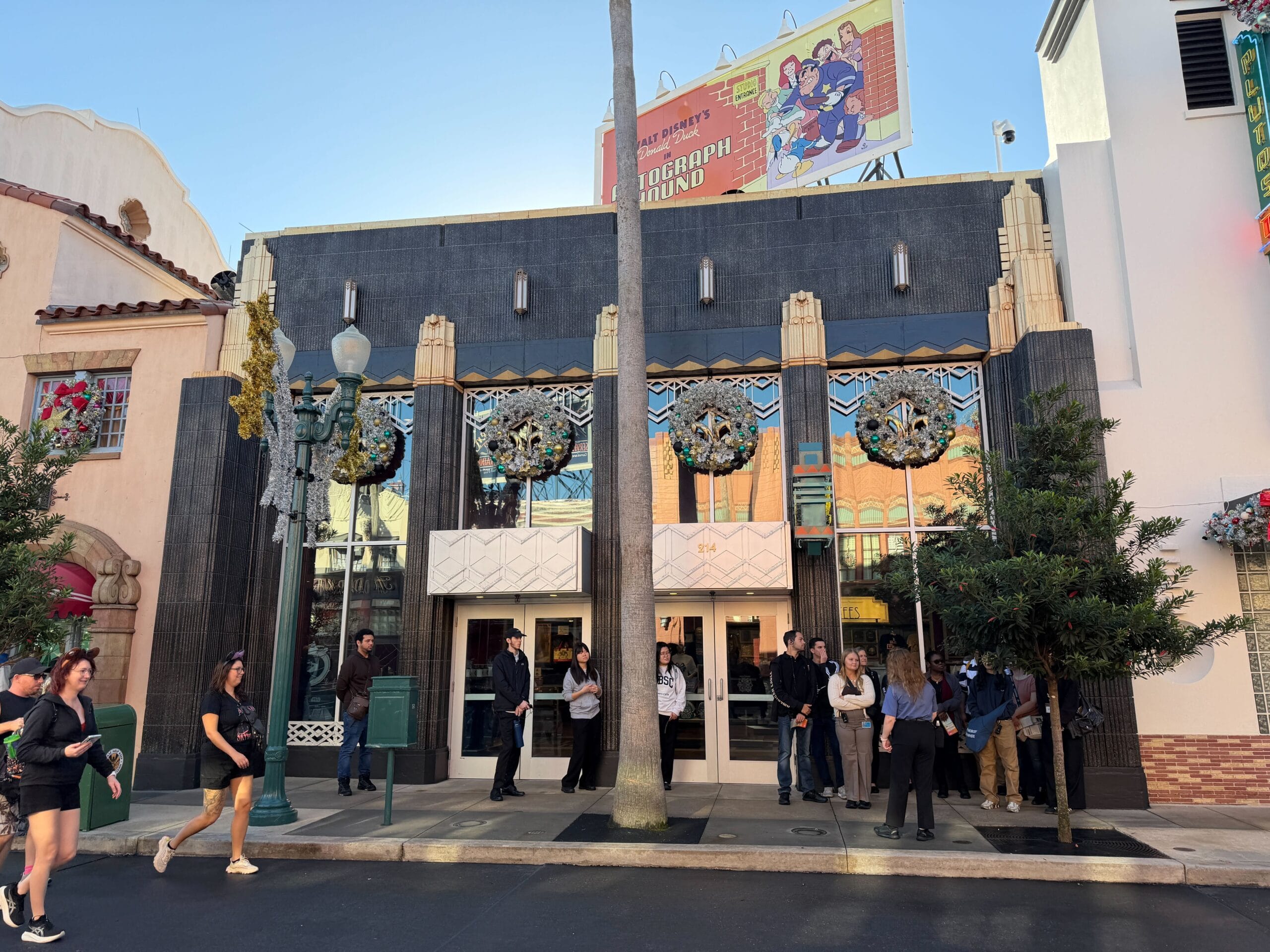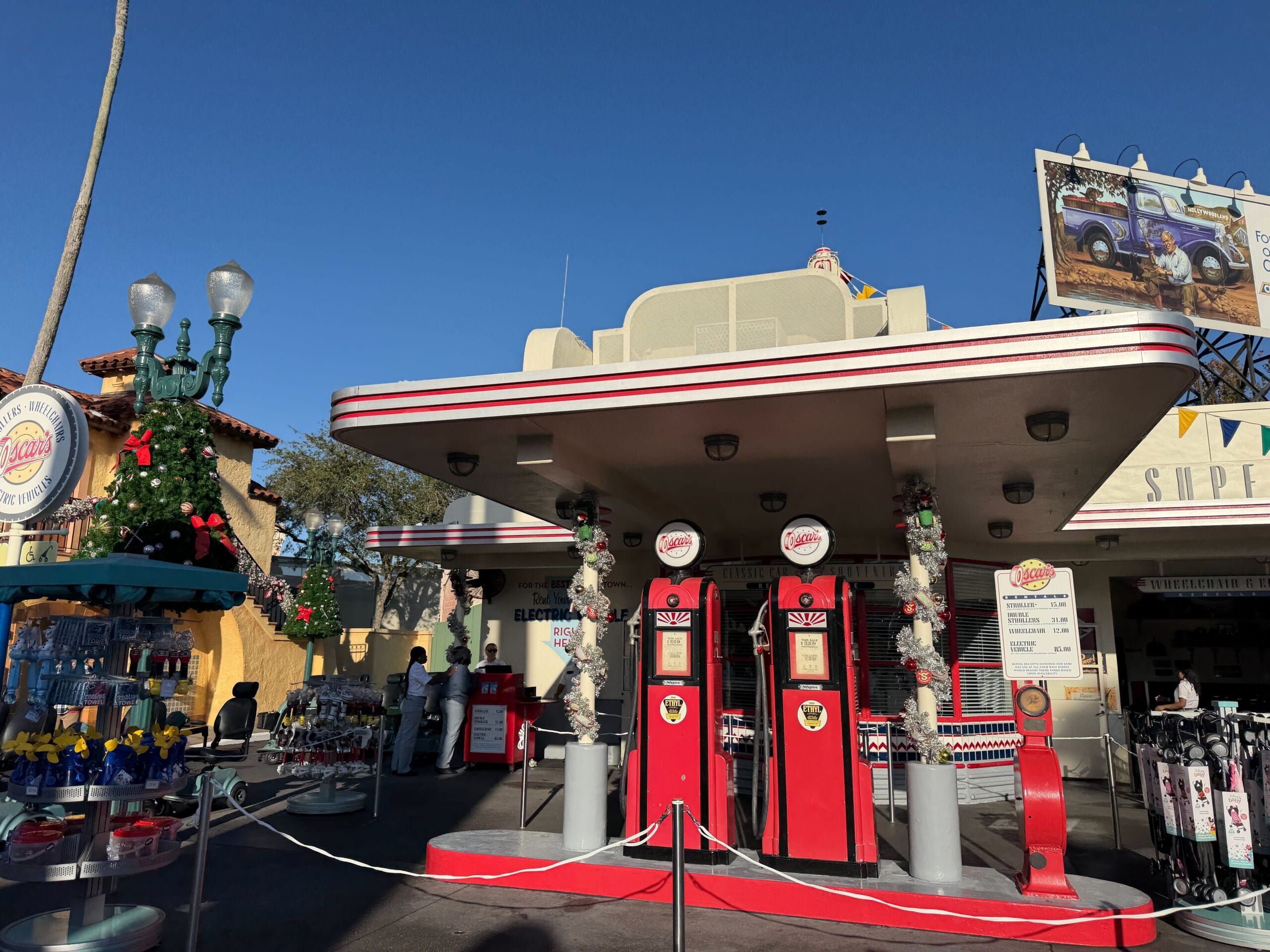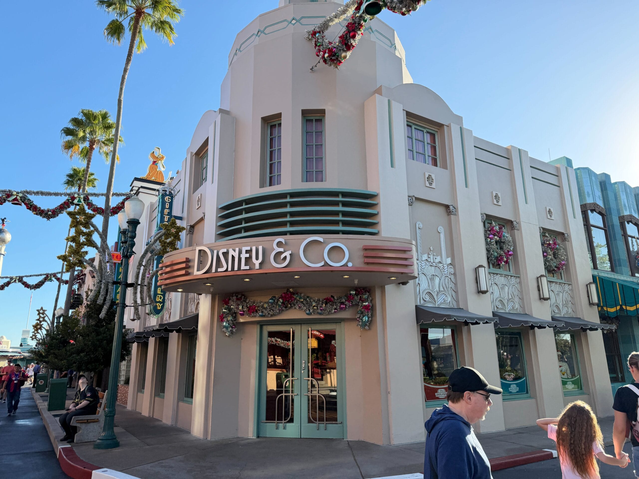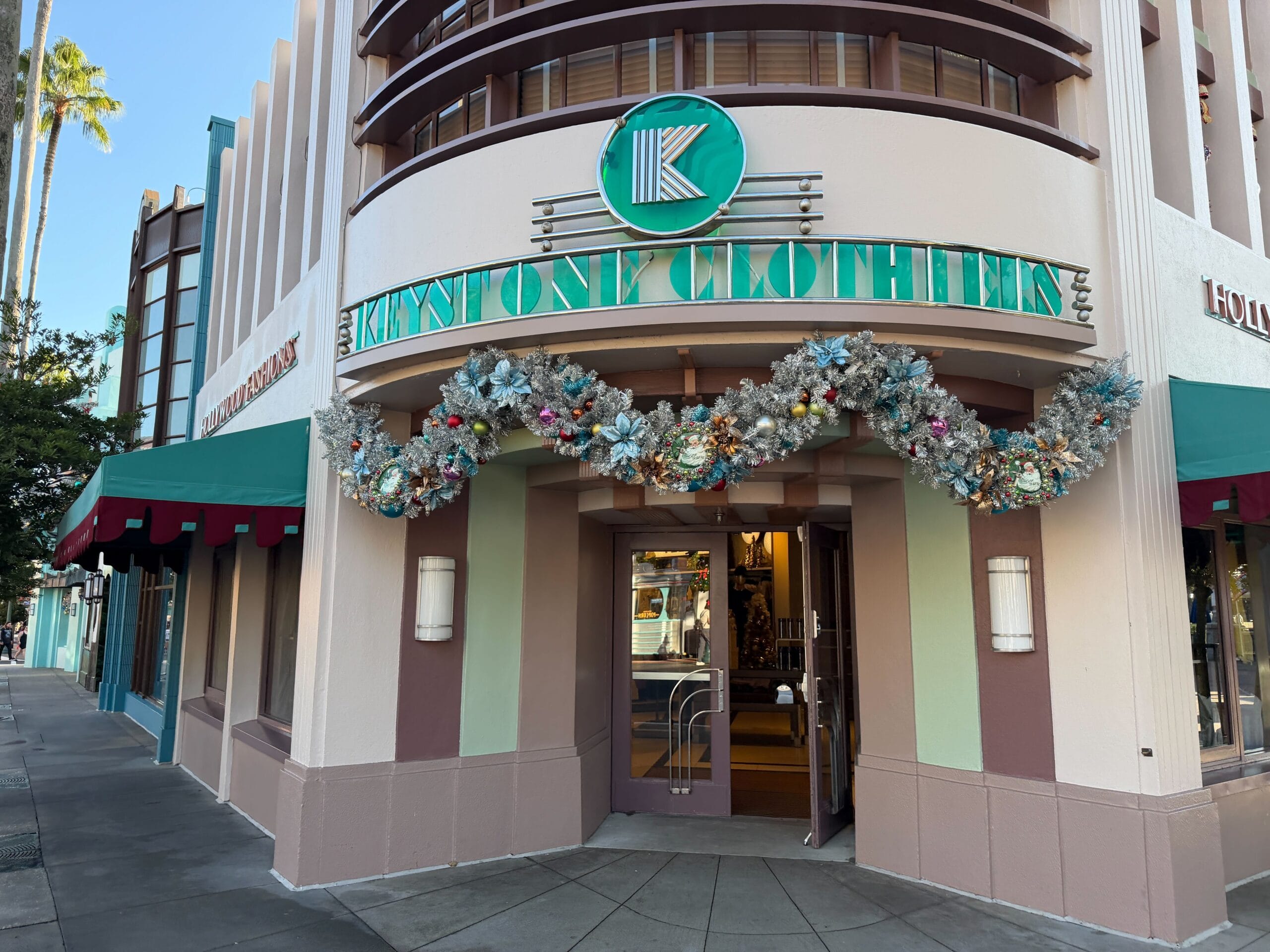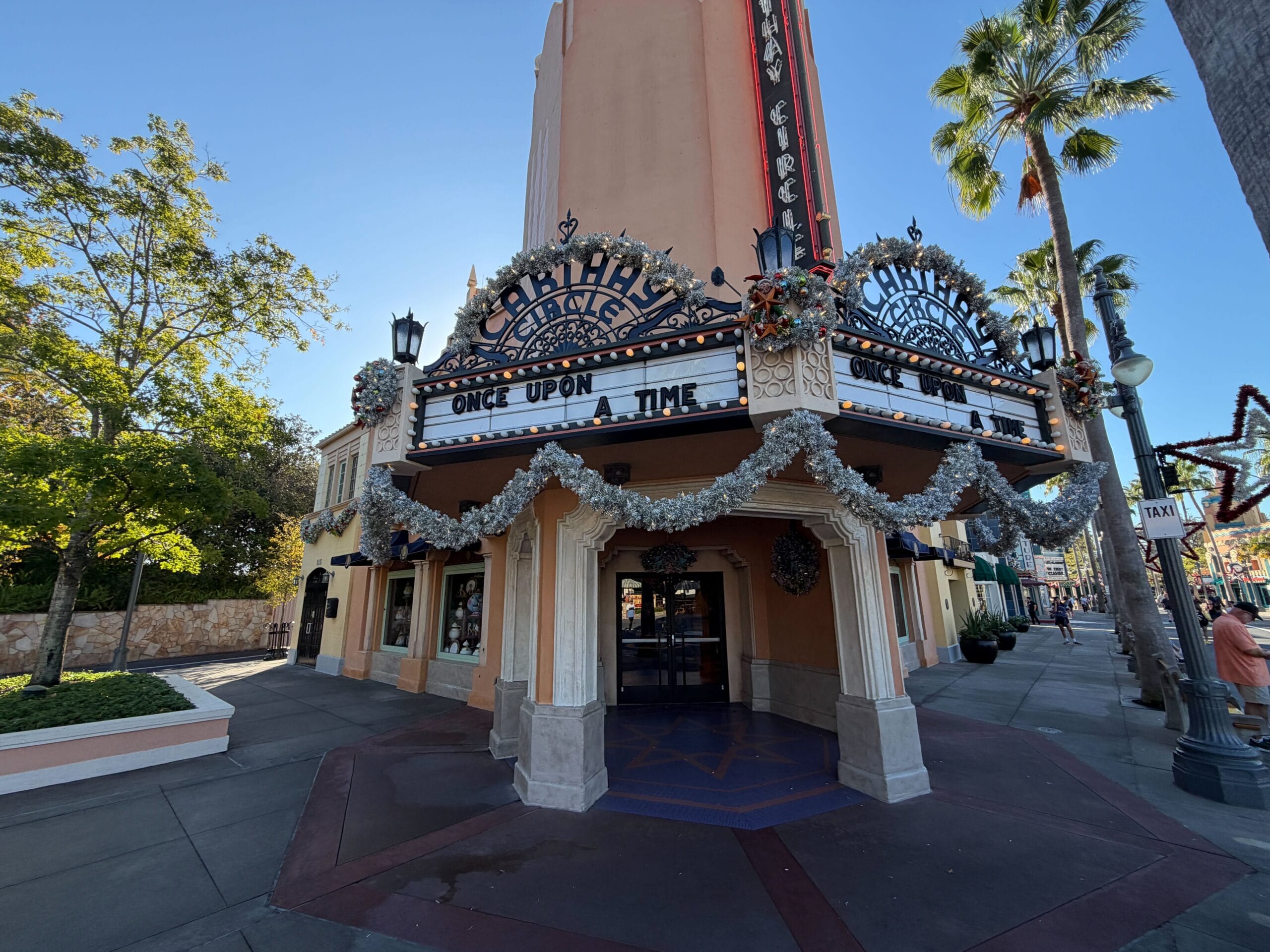 There’s garland everywhere inside the park, too. It lines the Crossroads of the World roof and various shop facades. It also stretches across Hollywood Boulevard above guests heads.