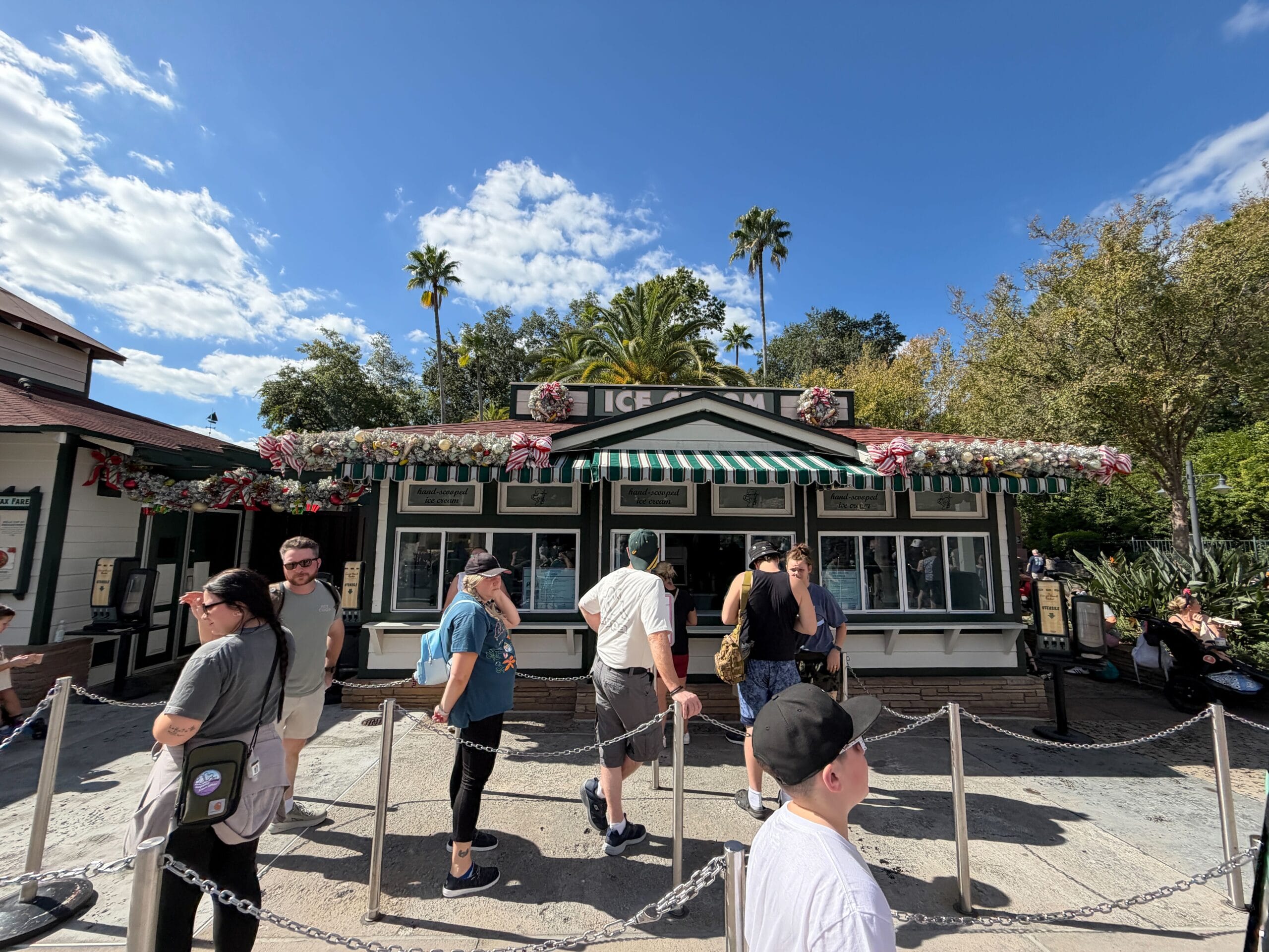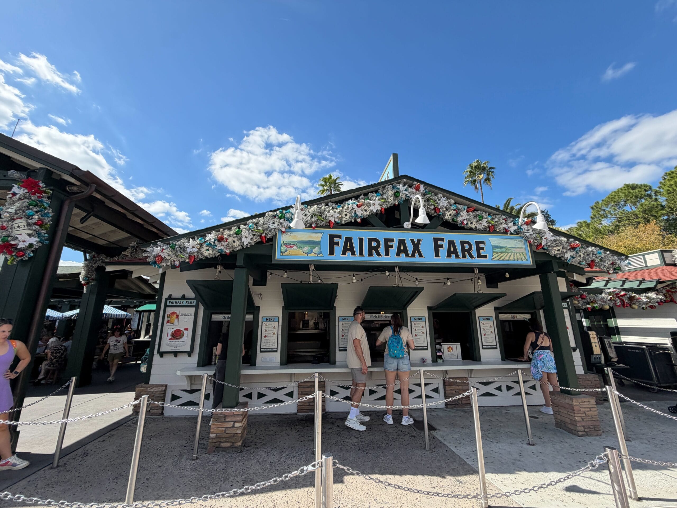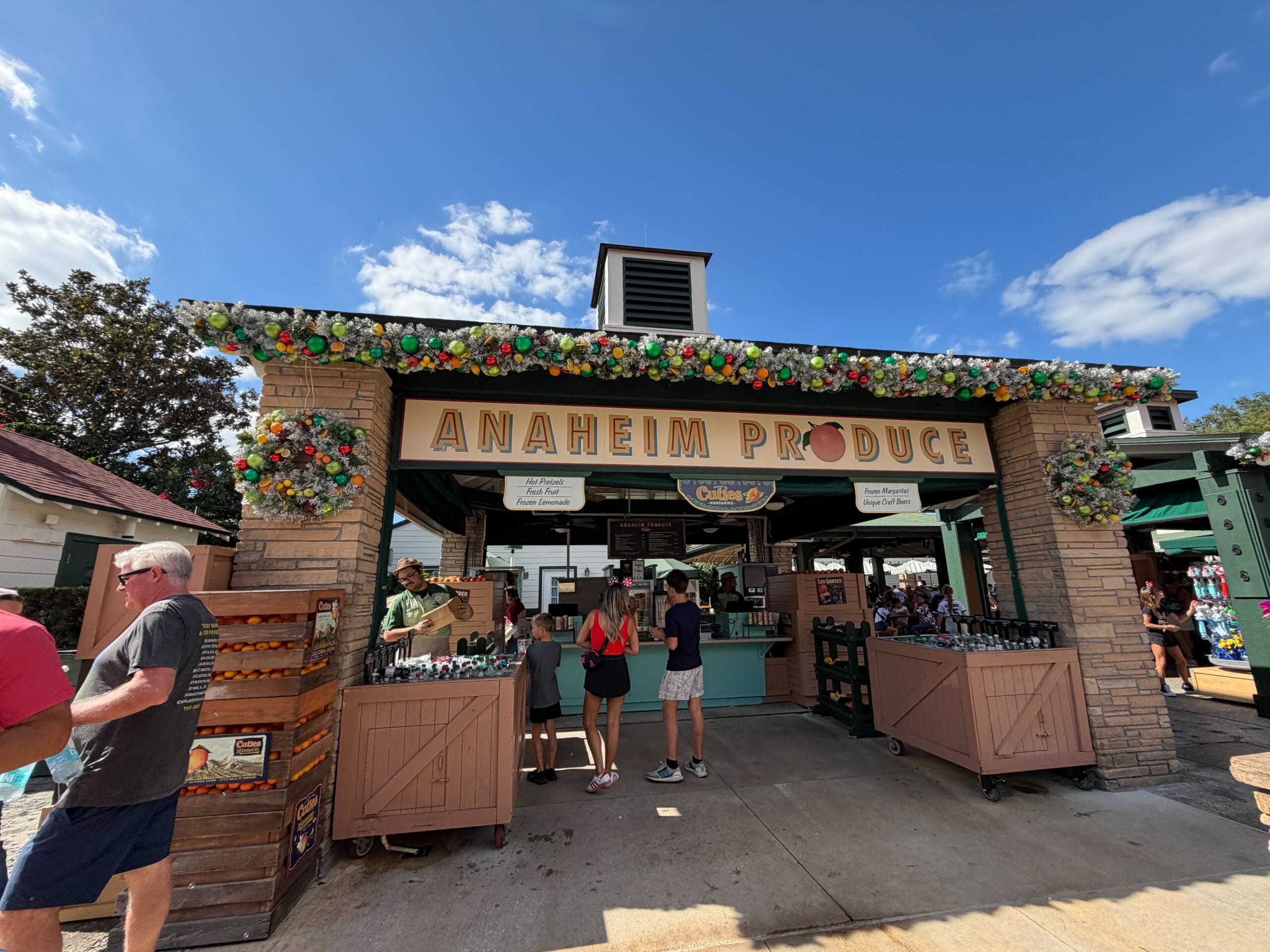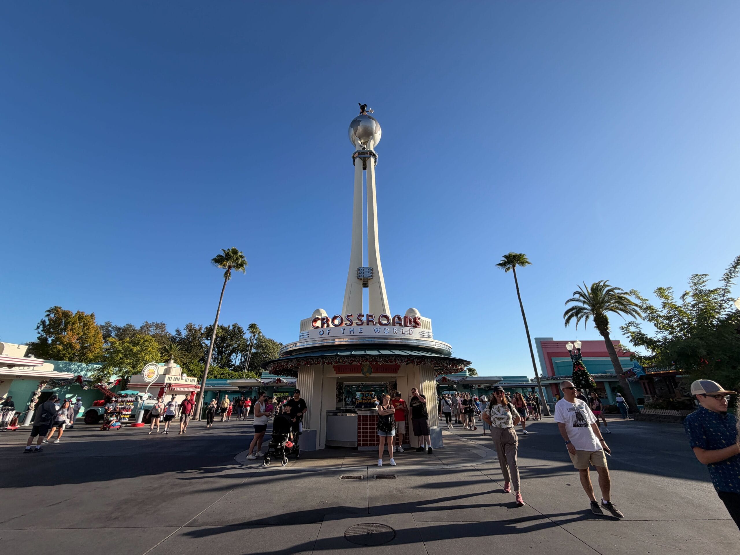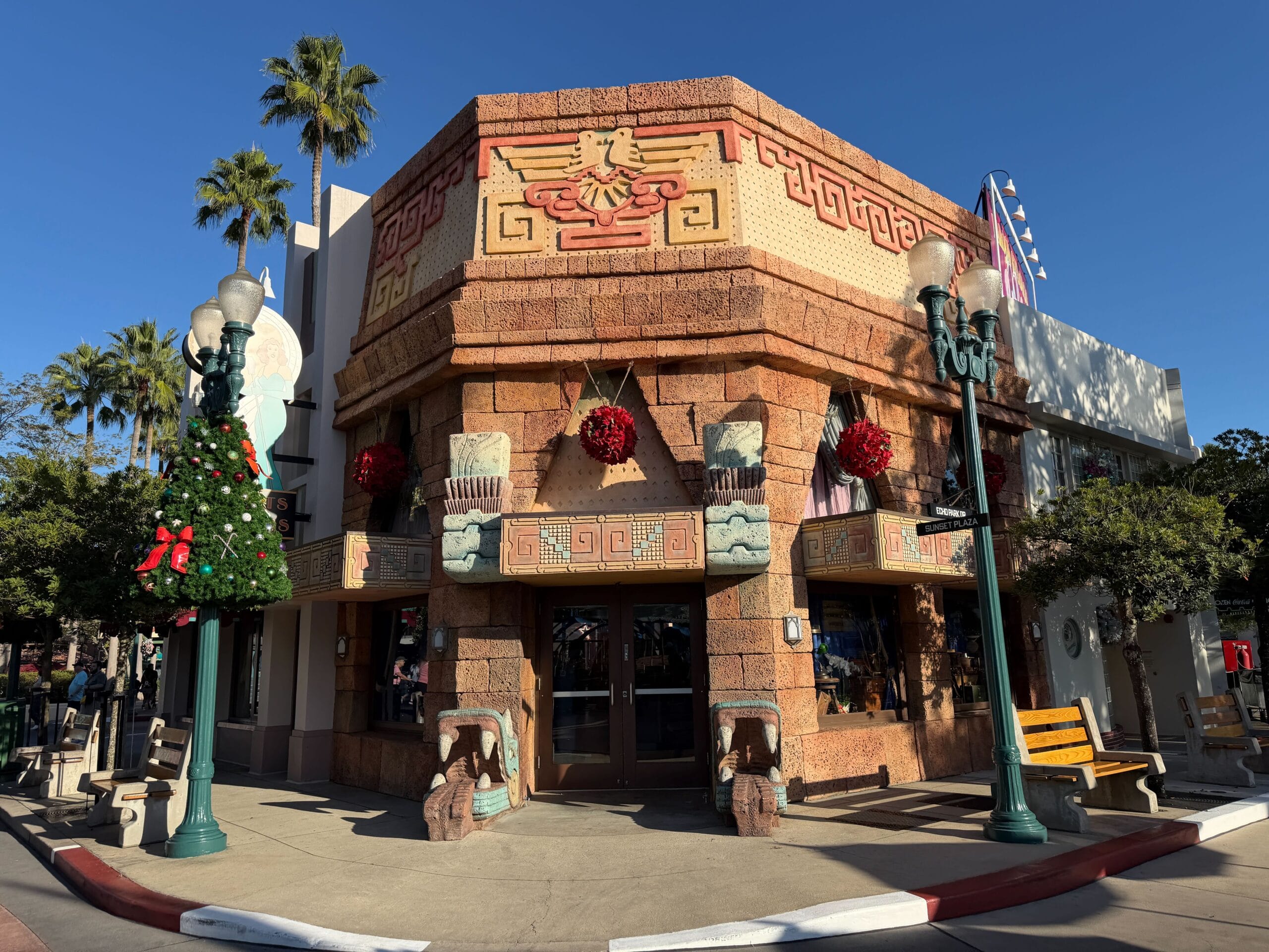 There’s garland everywhere inside the park, too. It lines the Crossroads of the World roof and various shop facades. It also stretches across Hollywood Boulevard above guests heads.