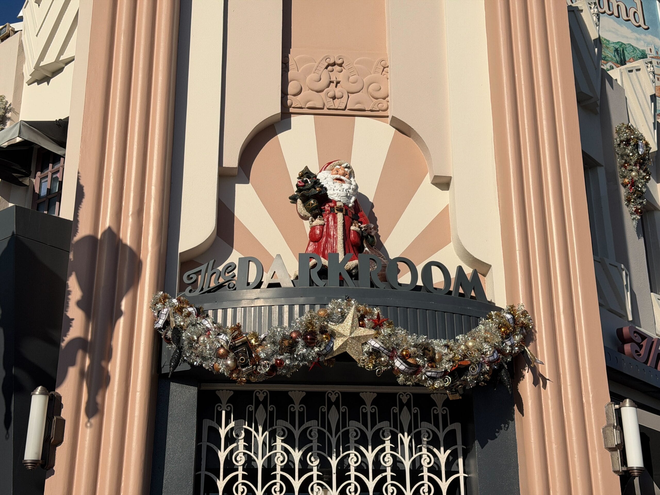 A Santa Claus figure is on The Darkroom marquee. The silver garland across the marquee is adorned with vintage-style cameras and film strip ribbons.