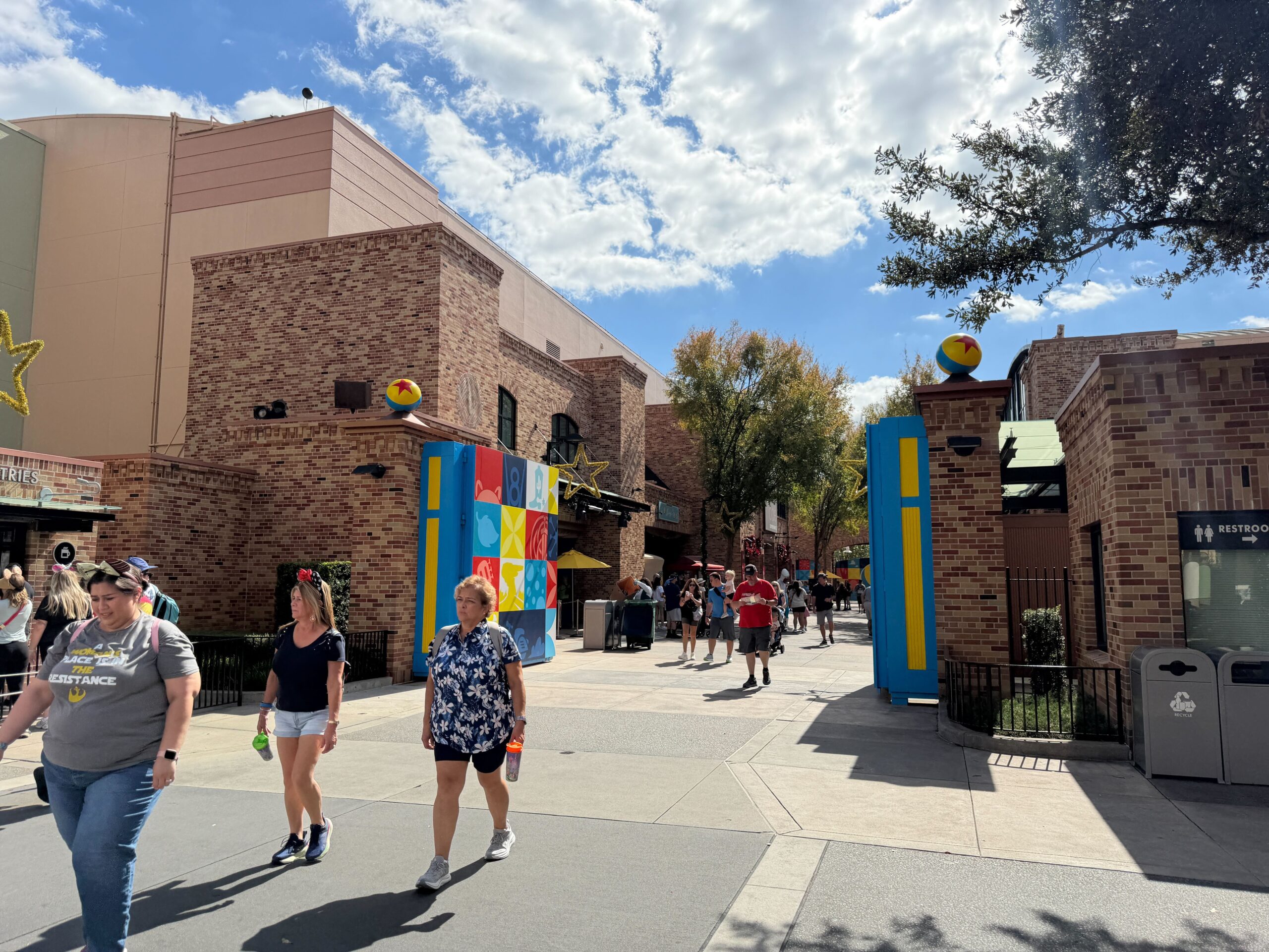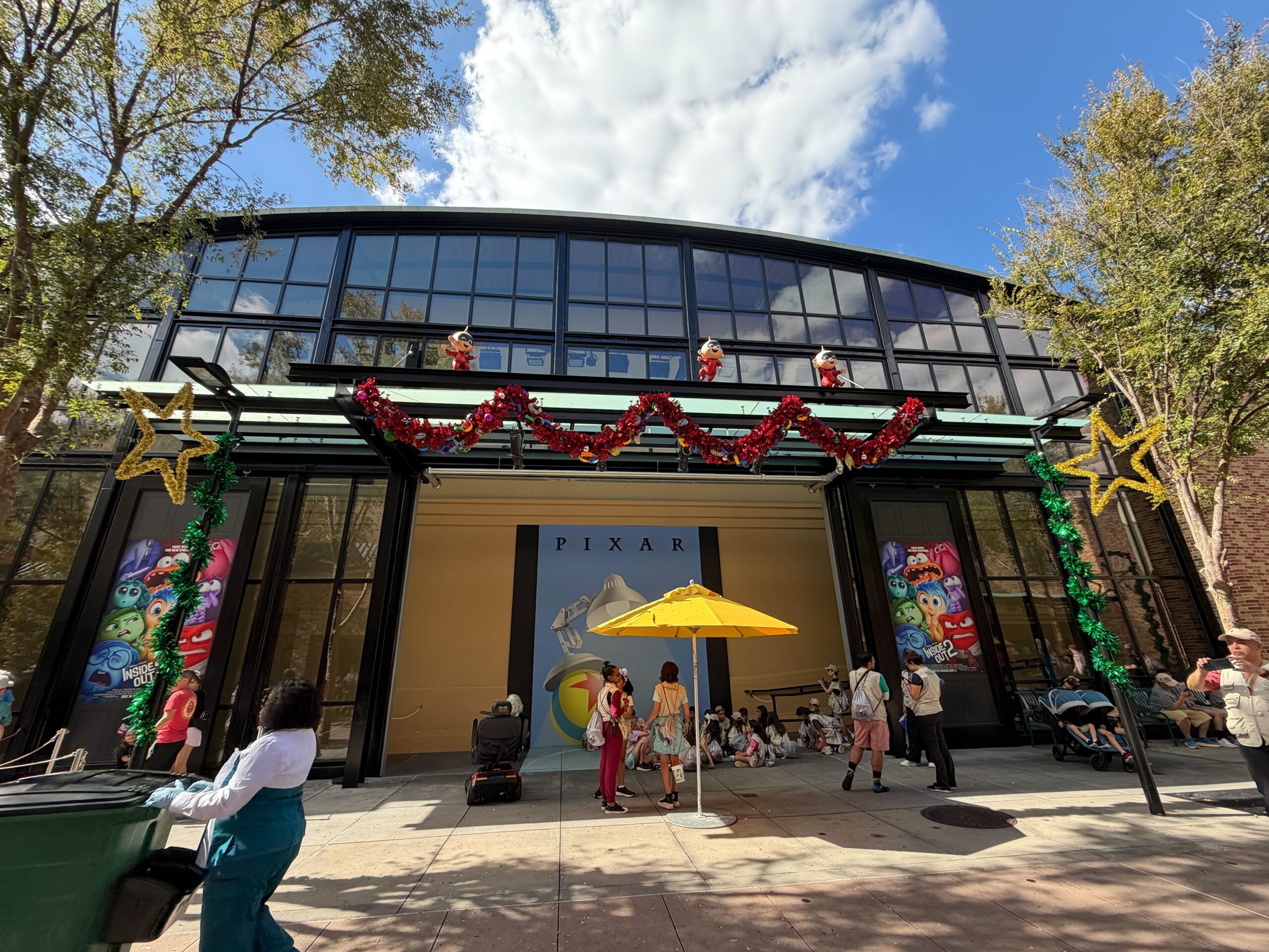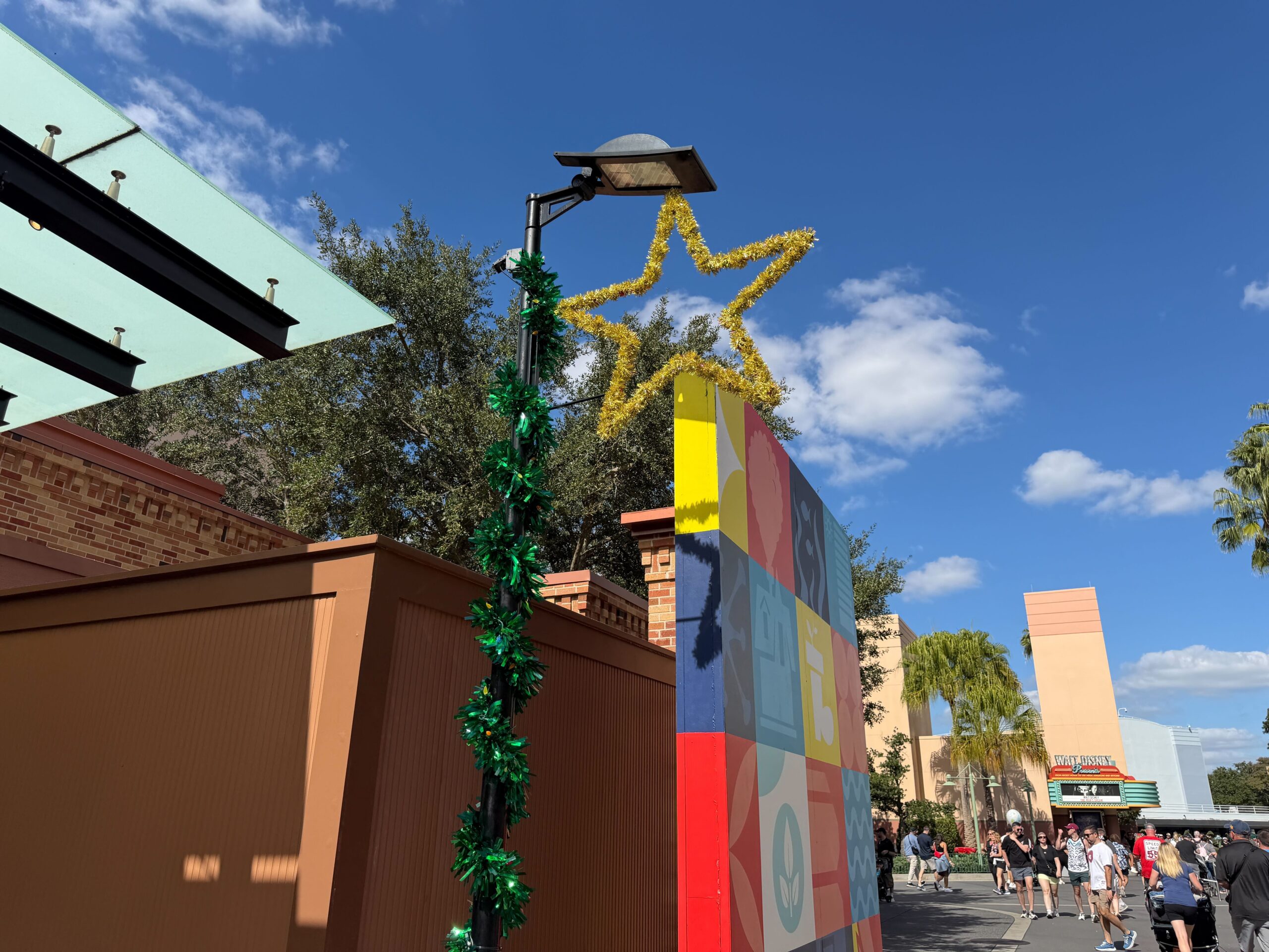 Pixar Place is also ready for the holidays. Lampposts are wrapped in green tinsel and golden tinsel stars hang below the lights.