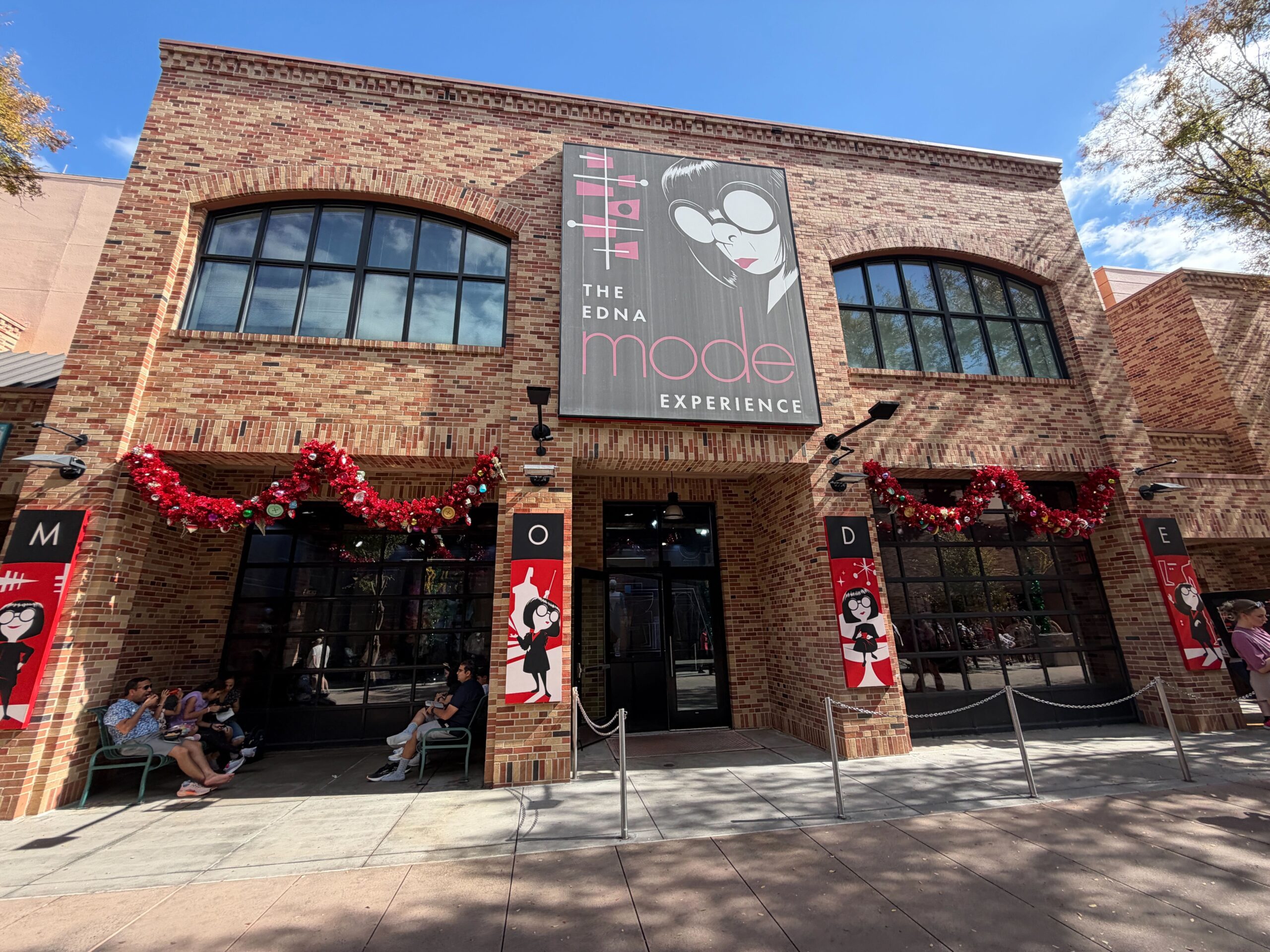 The Edna Mode Experience is adorned with red garland. Strings of buttons and ornaments run through it.
