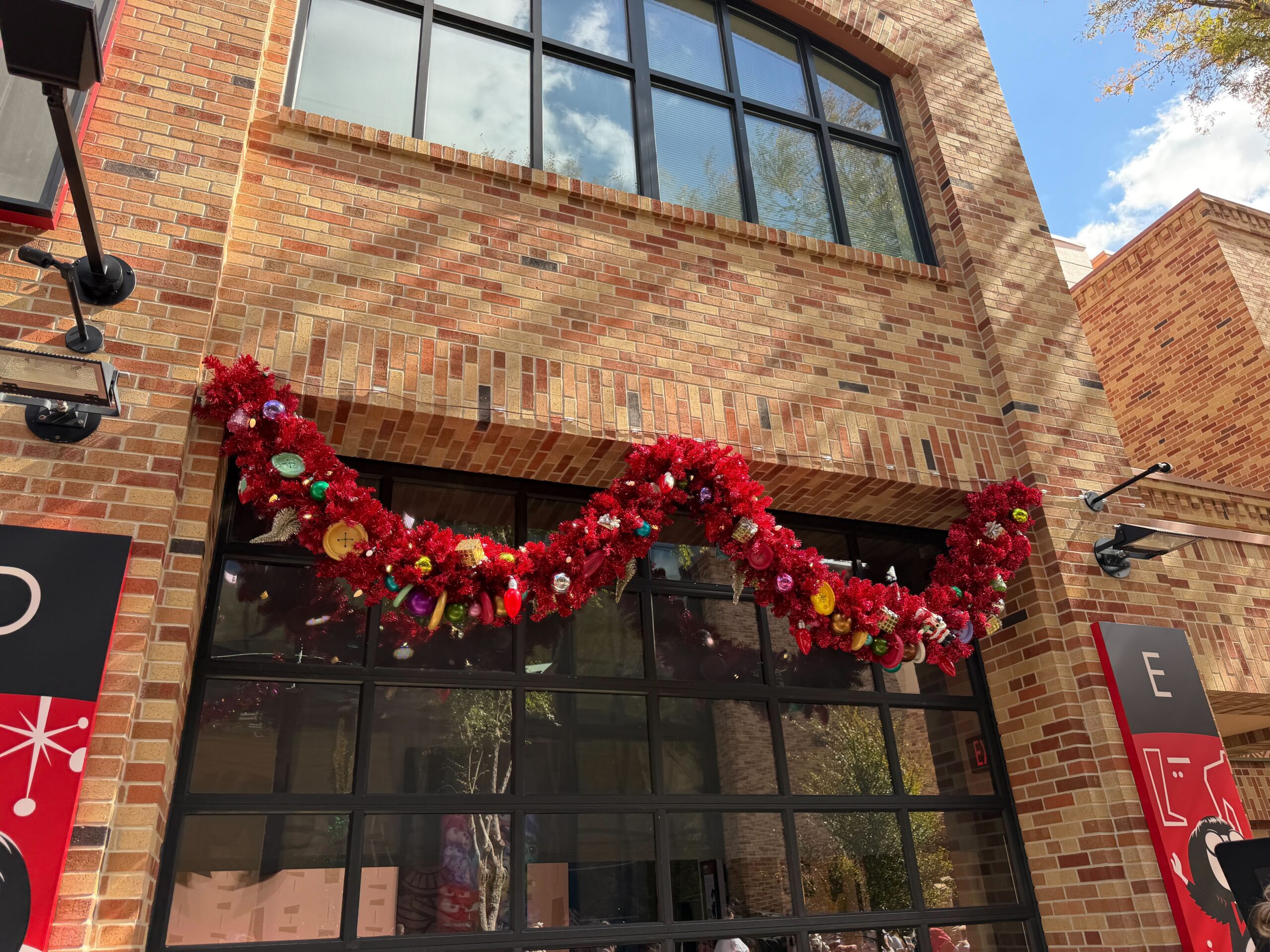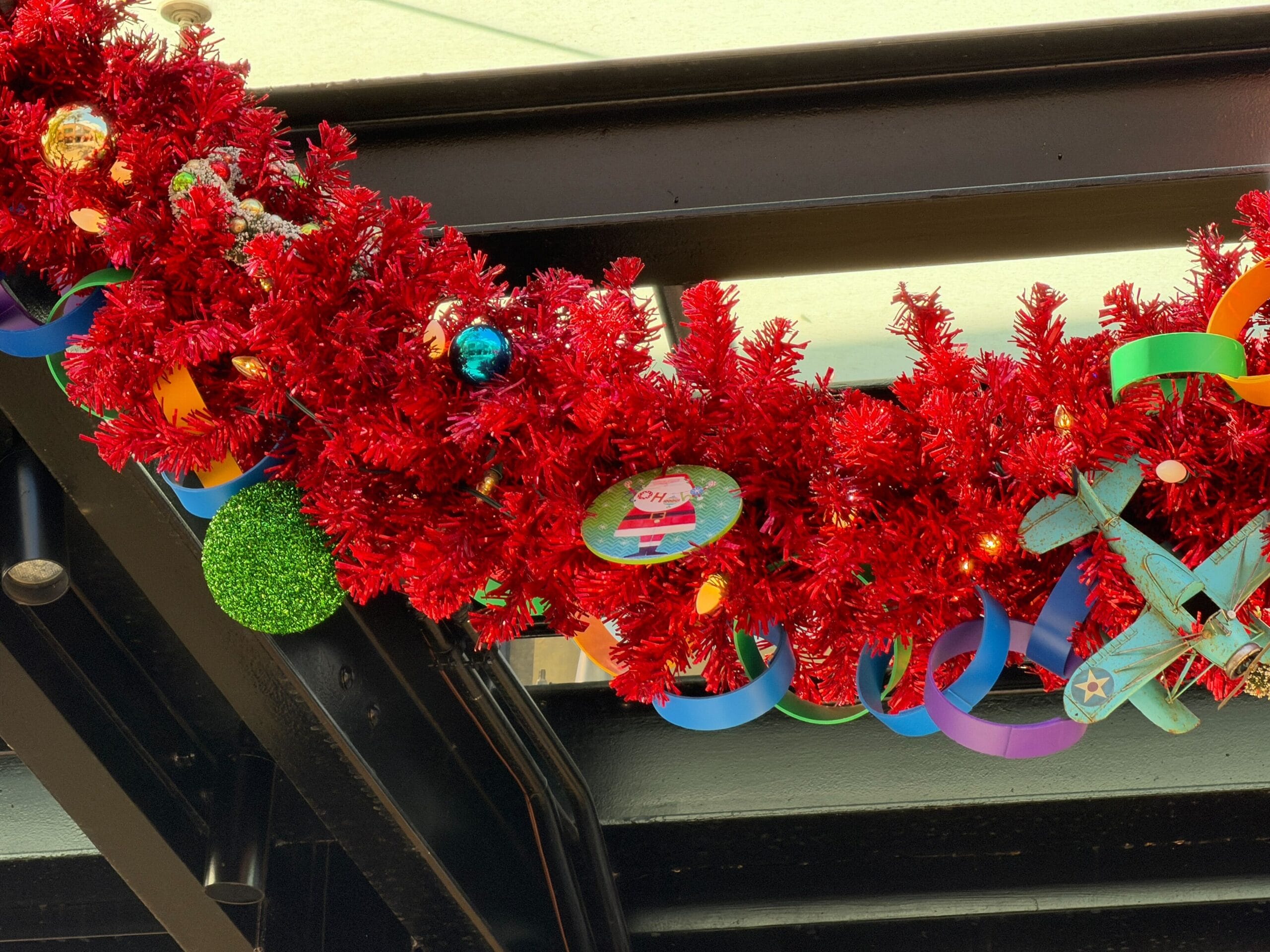 The garlands on Ticket Central at the end of the street feature poinsettias. Wreaths have retro Santa Claus decorations in their centers.