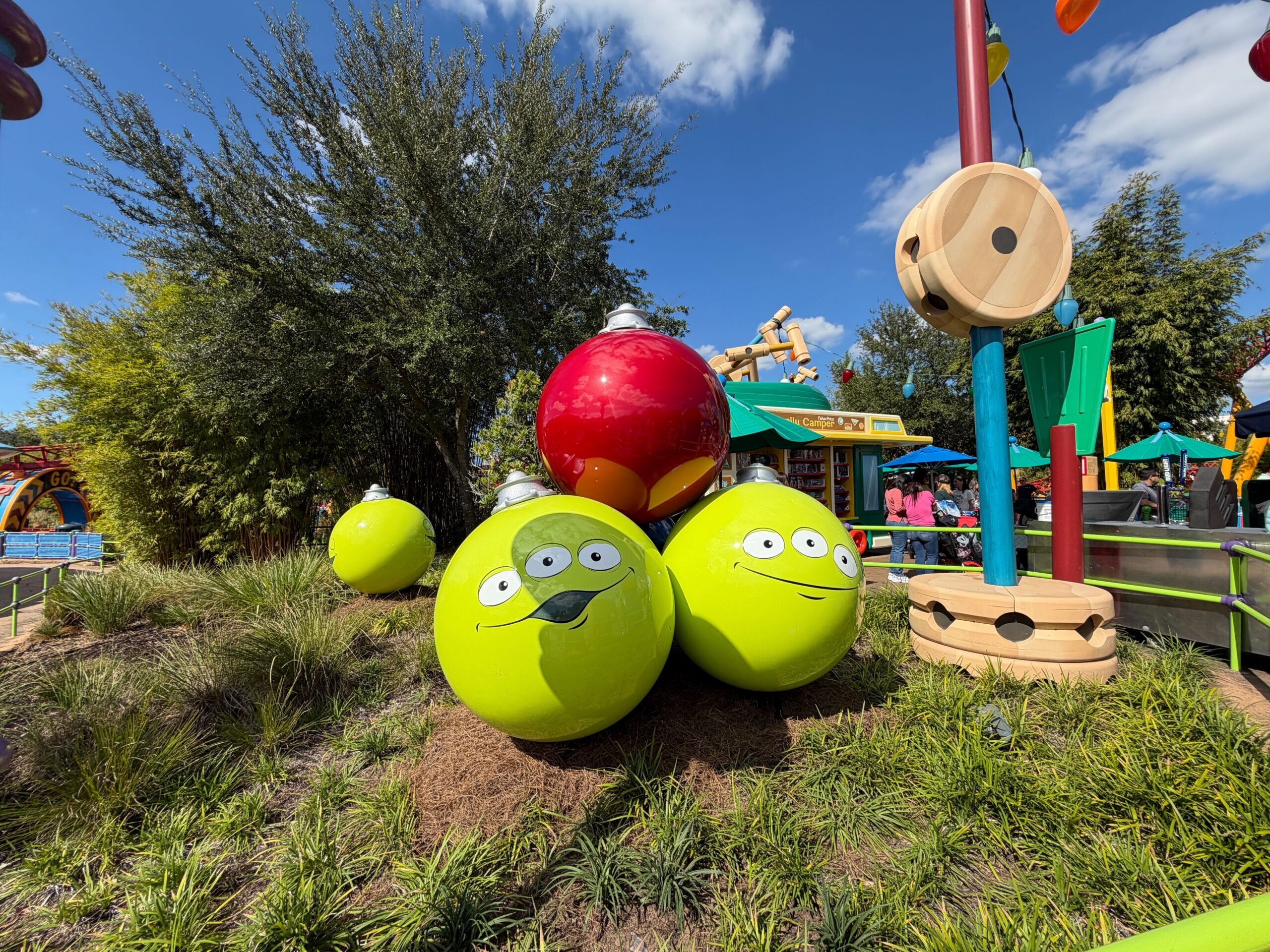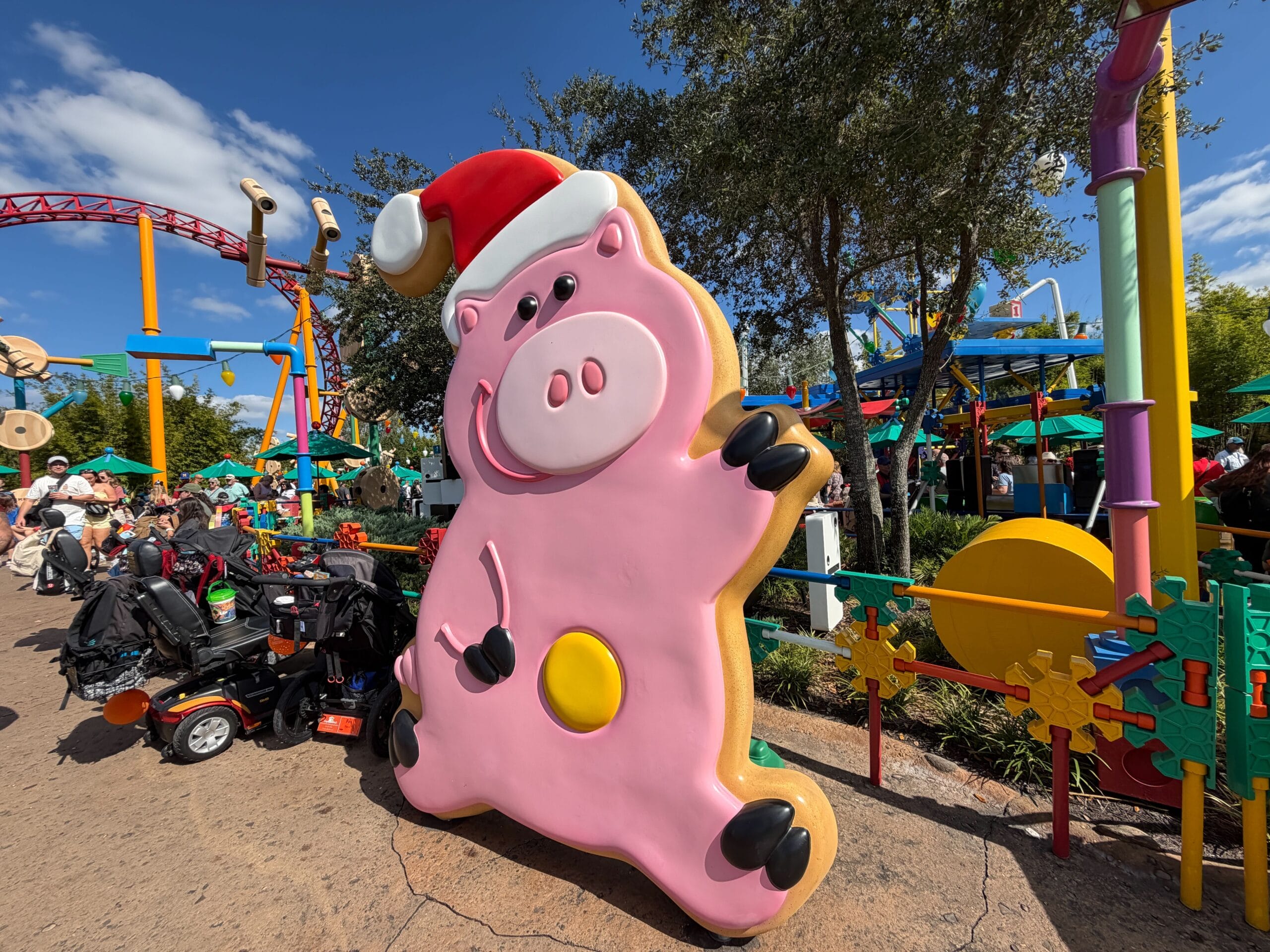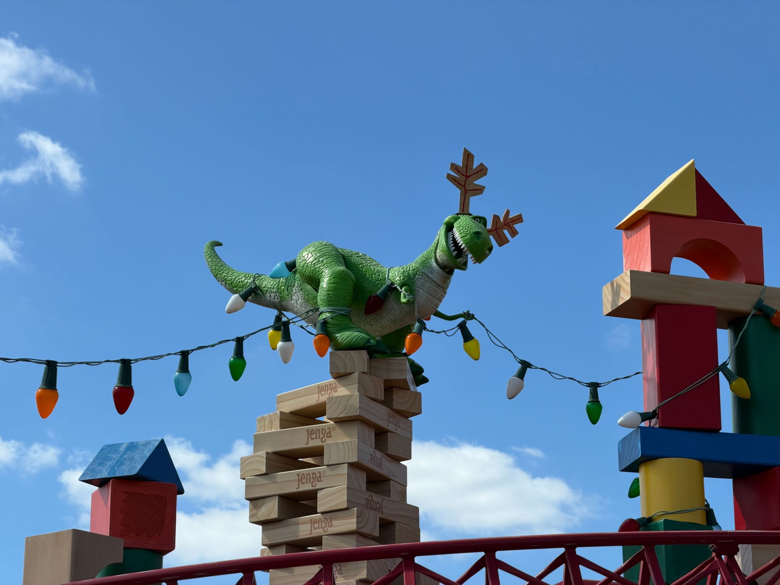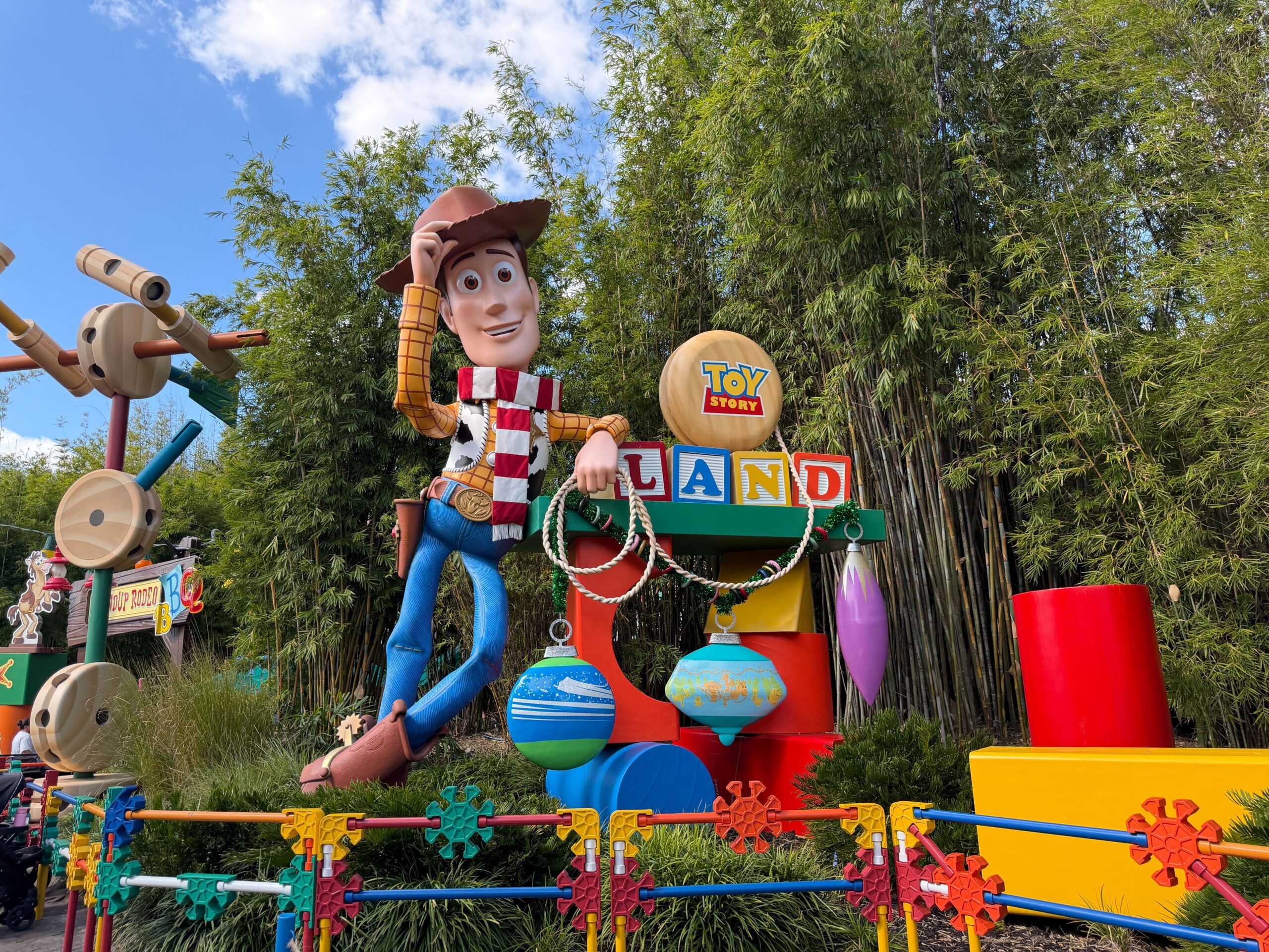 Over at Toy Story Land, the giant Woody statue now wears a red and white scarf. Large ornaments hang from garland below the Toy Story Land sign.
