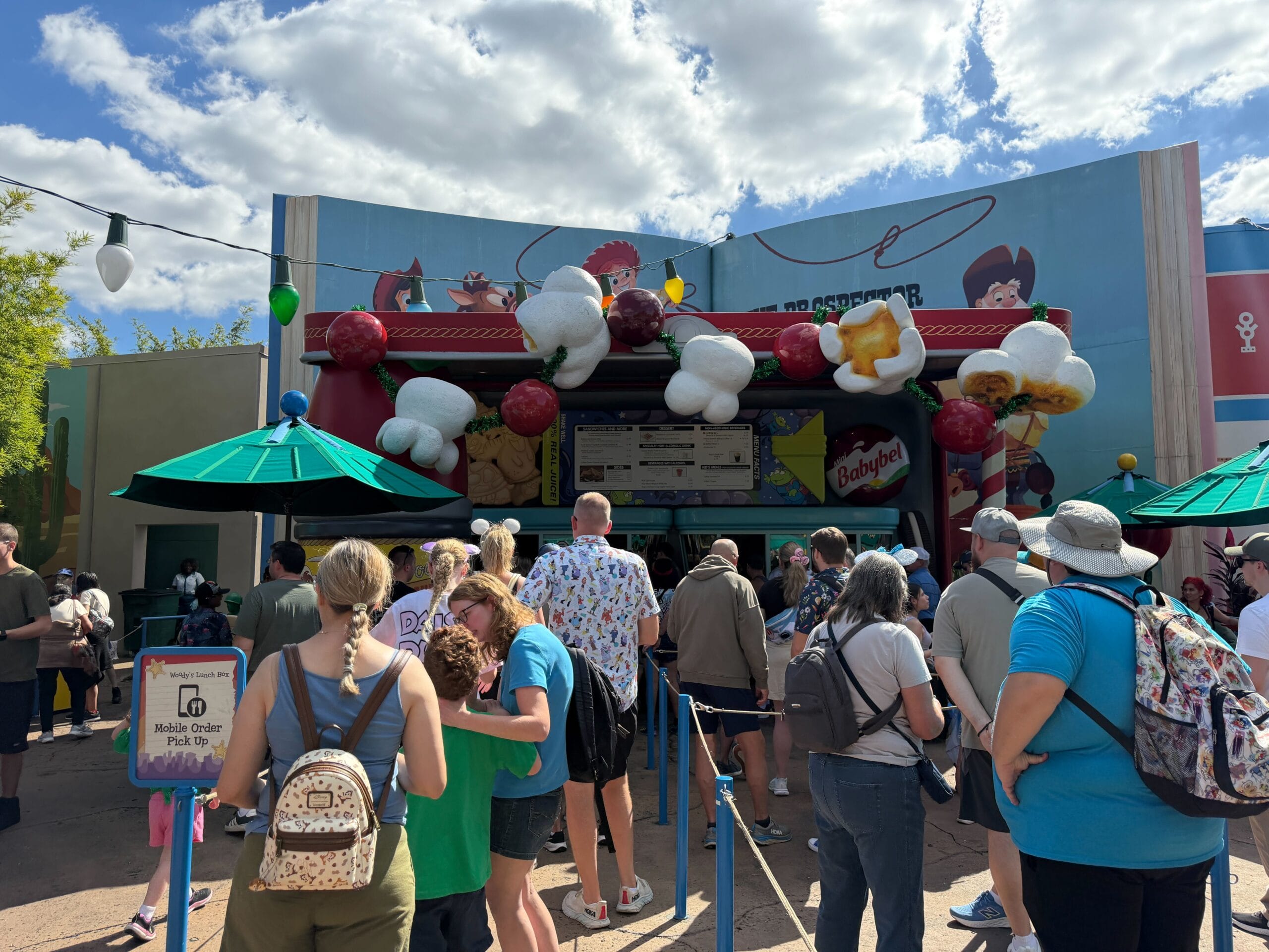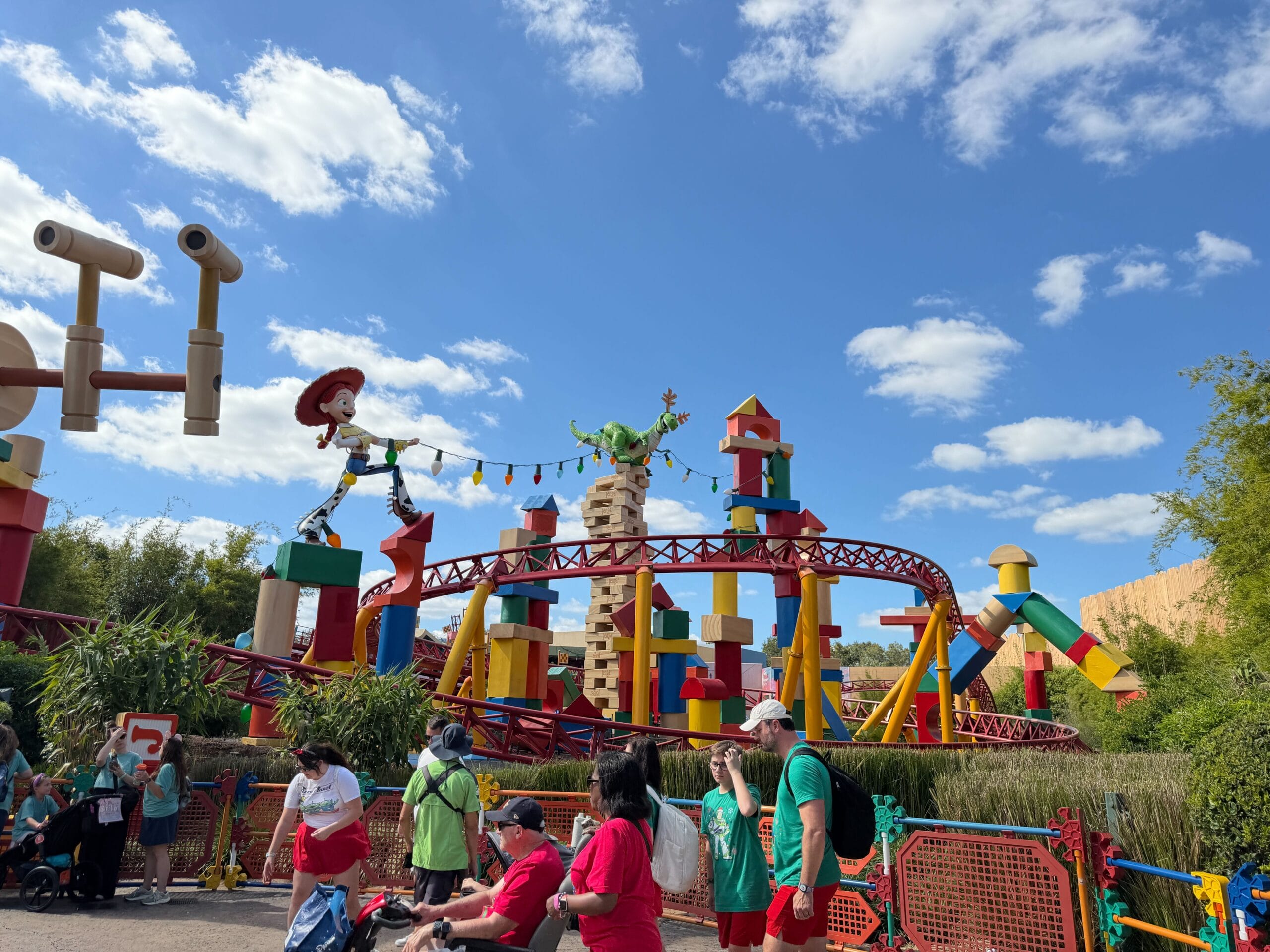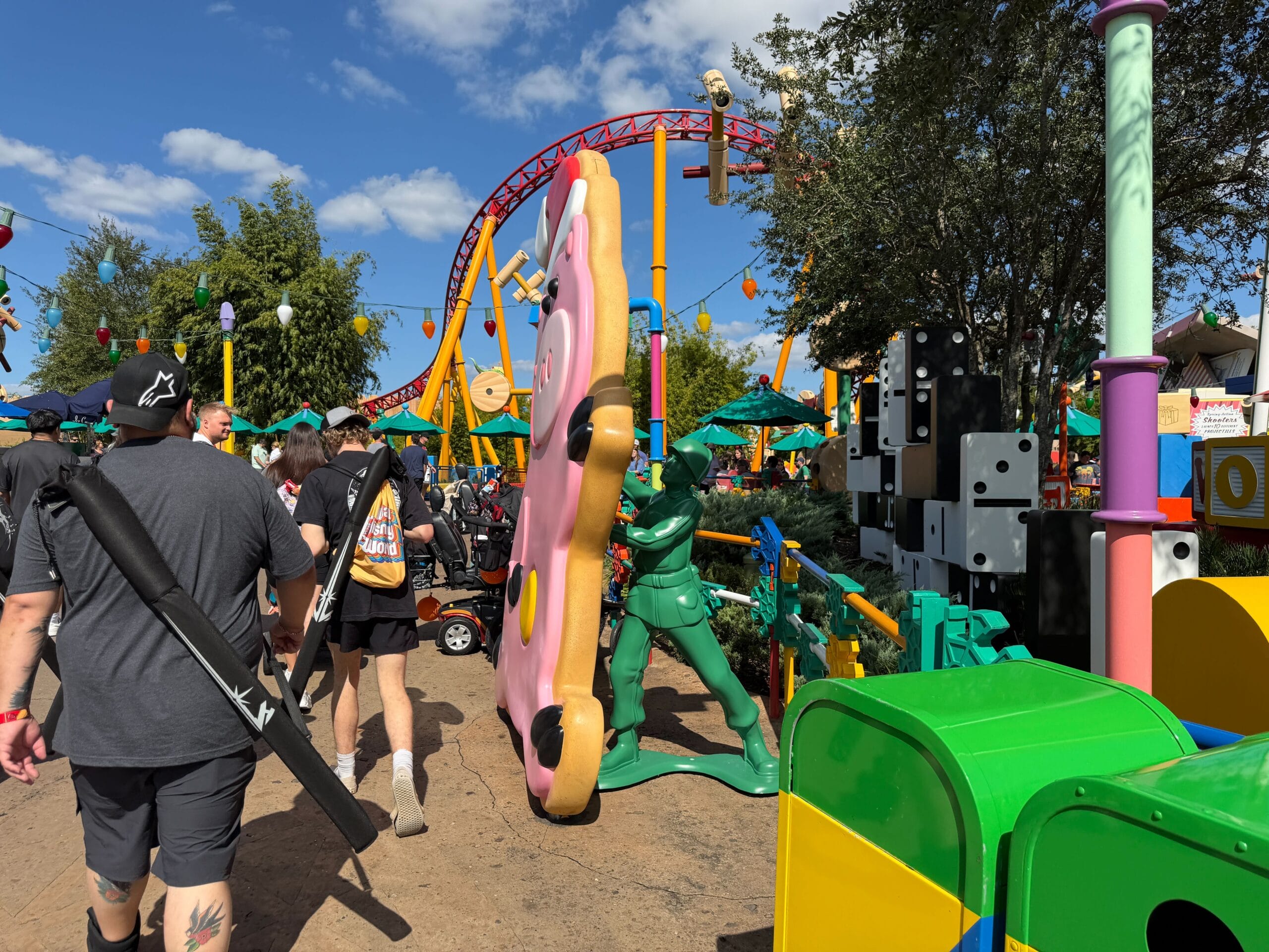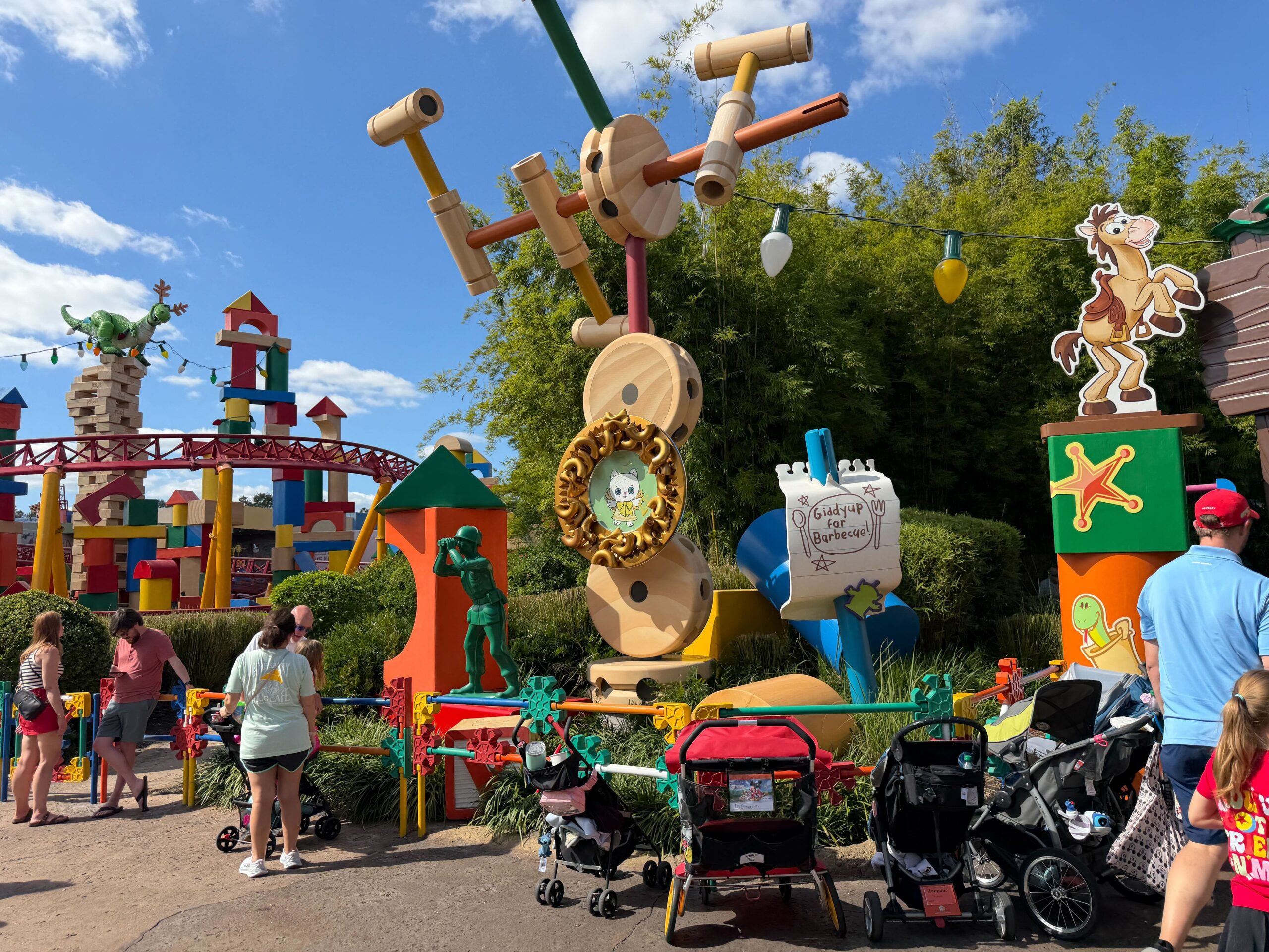 Over at Toy Story Land, the giant Woody statue now wears a red and white scarf. Large ornaments hang from garland below the Toy Story Land sign.