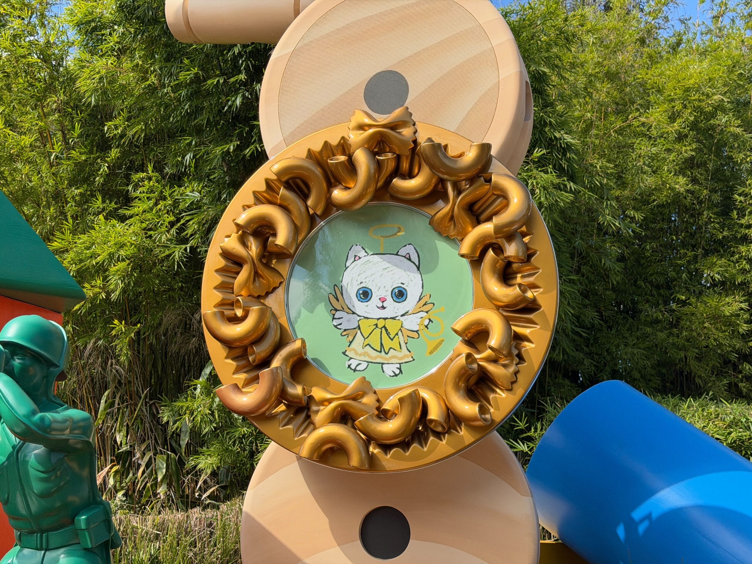Outside the entrance to Roundup Rodeo BBQ is a macaroni art medallion with artwork of Angel Kitty from Toy Story That Time Forgot.
