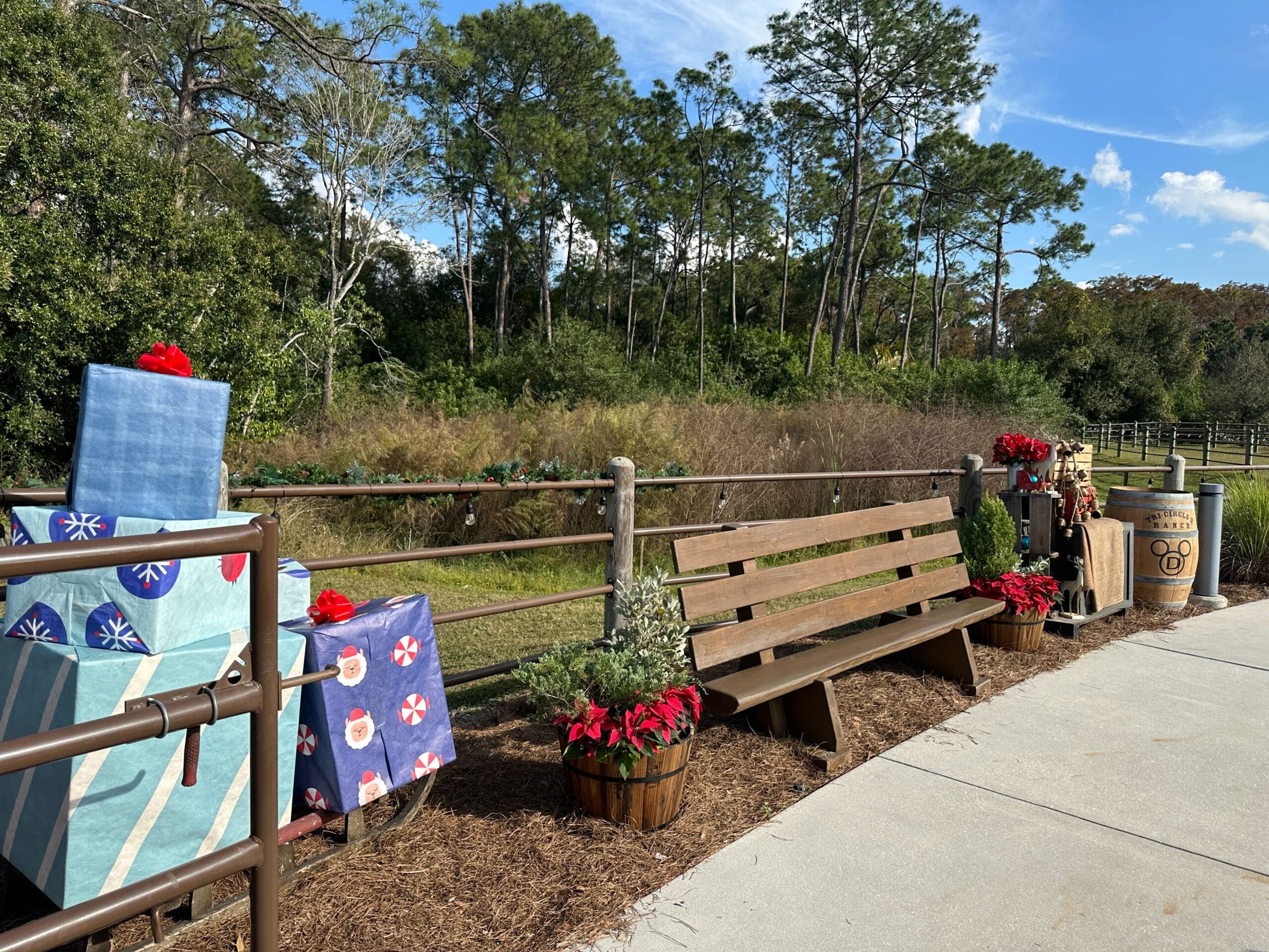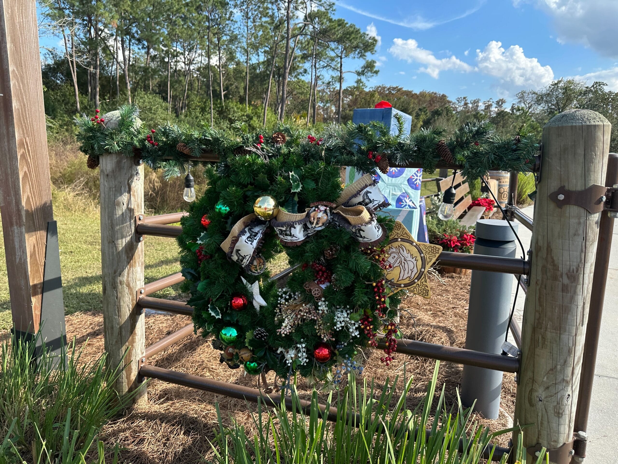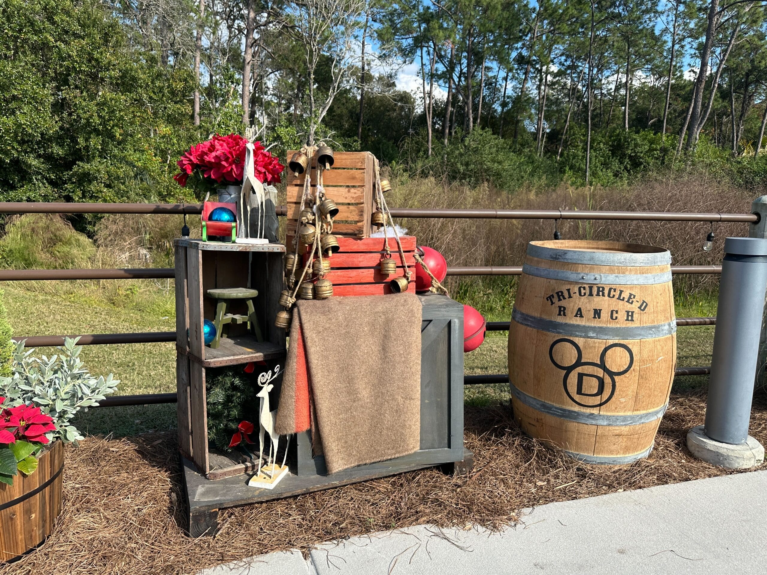 The bus stop at the front of the resort has garland hanging under the roof. Instead of wreaths, red wheels are between each section of garland. These are adorned with silver stars, boots, horseshoes, bows, and flowers.