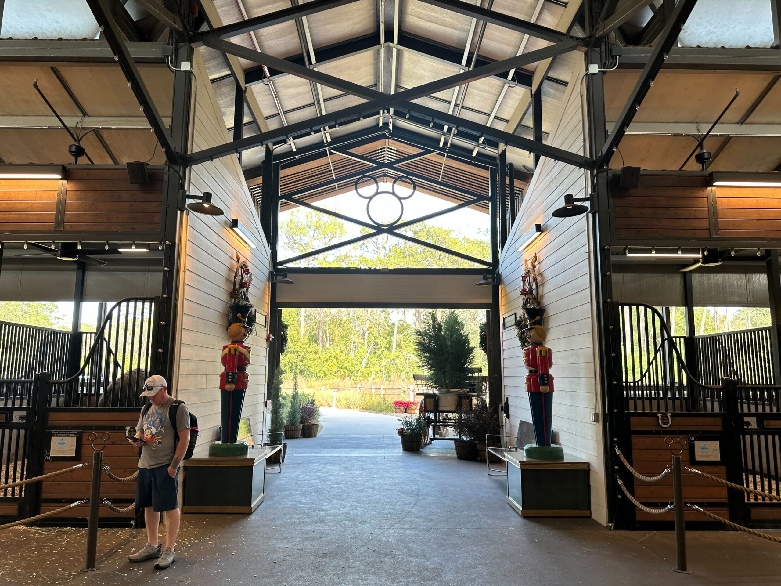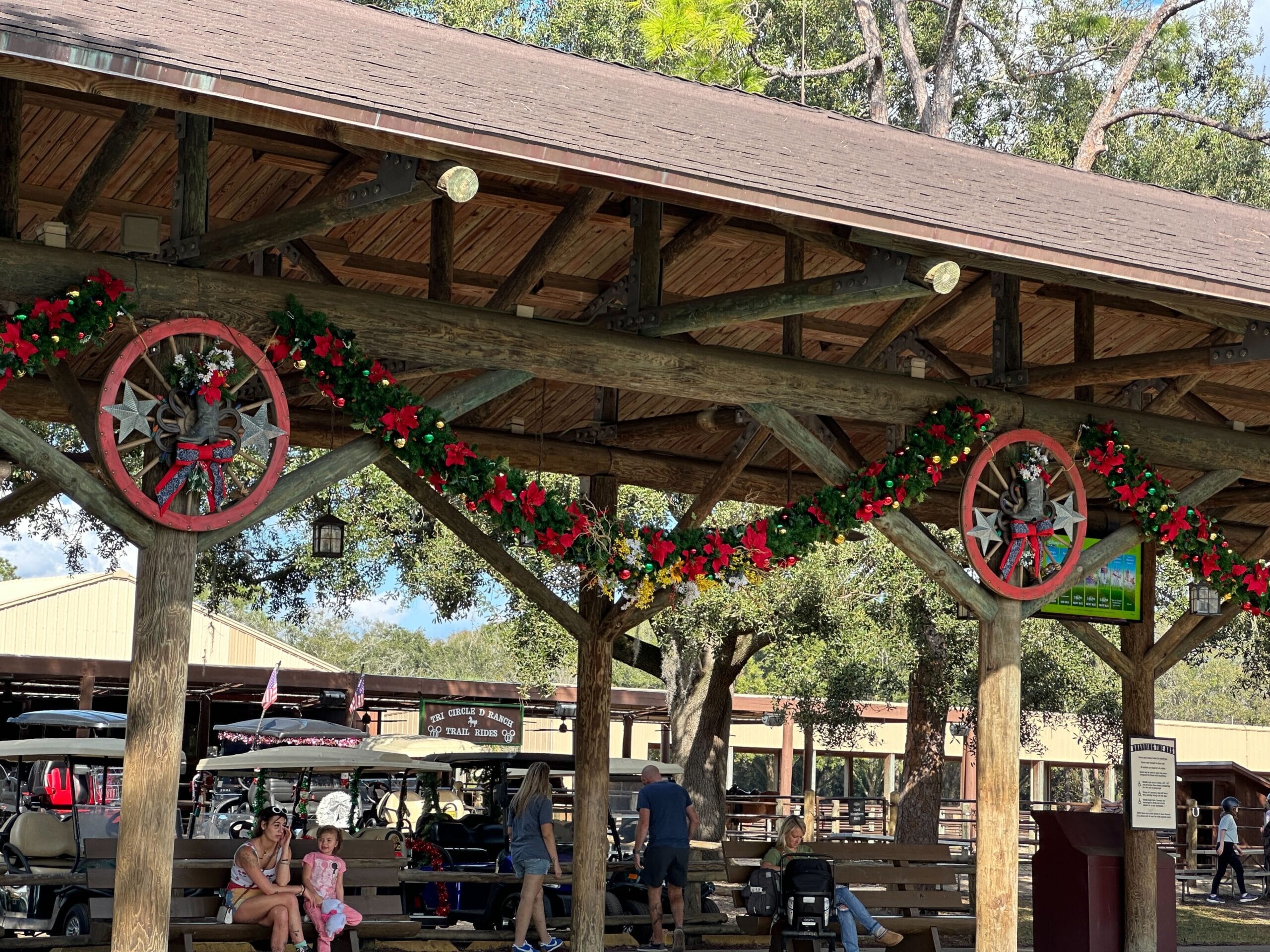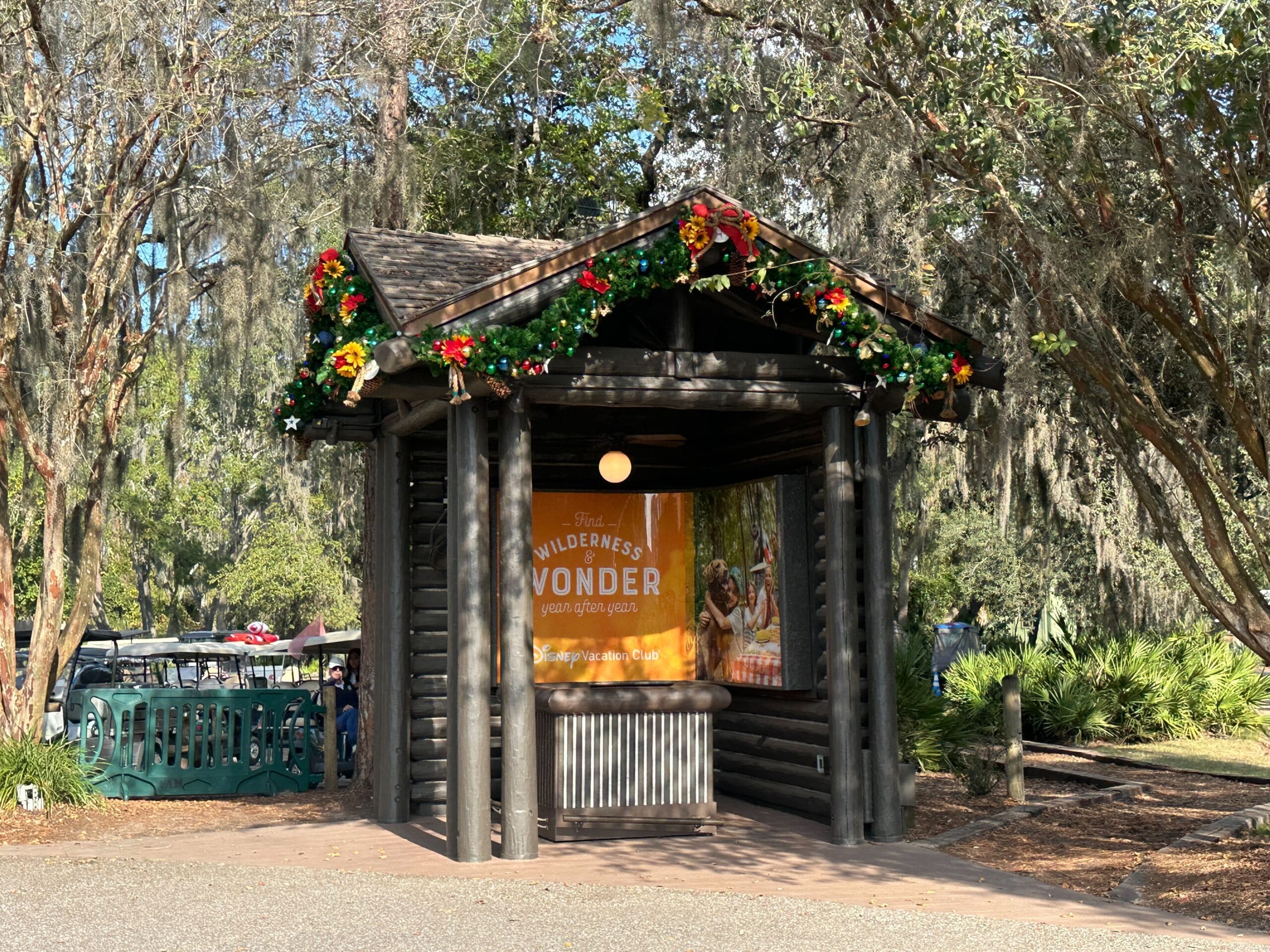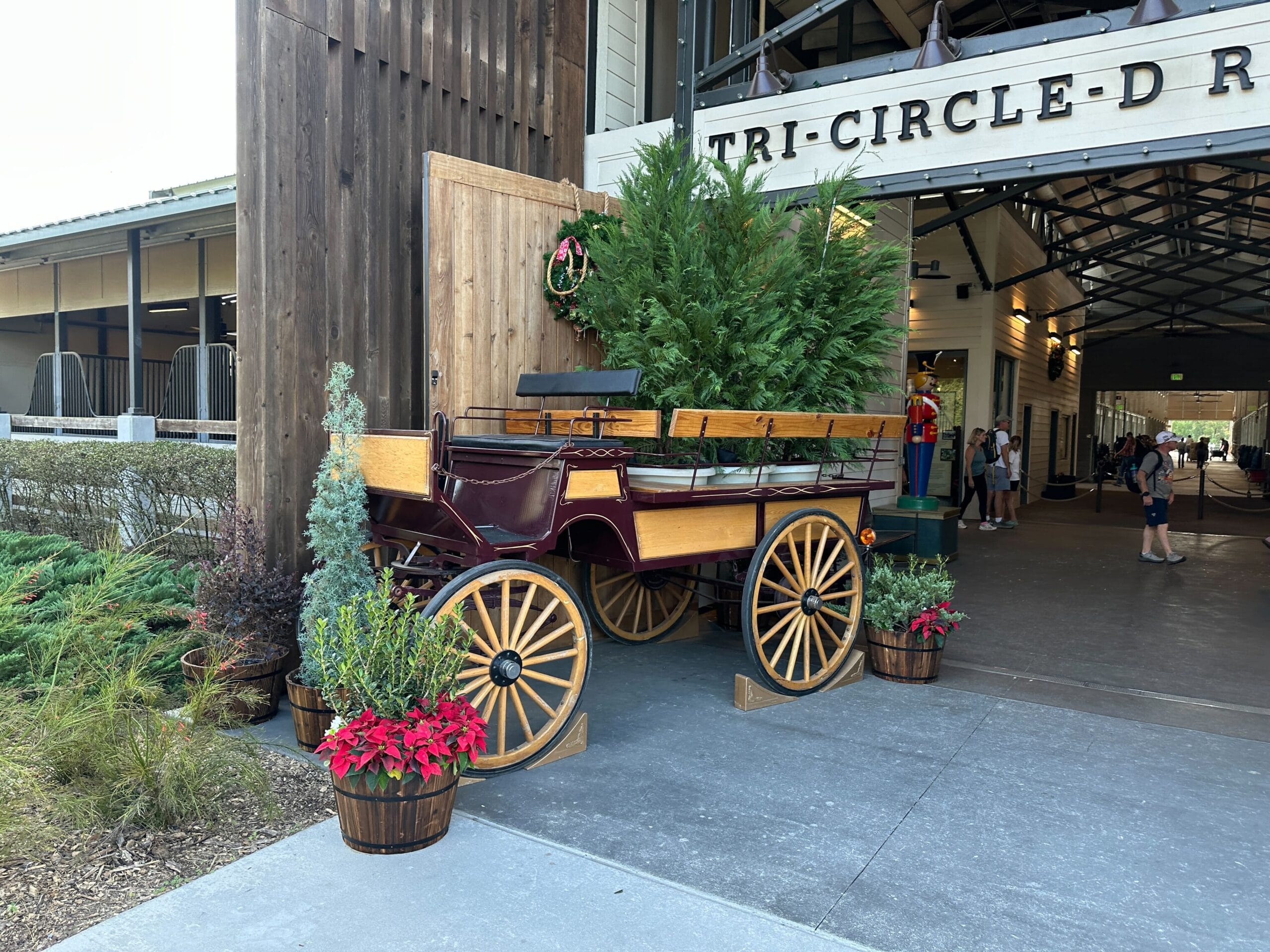 The bus stop at the front of the resort has garland hanging under the roof. Instead of wreaths, red wheels are between each section of garland. These are adorned with silver stars, boots, horseshoes, bows, and flowers.