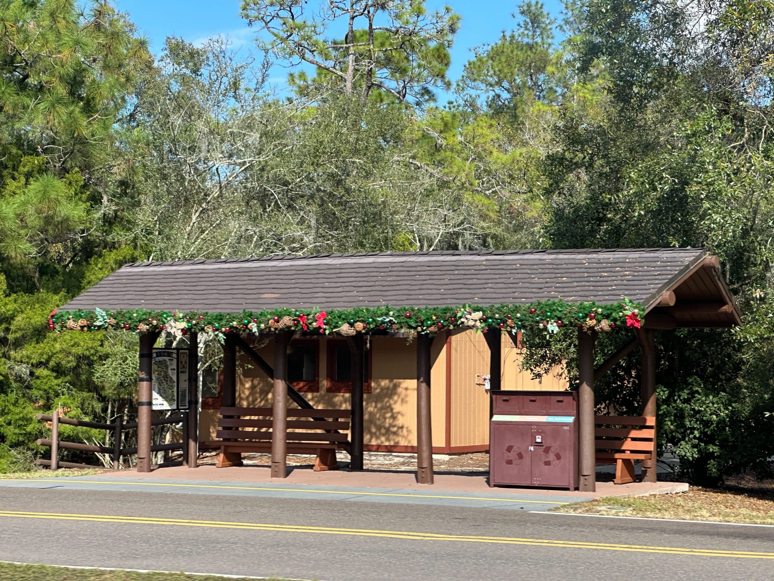 Garland trims the rooftops of the campgrounds’ bus stops.