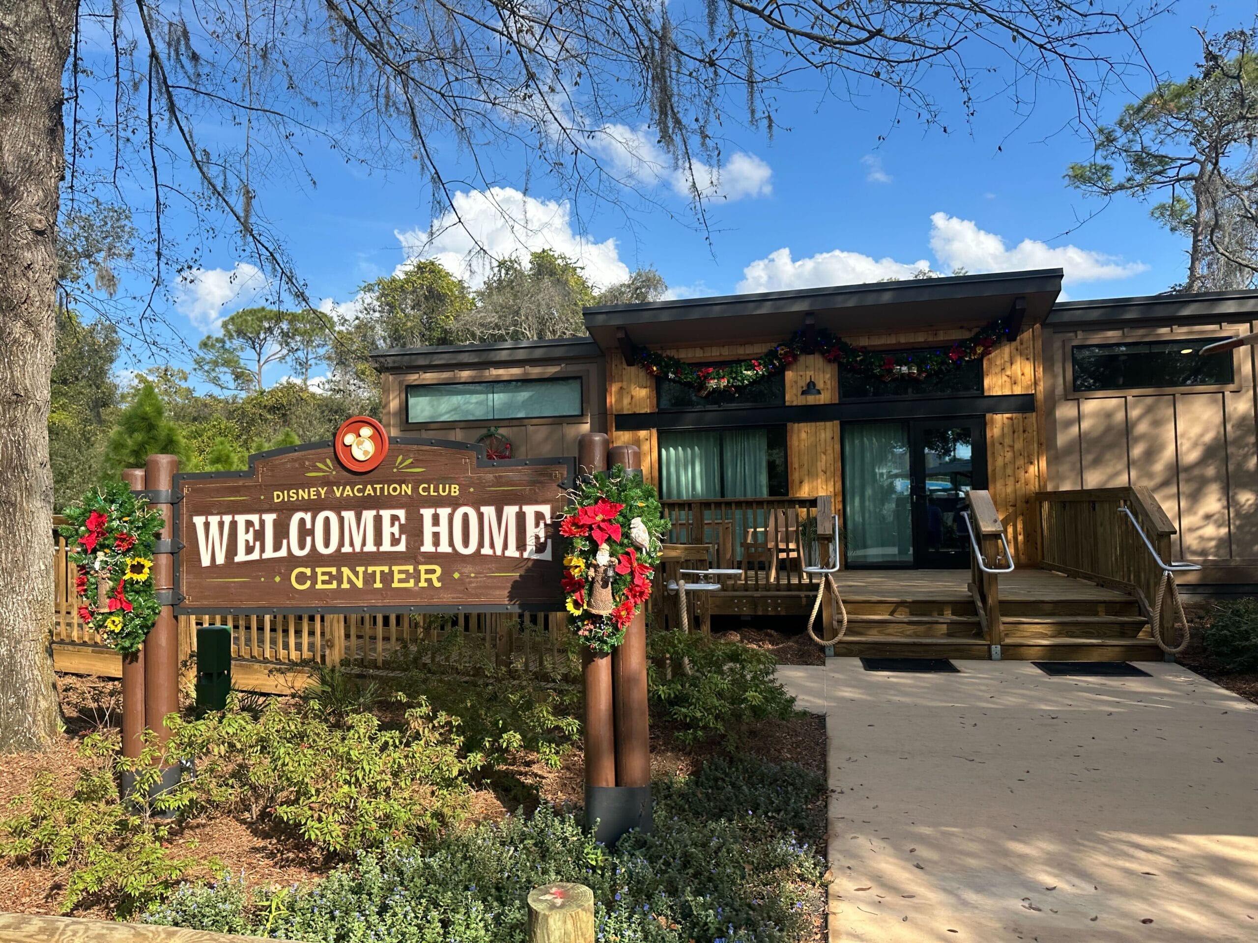 There are decorations on the Disney Vacation Club Welcome Home Center sign, as well as hanging on the model cabin.