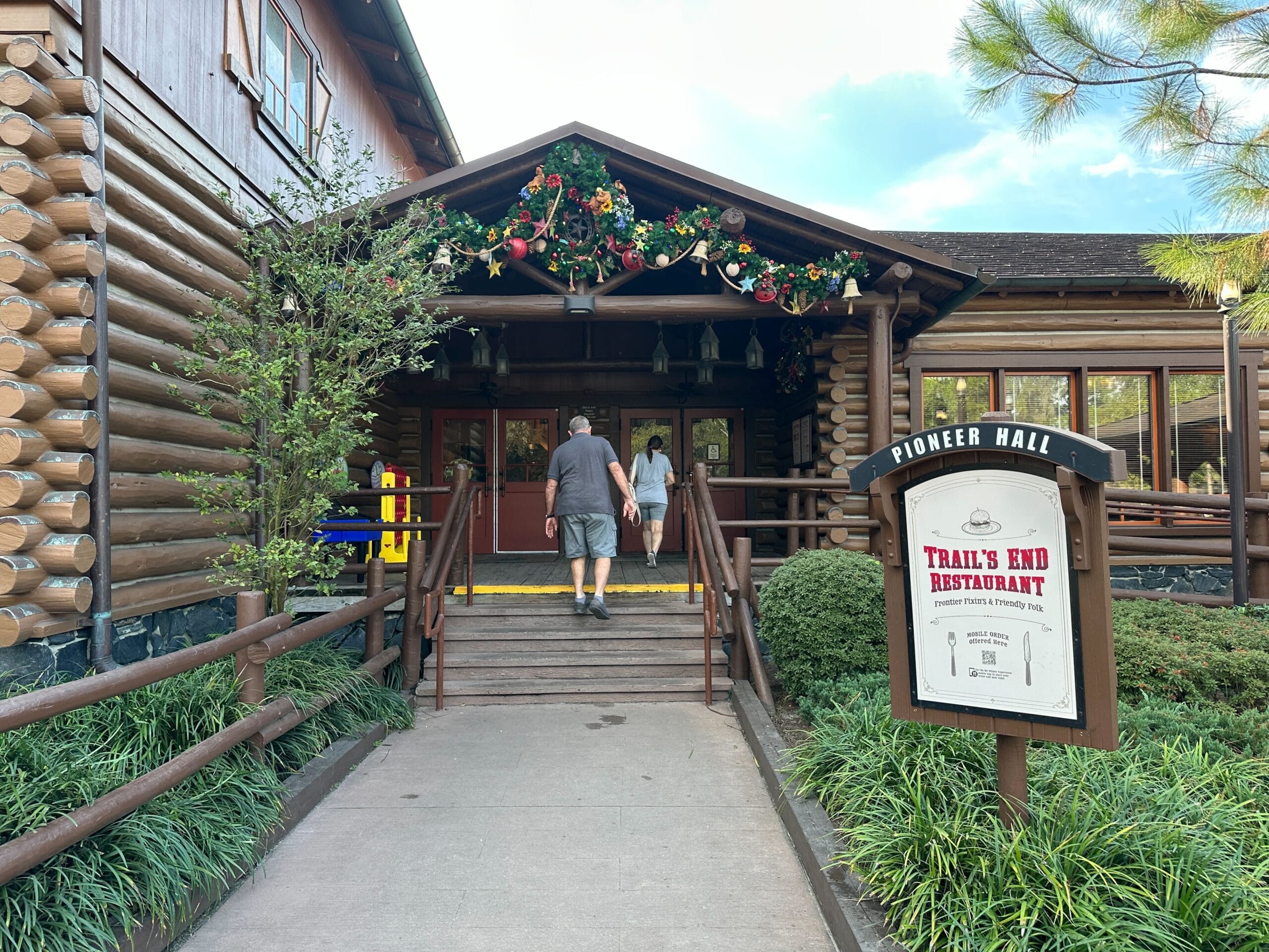 There’s garland on Trail’s End Restaurant, too. It connects to a big wreath above the entrance door, with a horseshoe and star in its center. Ropes are draped over the garland and there are bell decorations.