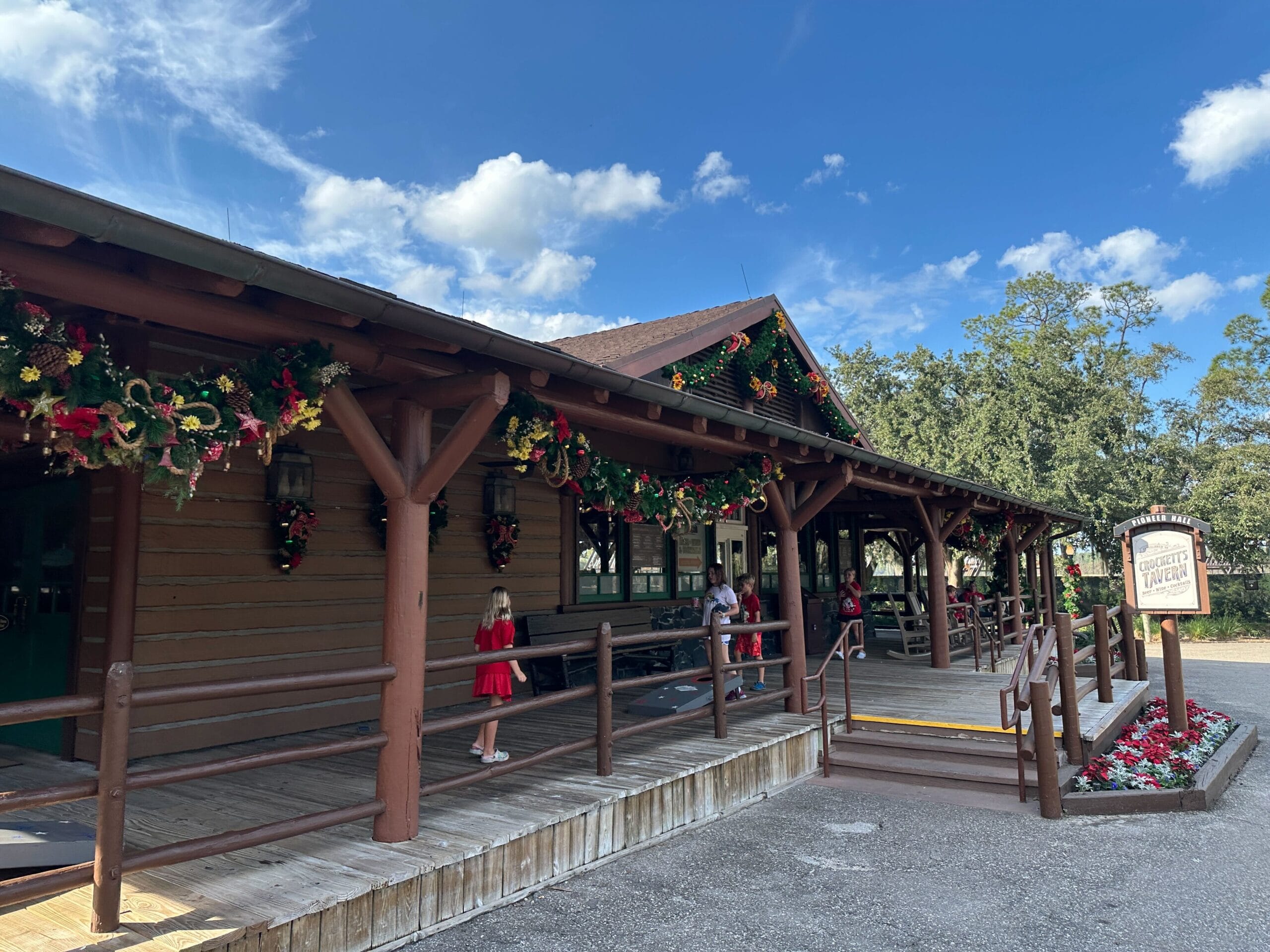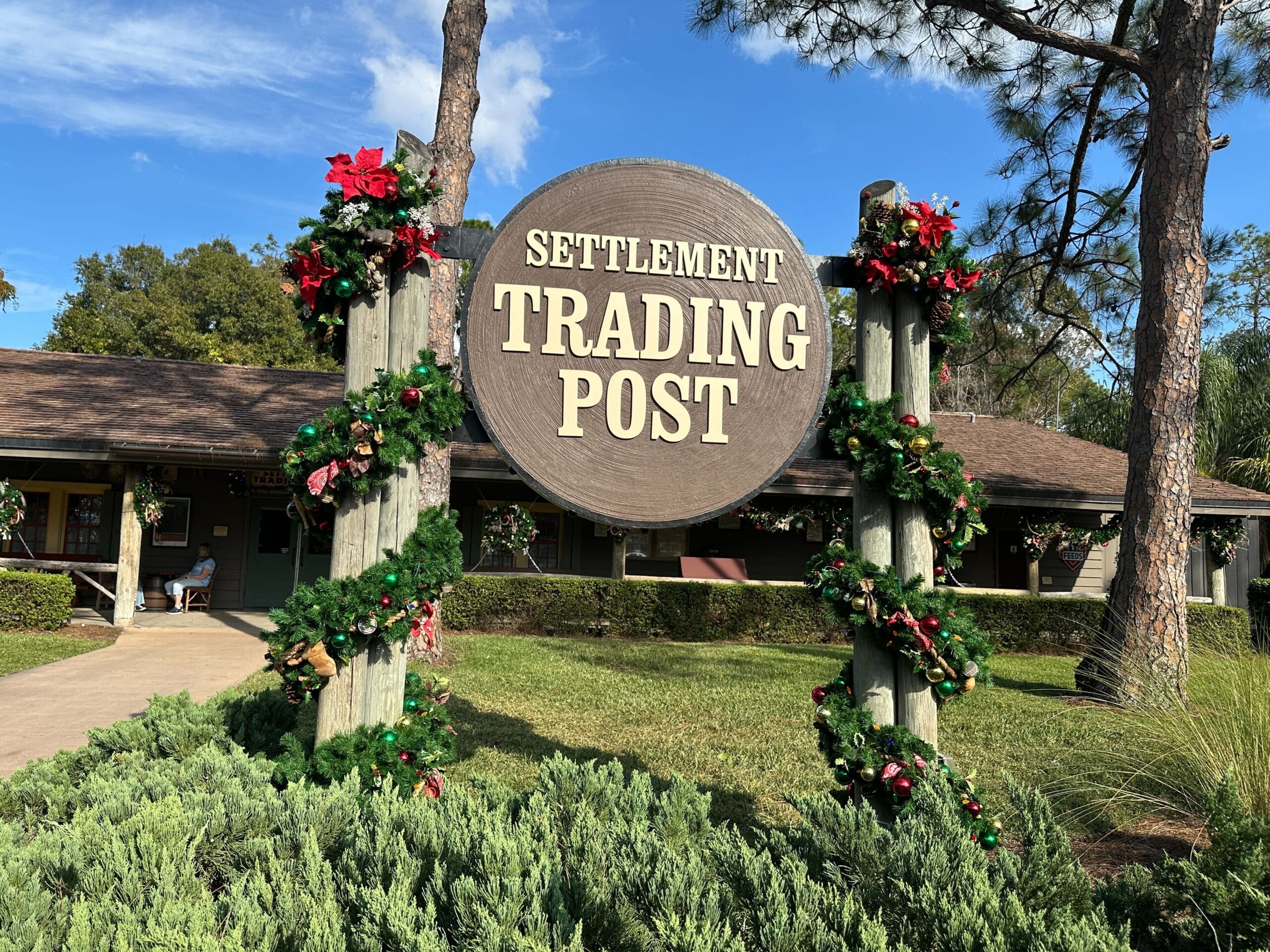 Garland is wrapped around the supports of the Settlement Trading Post sign. More garland hangs from the roof.