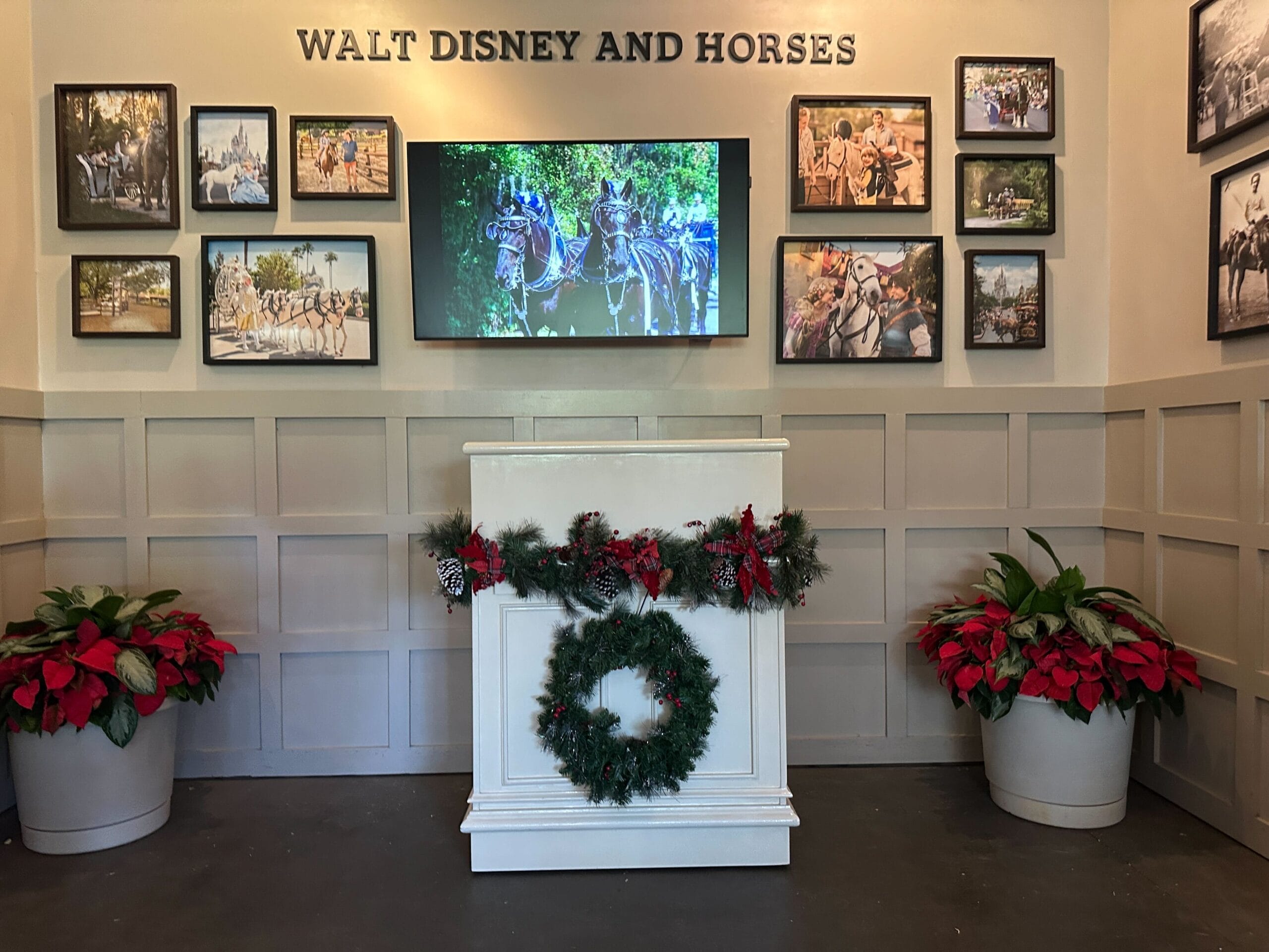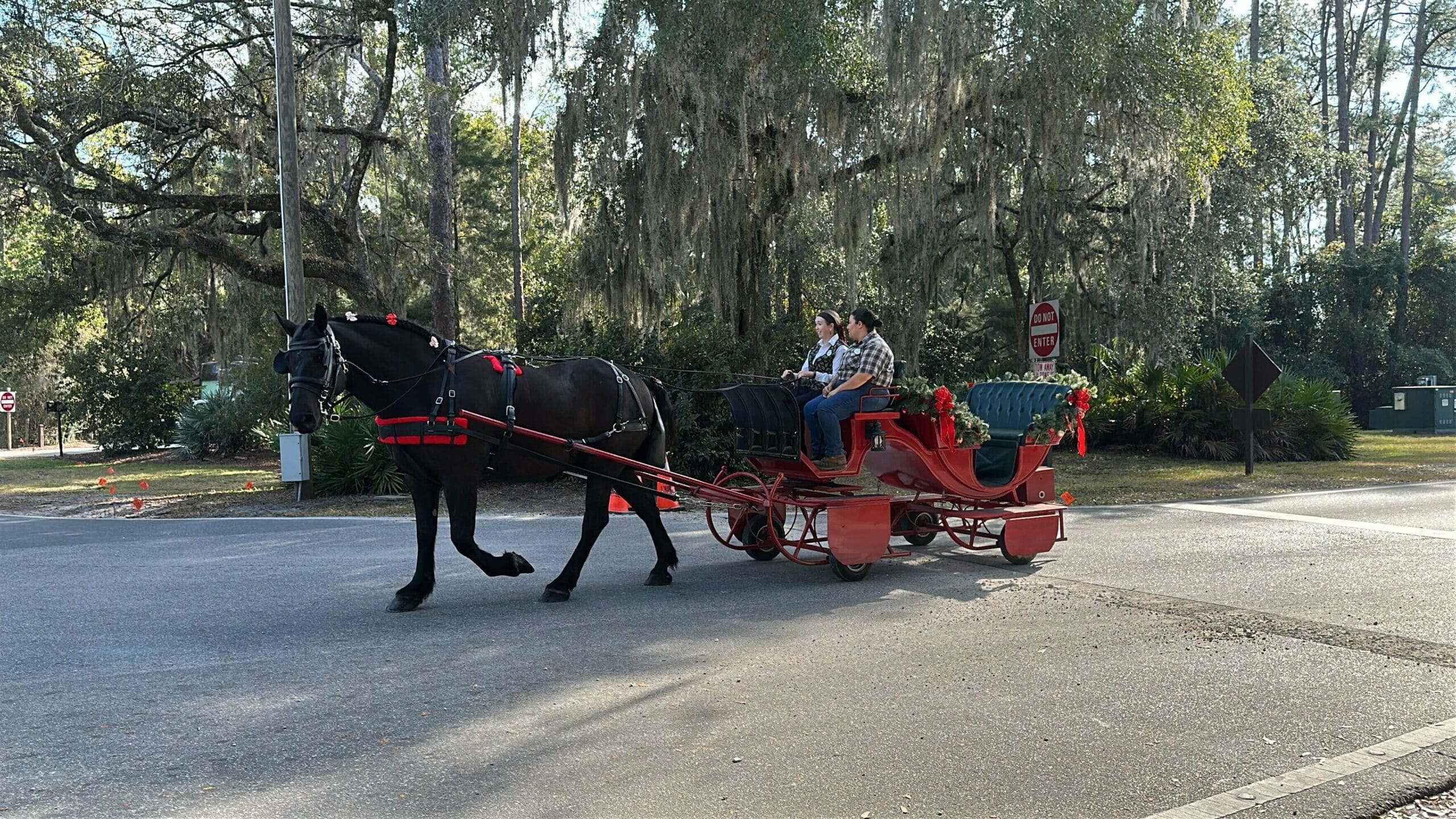 We spotted one of the resort’s horse-drawn carriages with garland around its bench seats and red bows on the ends.