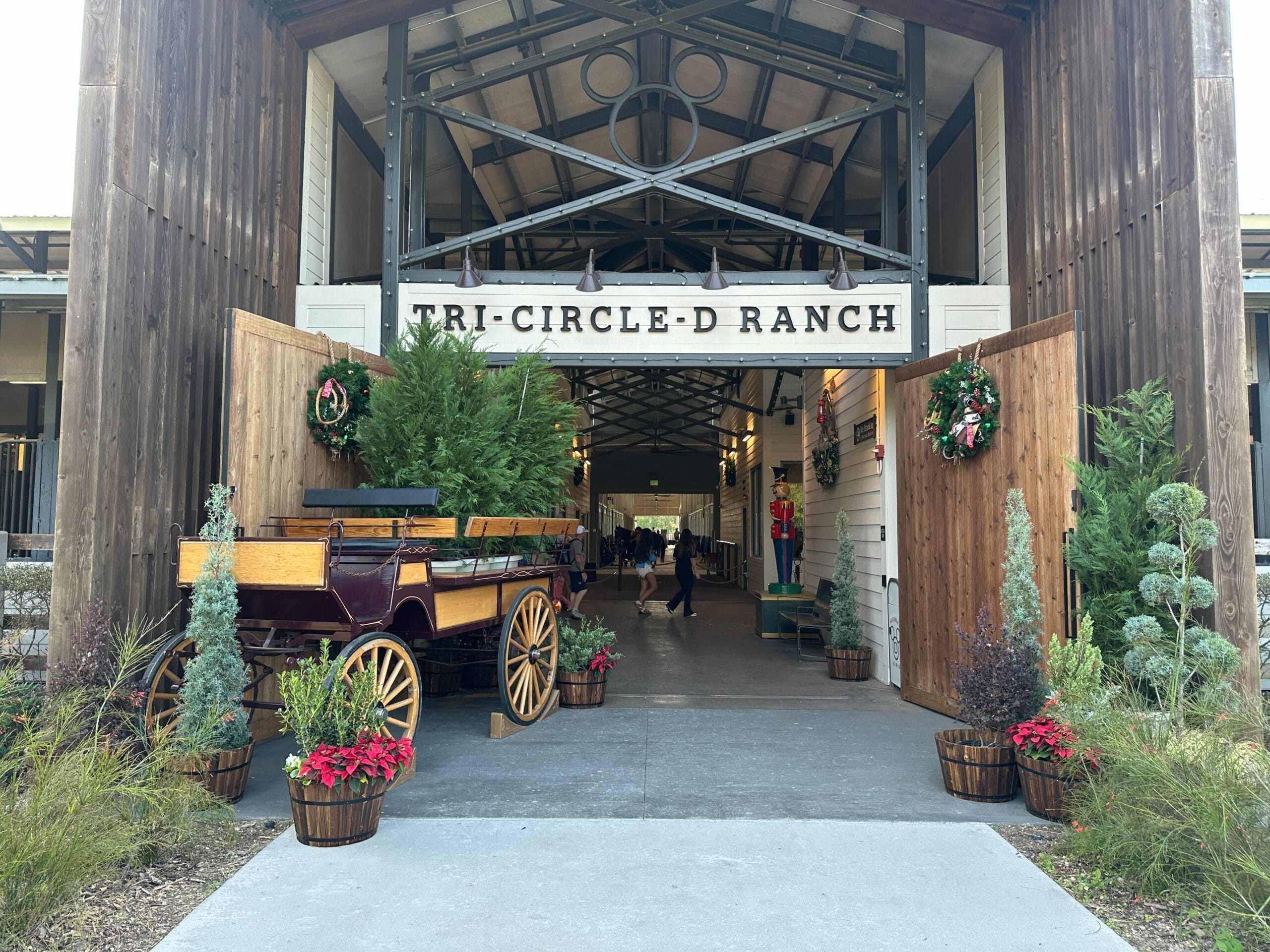Between Pioneer Hall and Settlement Trading Post is a Christmas tree. It’s topped with a silver star and features ranch-inspired décor.