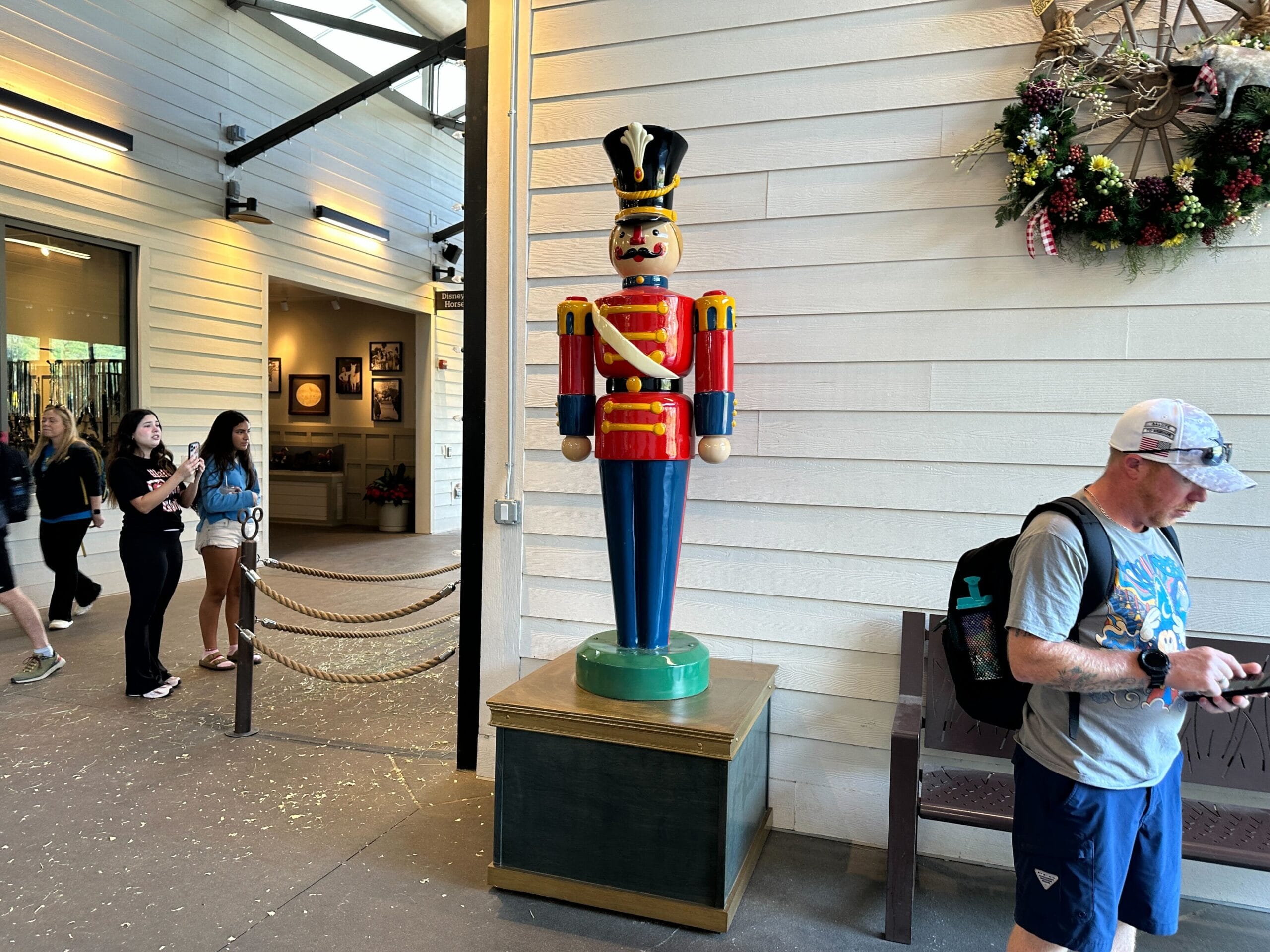 Pioneer Hall, home of the Hoop-Dee-Doo Revue, is decked out with garlands and wreaths across its railings. These are filled with shiny baubles, poinsettias, ribbons, and wood acorn-shaped decorations.