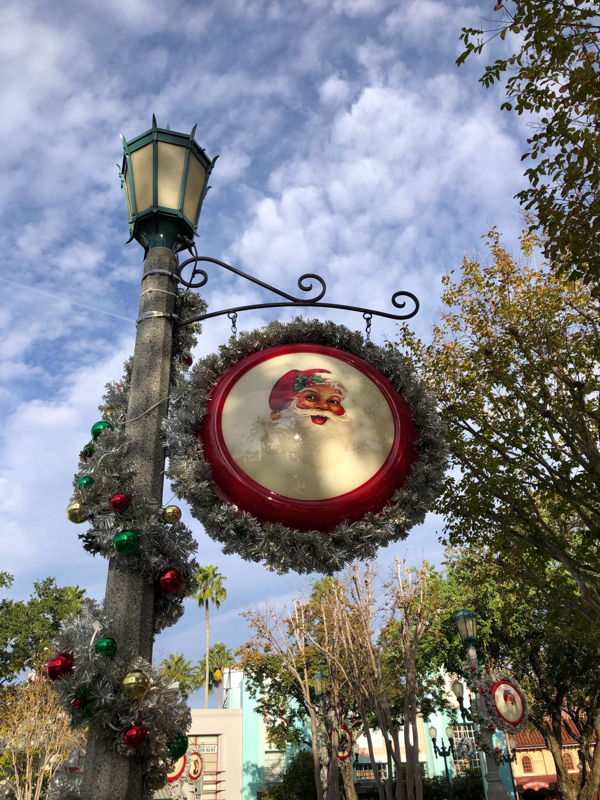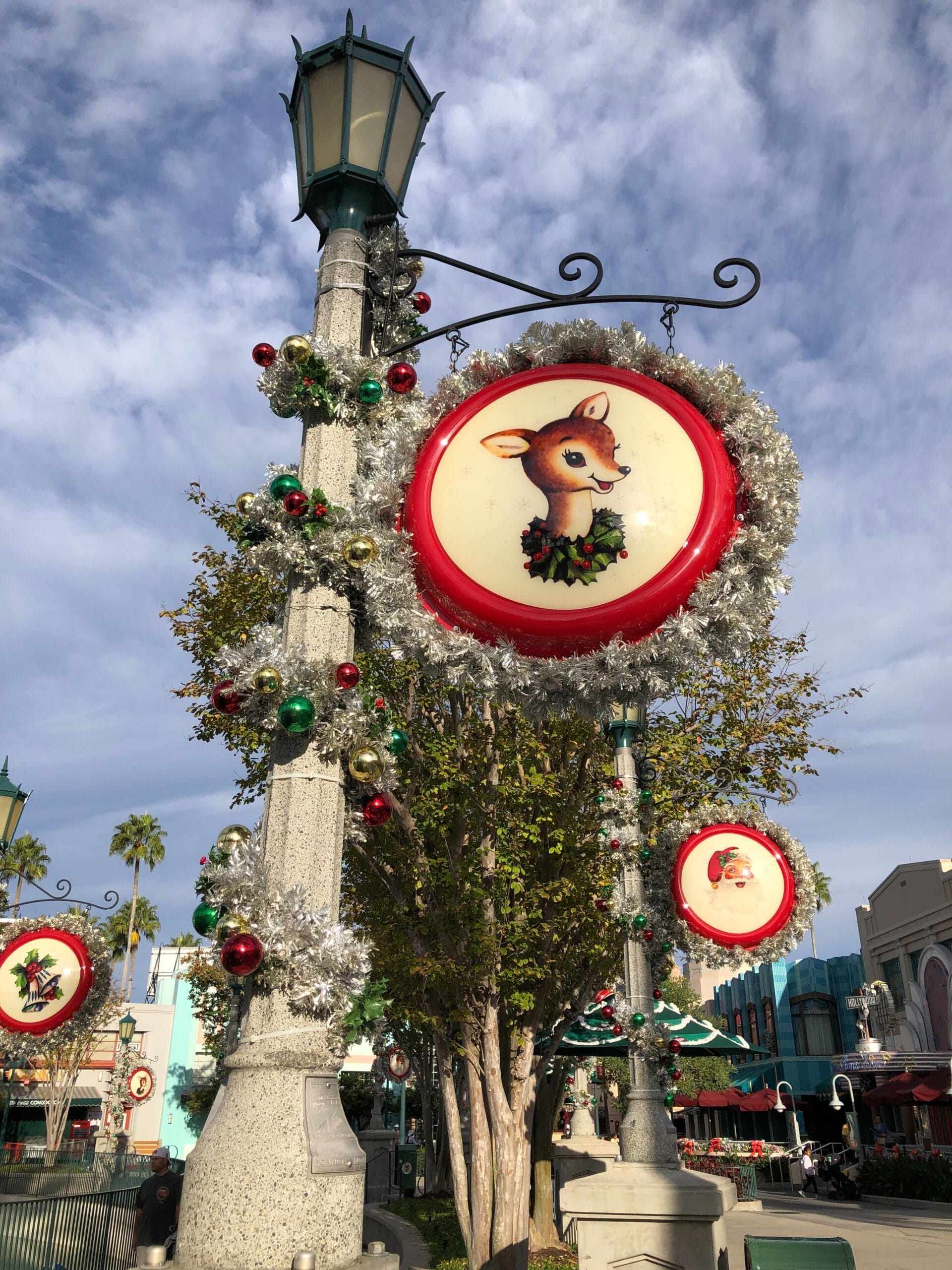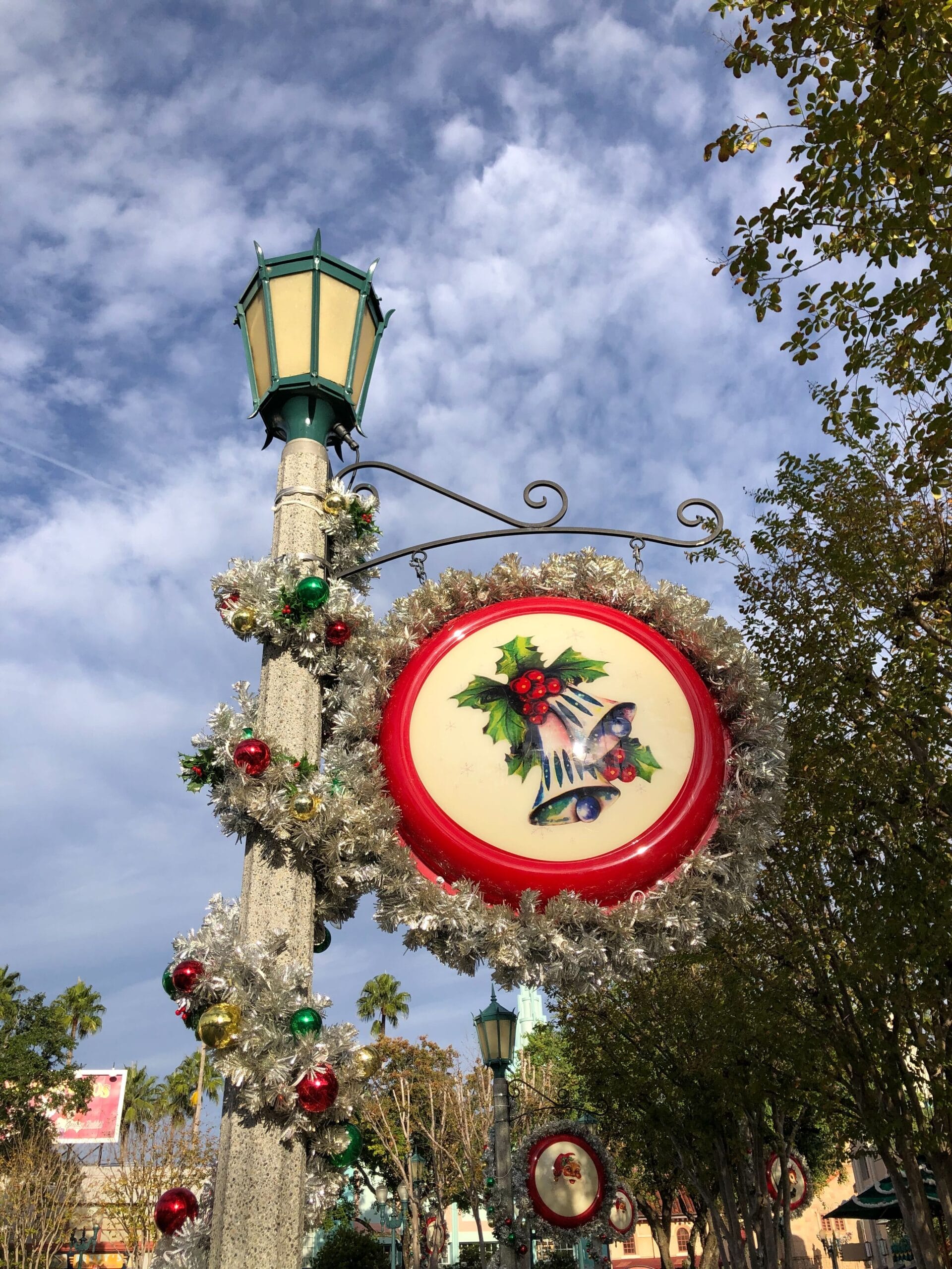Silver garland is around the lampposts of Echo Lake. Hanging from the posts are silver wreaths with medallion centers featuring retro Christmas artwork of Santa, silver bells, and deer.