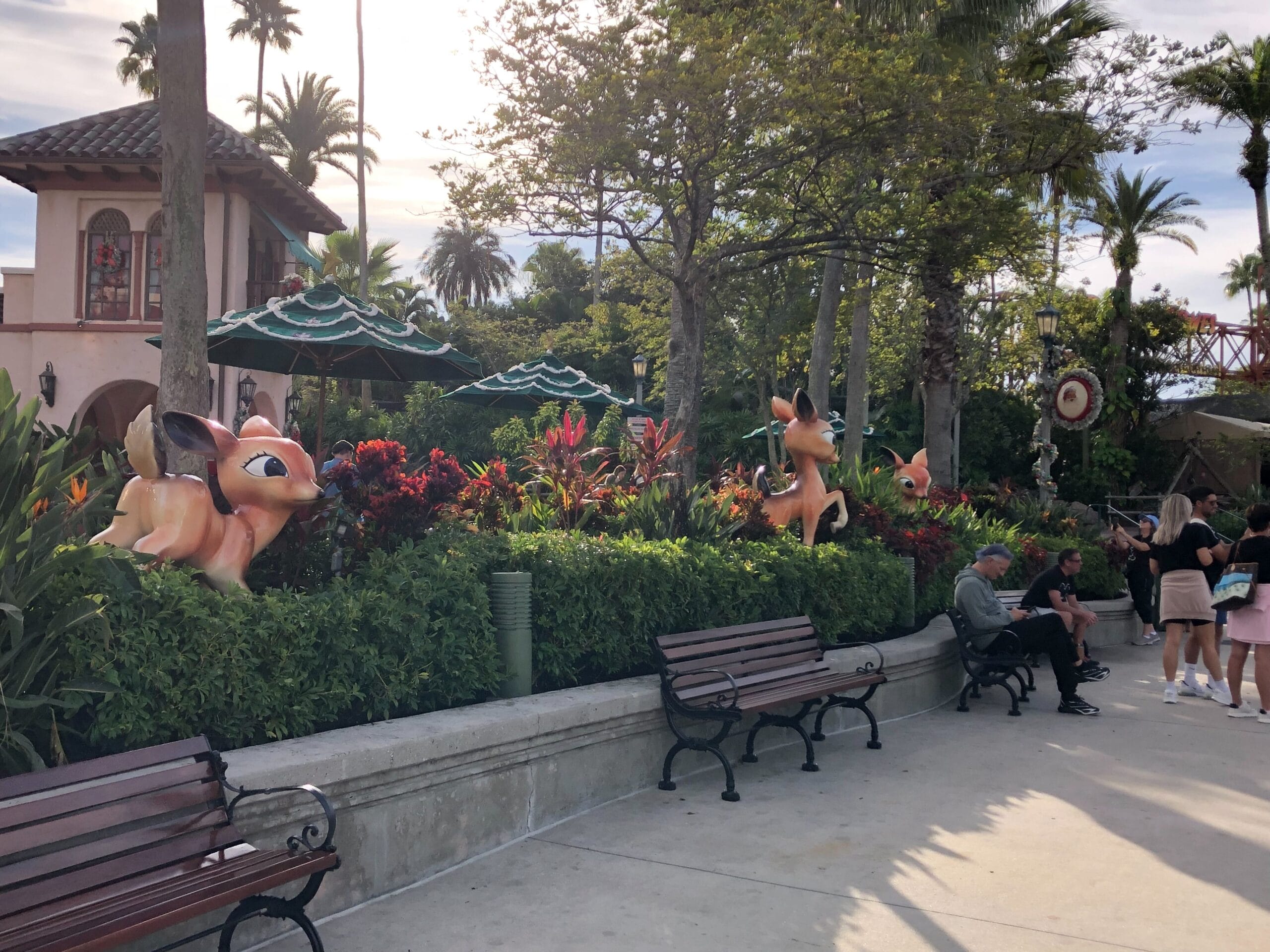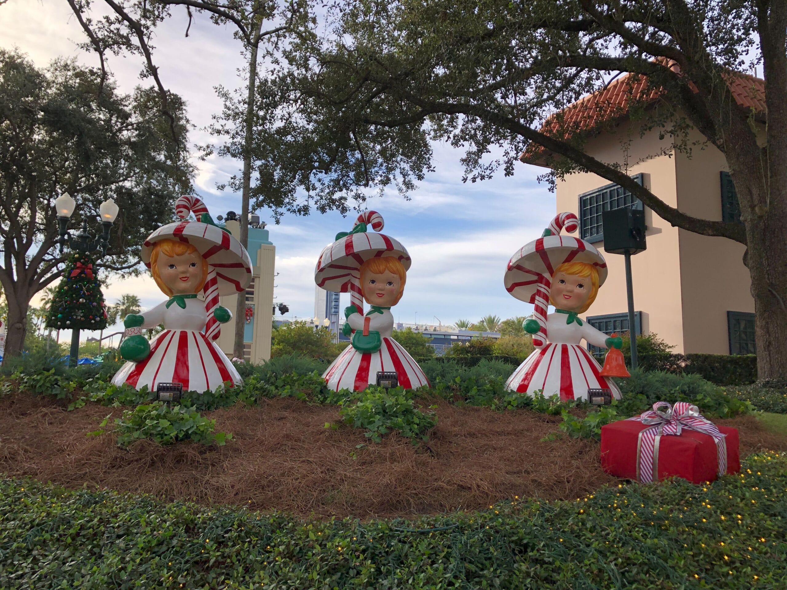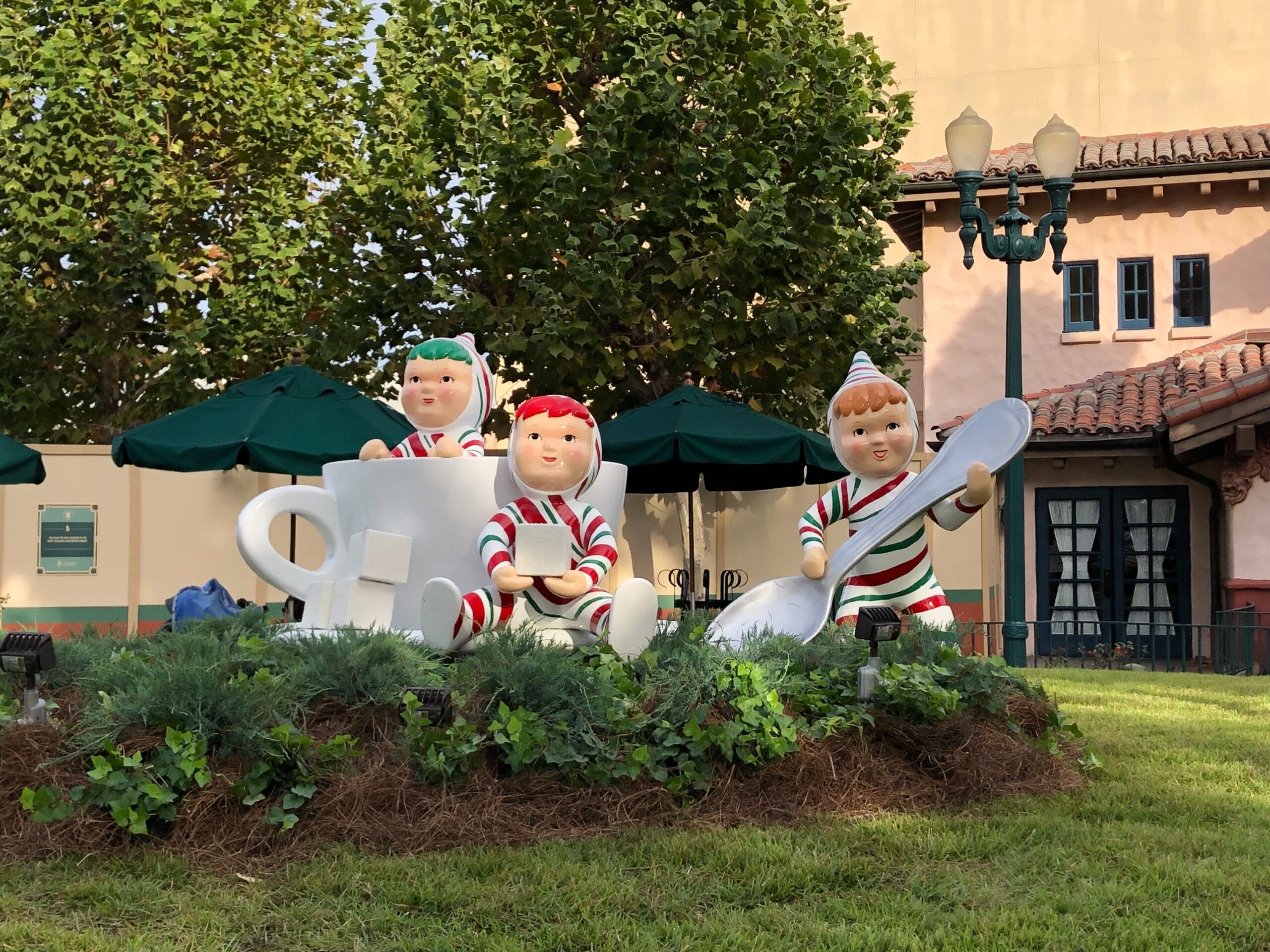 In a flowerbed in the center of the park is a trio of statues wearing candy cane dresses and holding candy cane umbrellas. Outside The Hollywood Brown Derby are three more figures in candy cane-inspired onesies playing with a giant teacup, spoon, and sugar cubes.