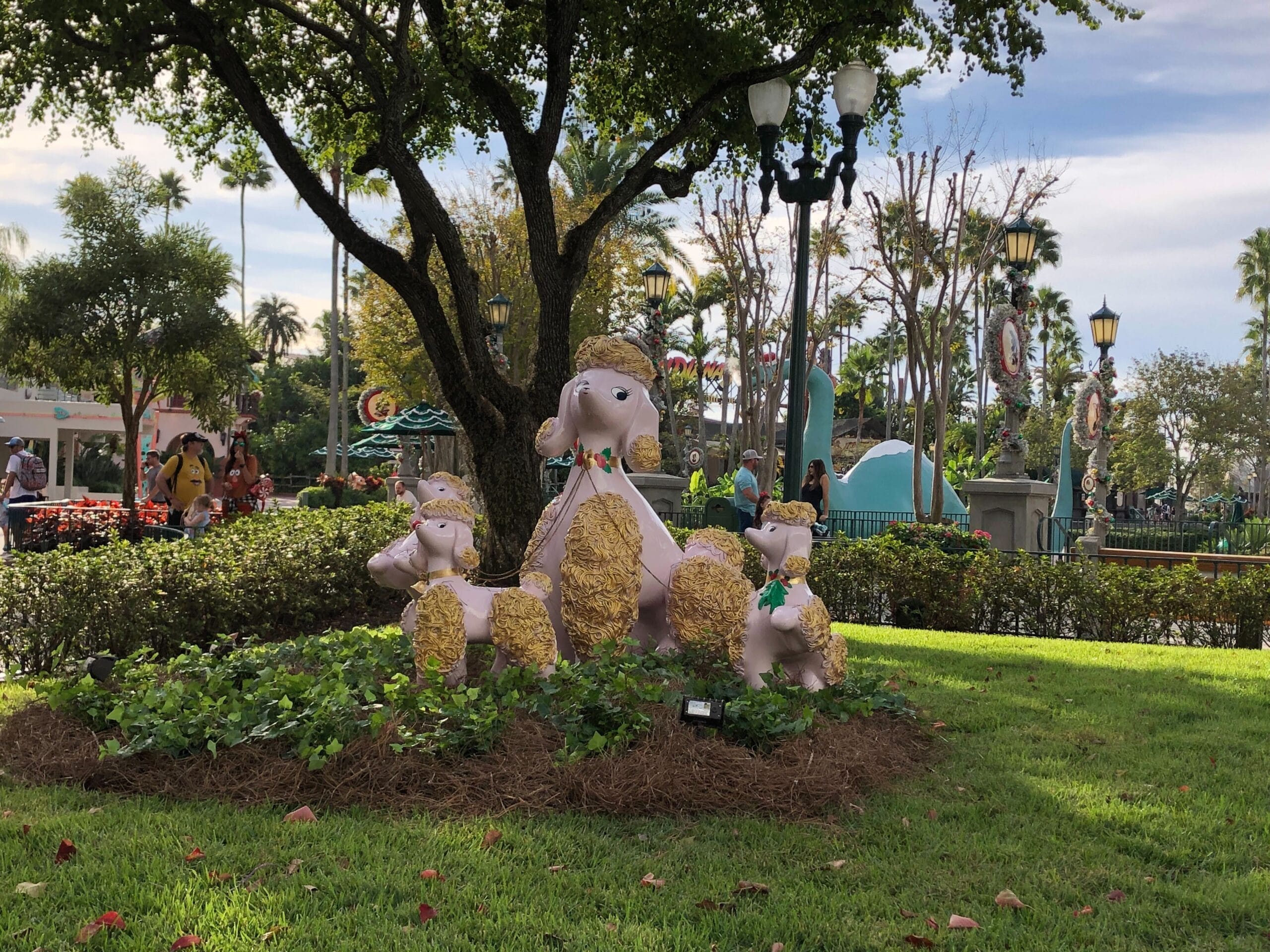 The Echo Lake flowerbeds have their holiday statues. The festive poodles have been freshly painted since last year so they are more pink and gold. Outside 50’s Prime Time Cafe is a series of prancing deer.