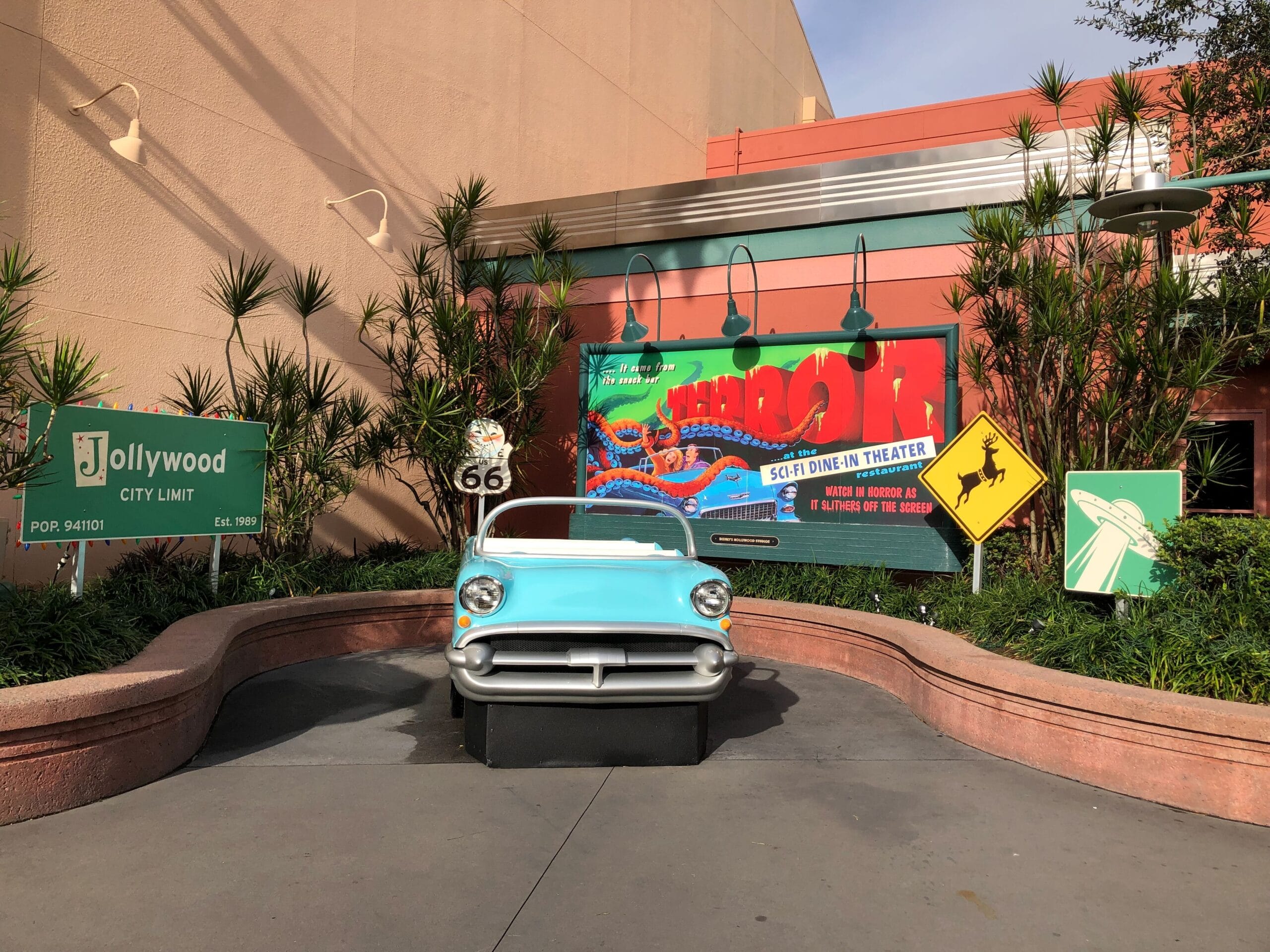 Themed holiday road signs have gone up around the car photo op outside Sci-Fi Dine-In Theater Restaurant. The car itself was refreshed a few weeks ago.