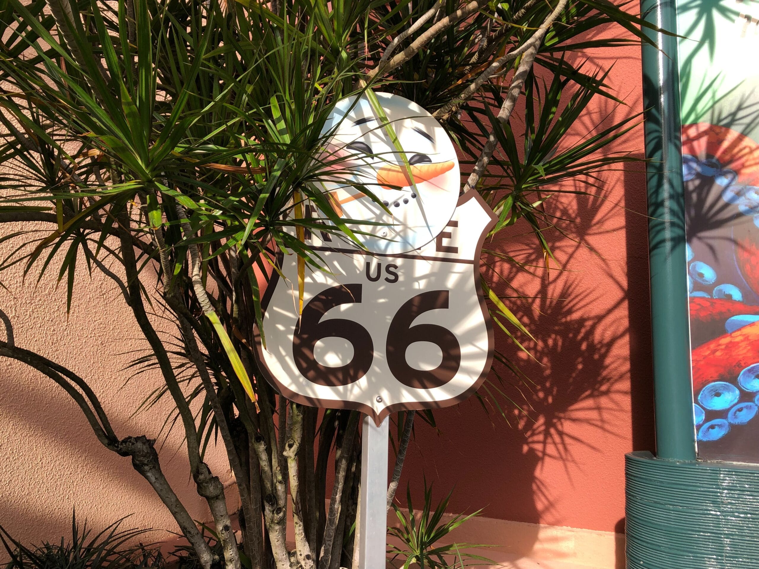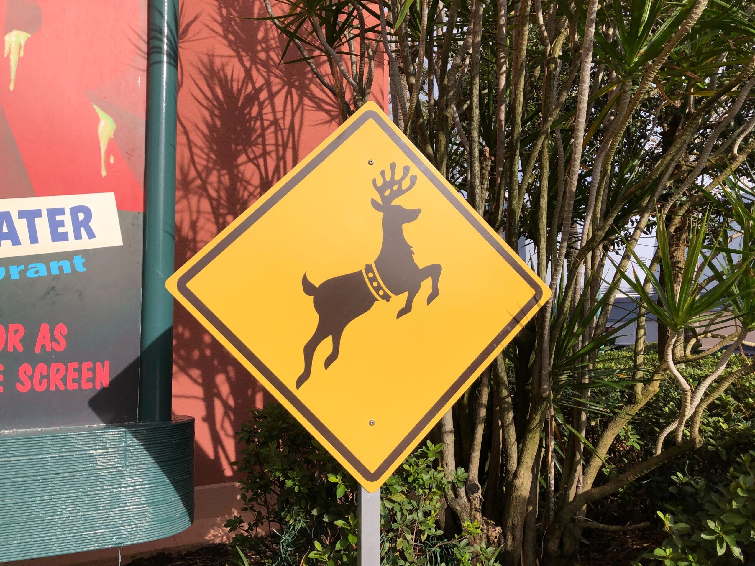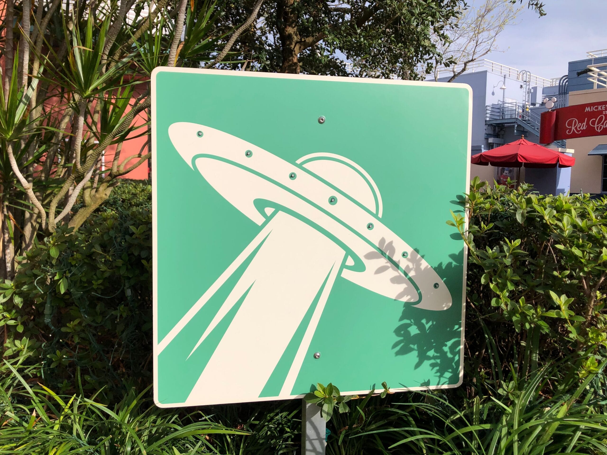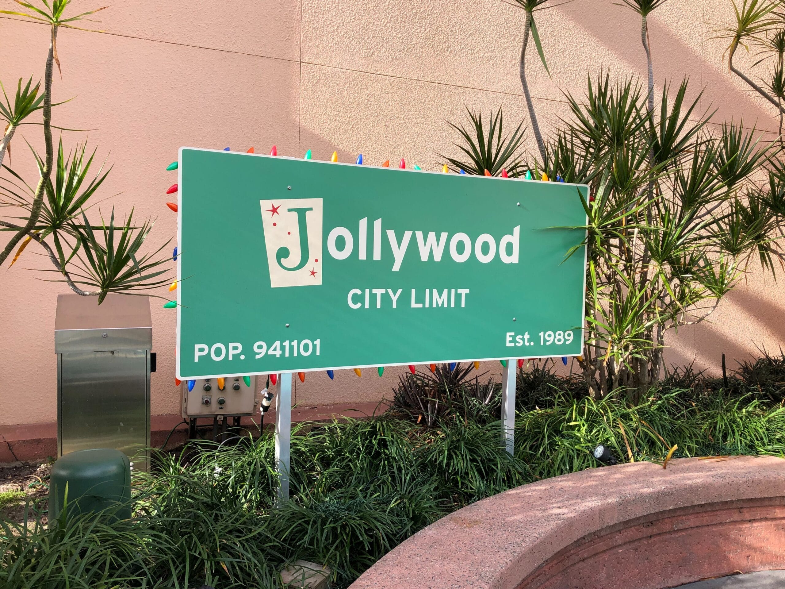 One side is for the “Jollywood City Limit.” A Route 66 sign features a snowman’s face. There’s a deer crossing sign depicting a flying reindeer. And a UFO sign. These all light up at night. The large billboard will also be covered with a holiday design for Disney Jollywood Nights.