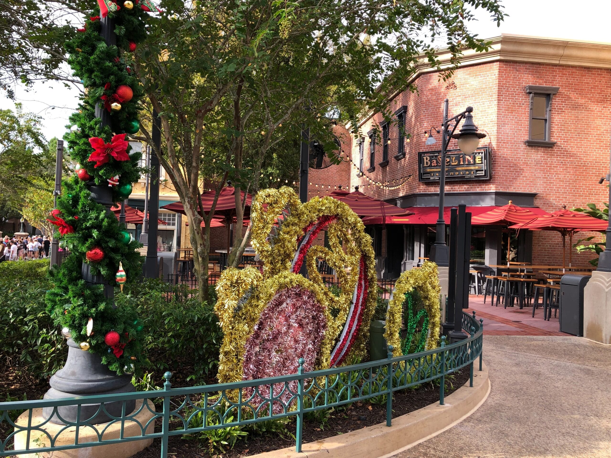 There are giant tinsel ornaments in a flowerbed outside Baseline Tap House. Nearby lampposts are wrapped in traditional green garland.