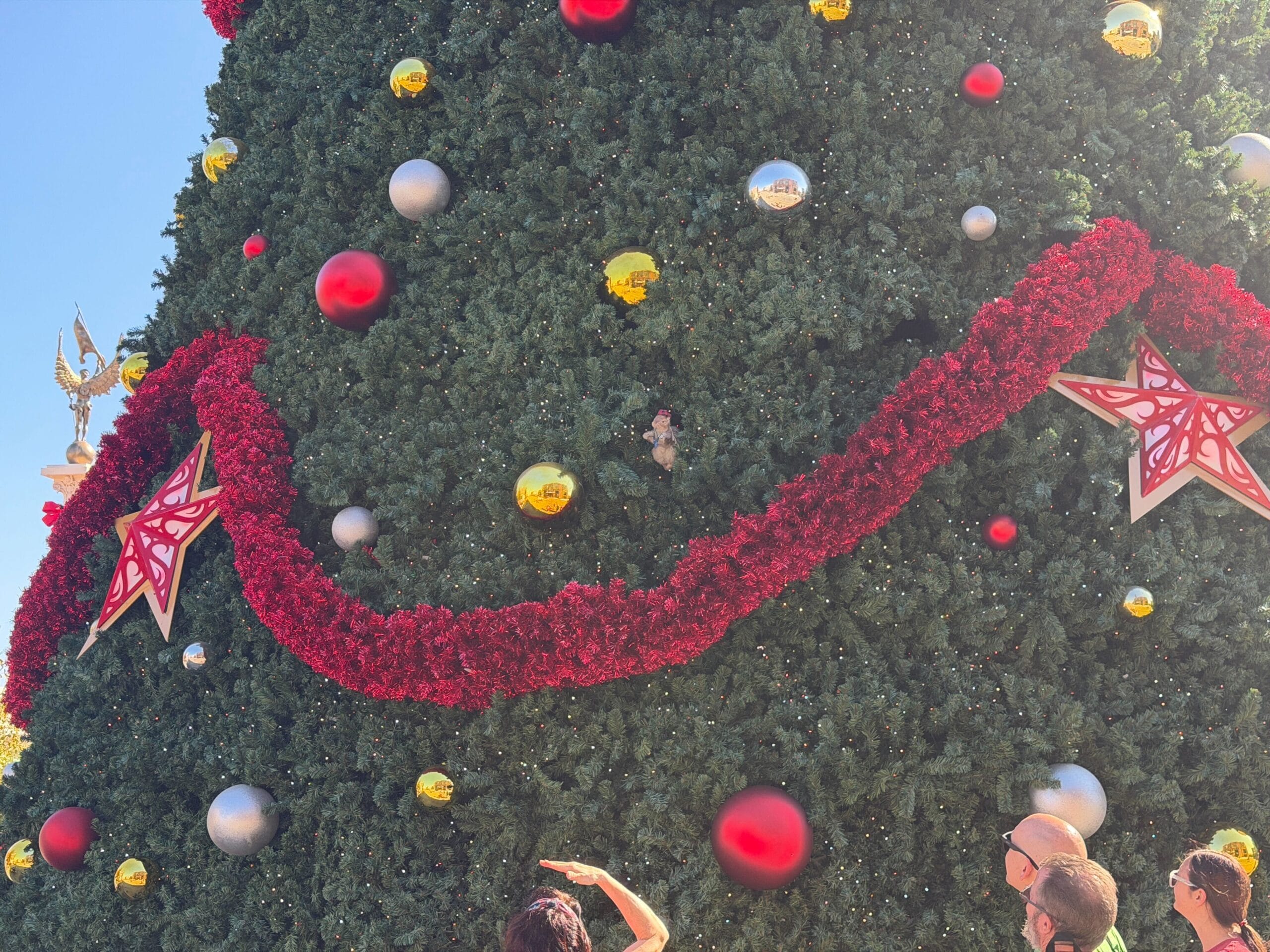 The massive Christmas tree has arrived in the park as well. The tree is dotted with colorful ornament balls of various colors and sizes. It also has red garland and stars.