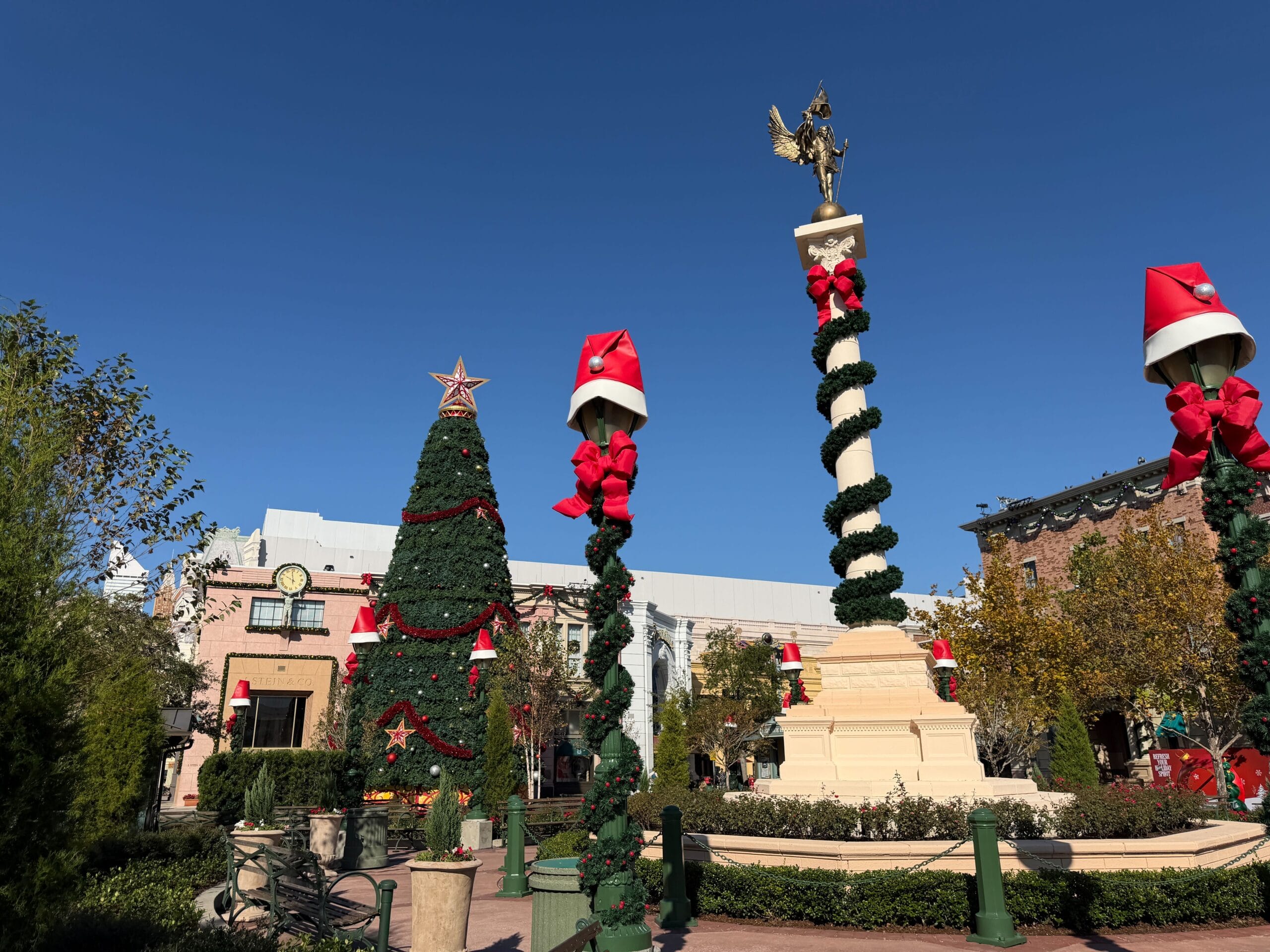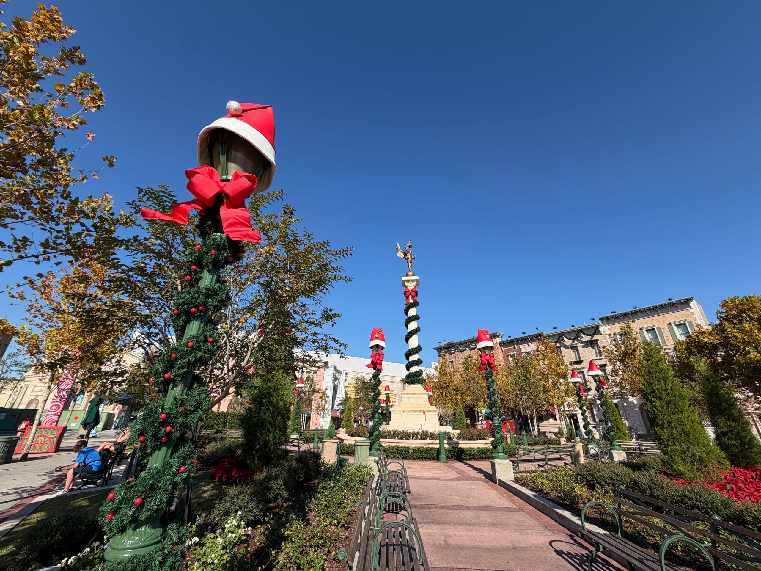 Nearby lampposts have Santa hats, and wreaths and more garland adorn the fronts of building structures.