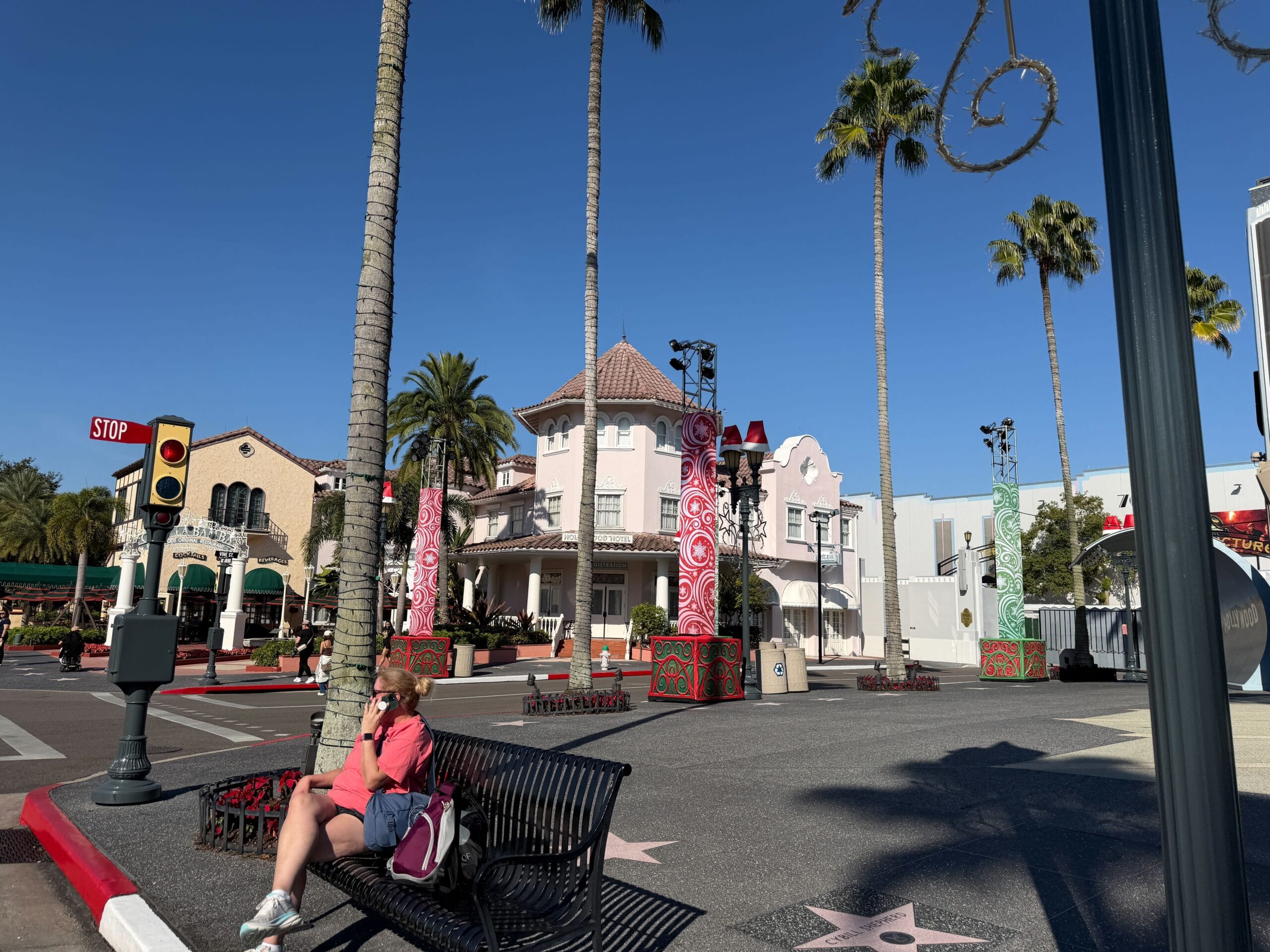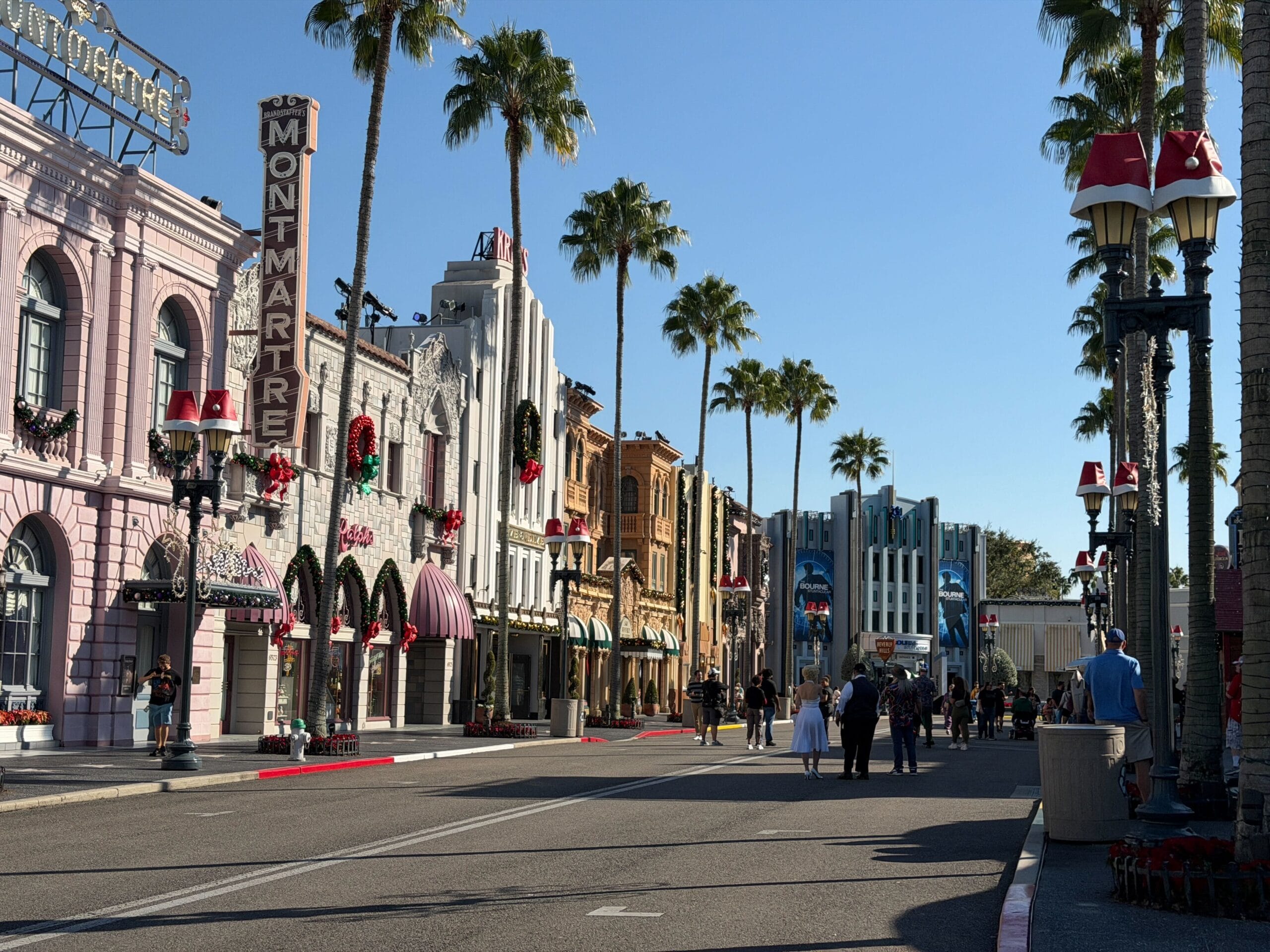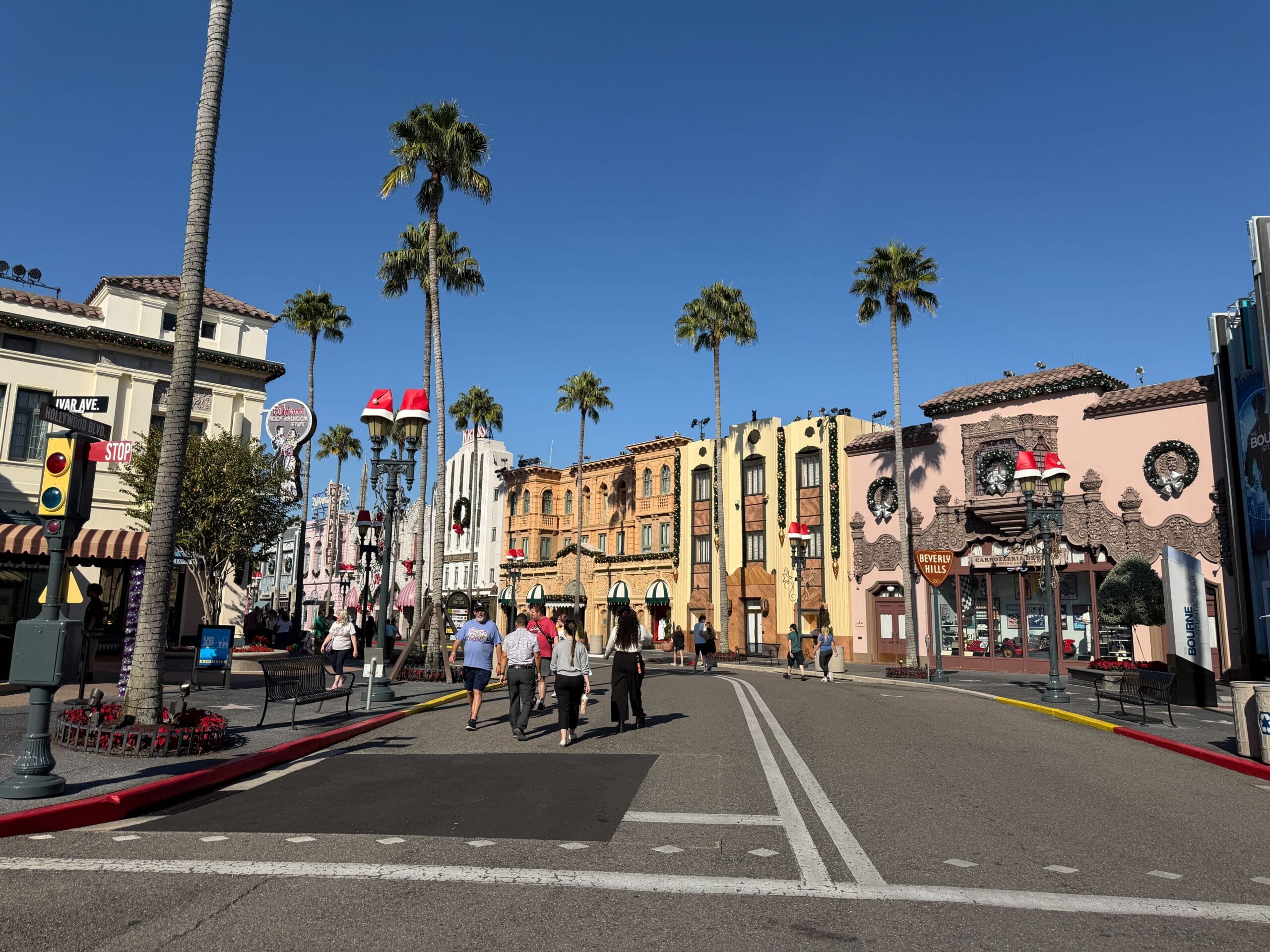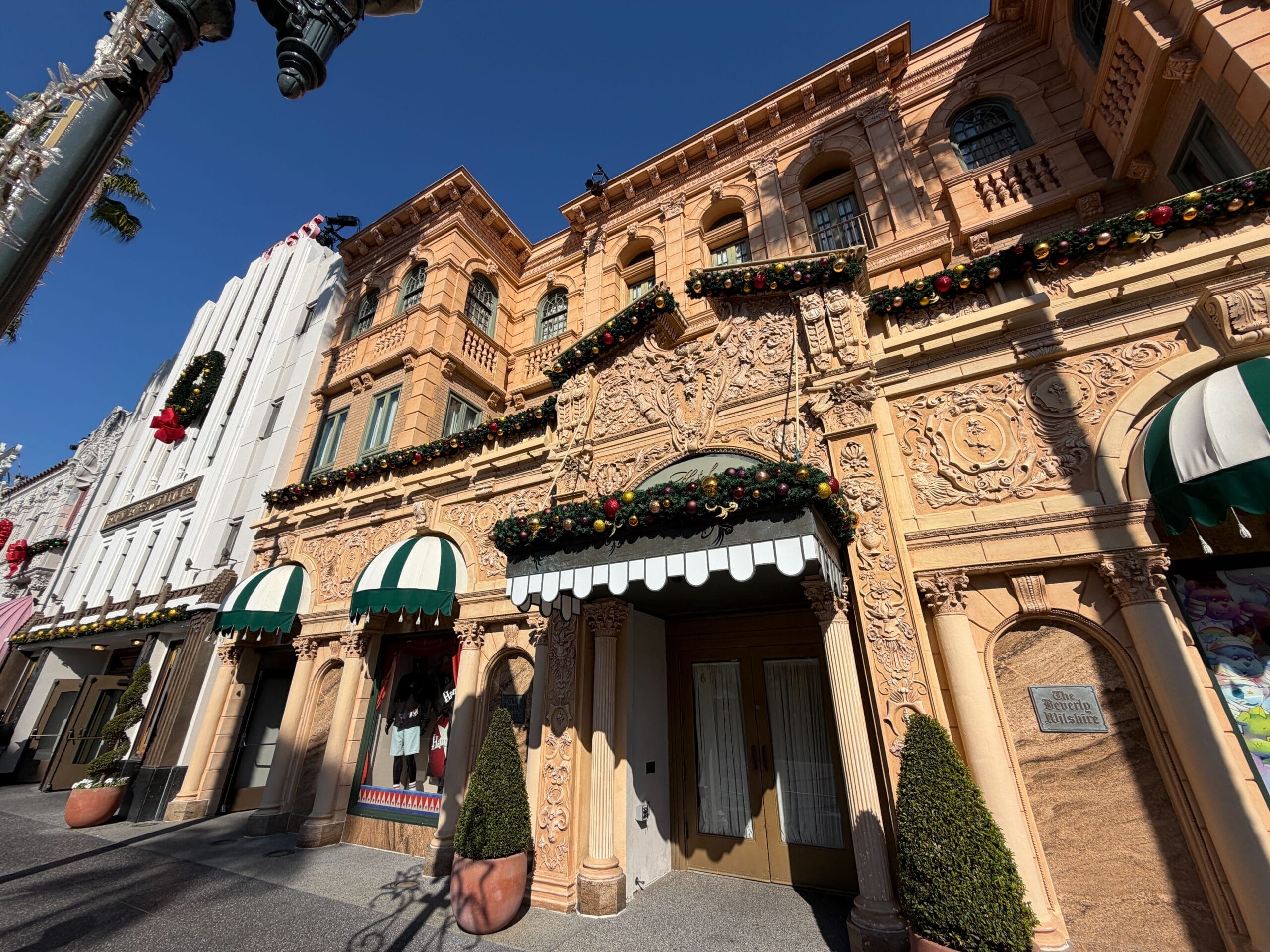 Moving to Hollywood, the area has garland and other décor on building facades, as well as Santa hats on the lampposts lining the street.