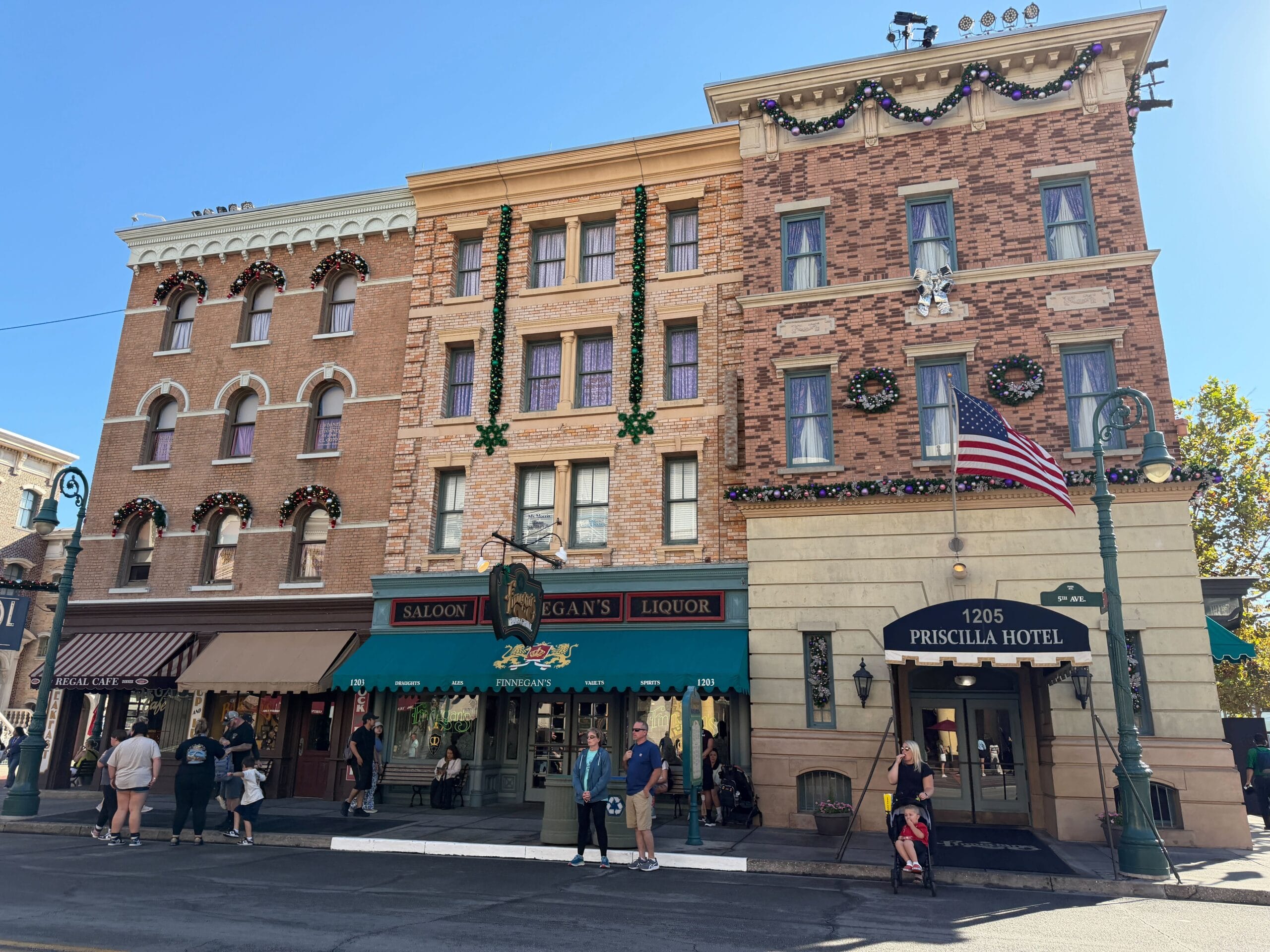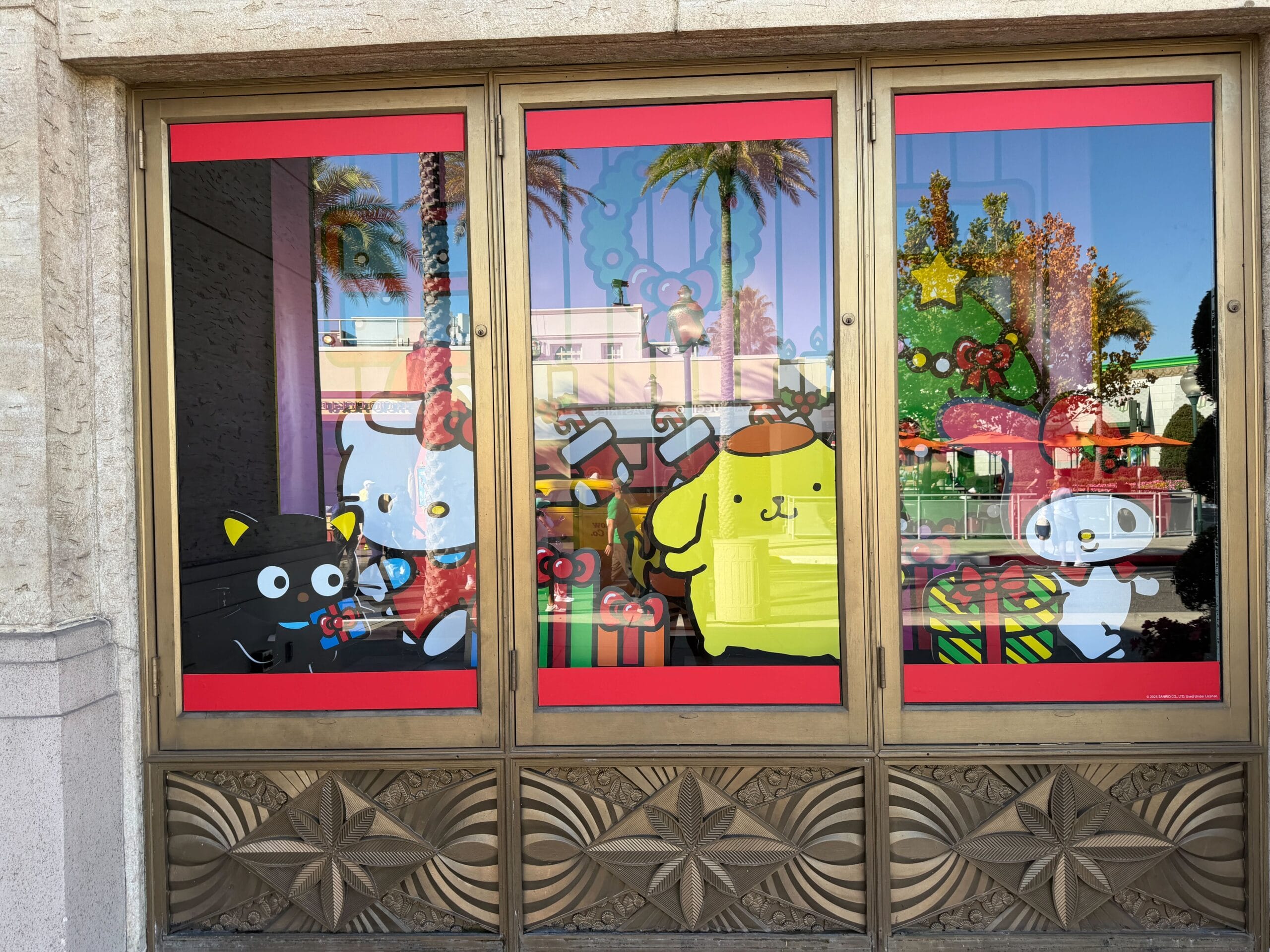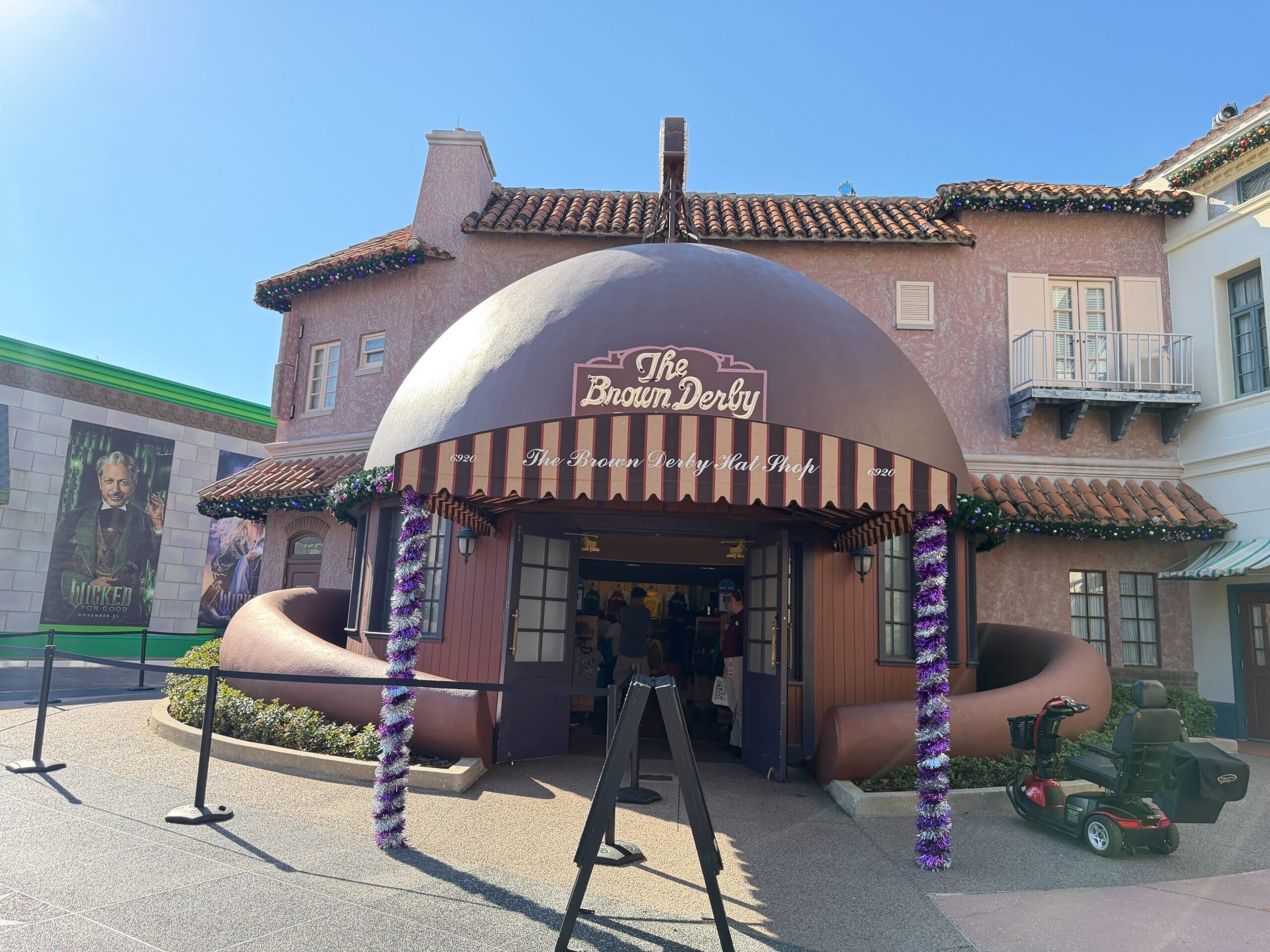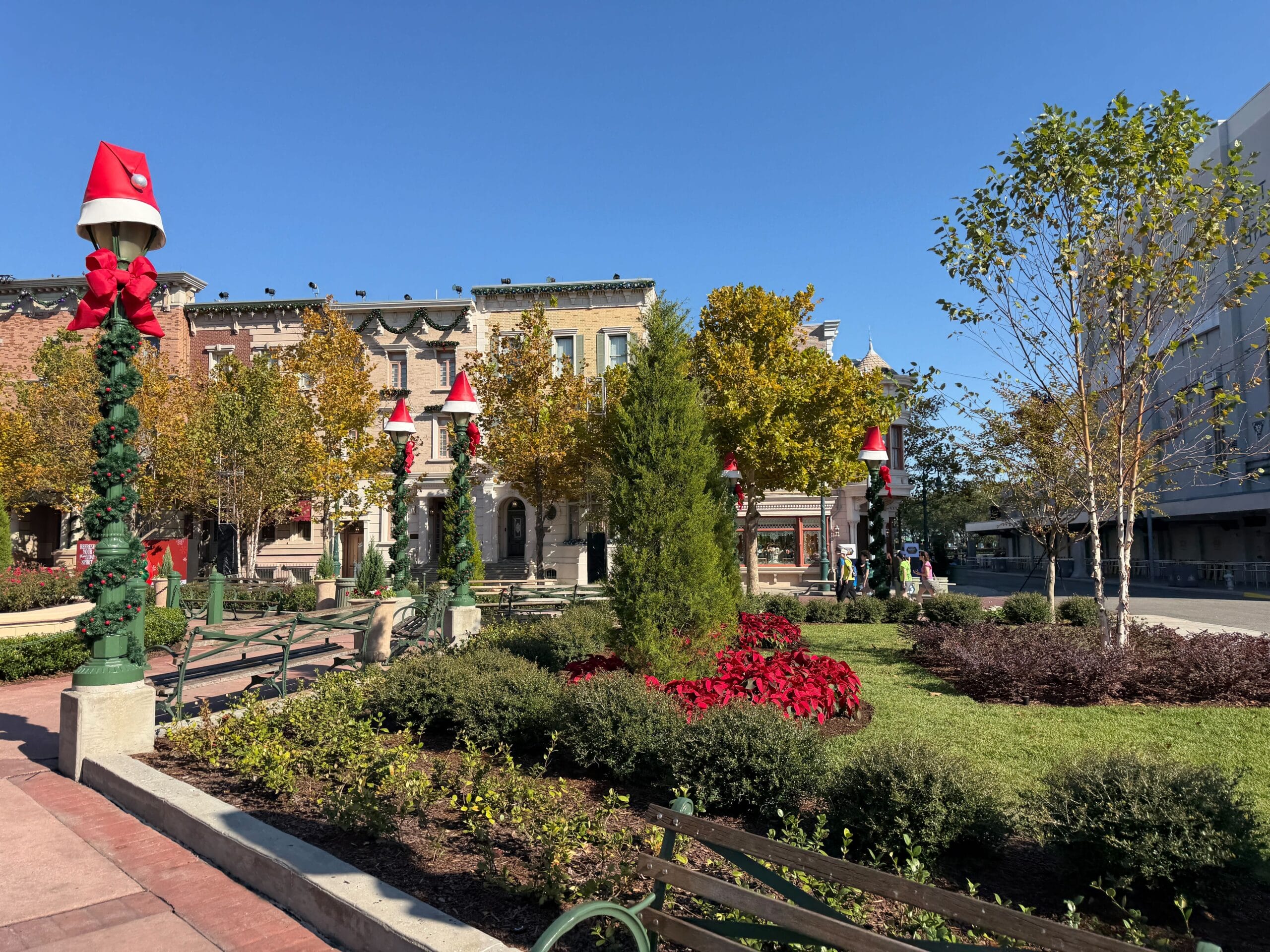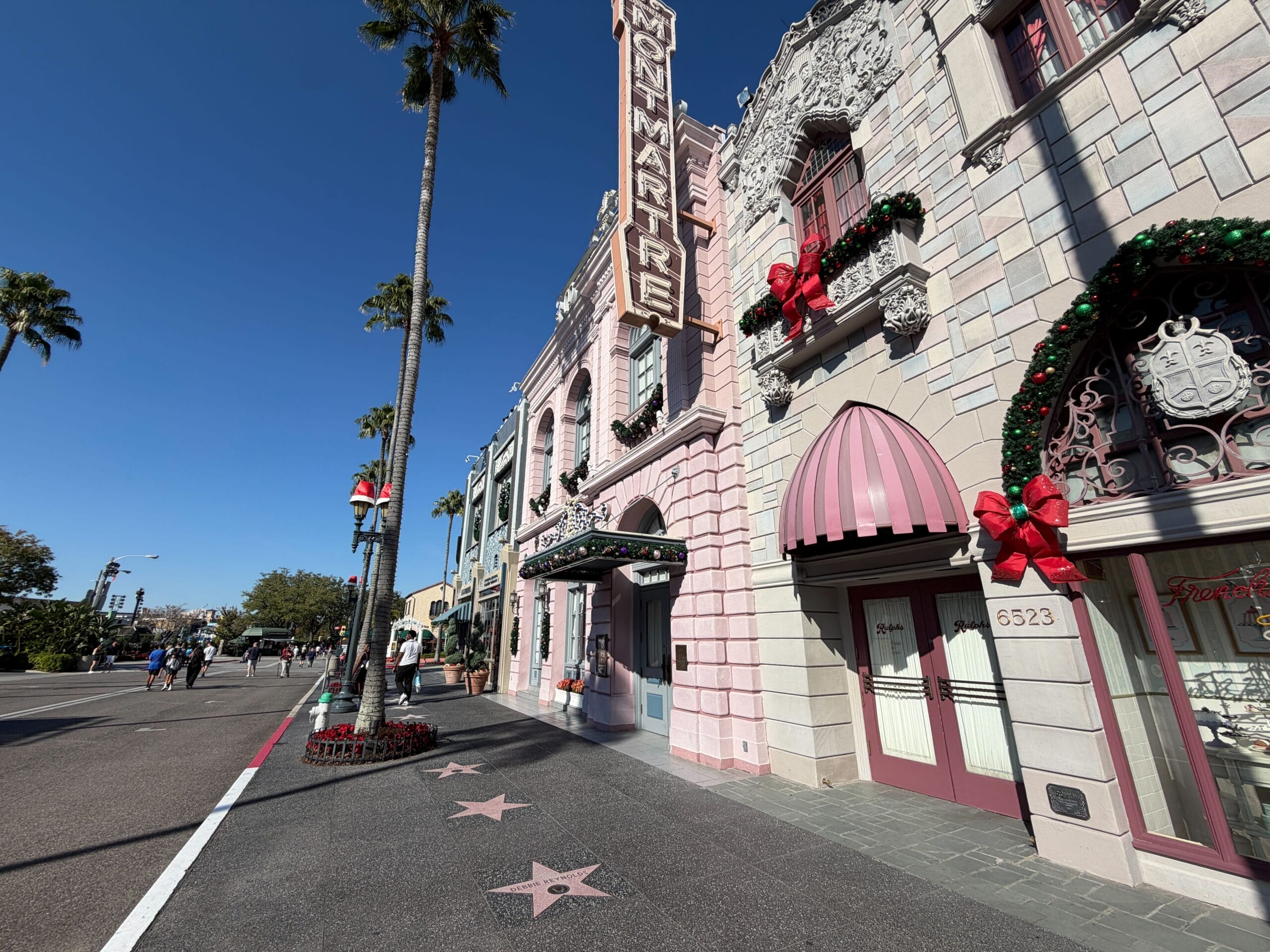 Moving to Hollywood, the area has garland and other décor on building facades, as well as Santa hats on the lampposts lining the street.
