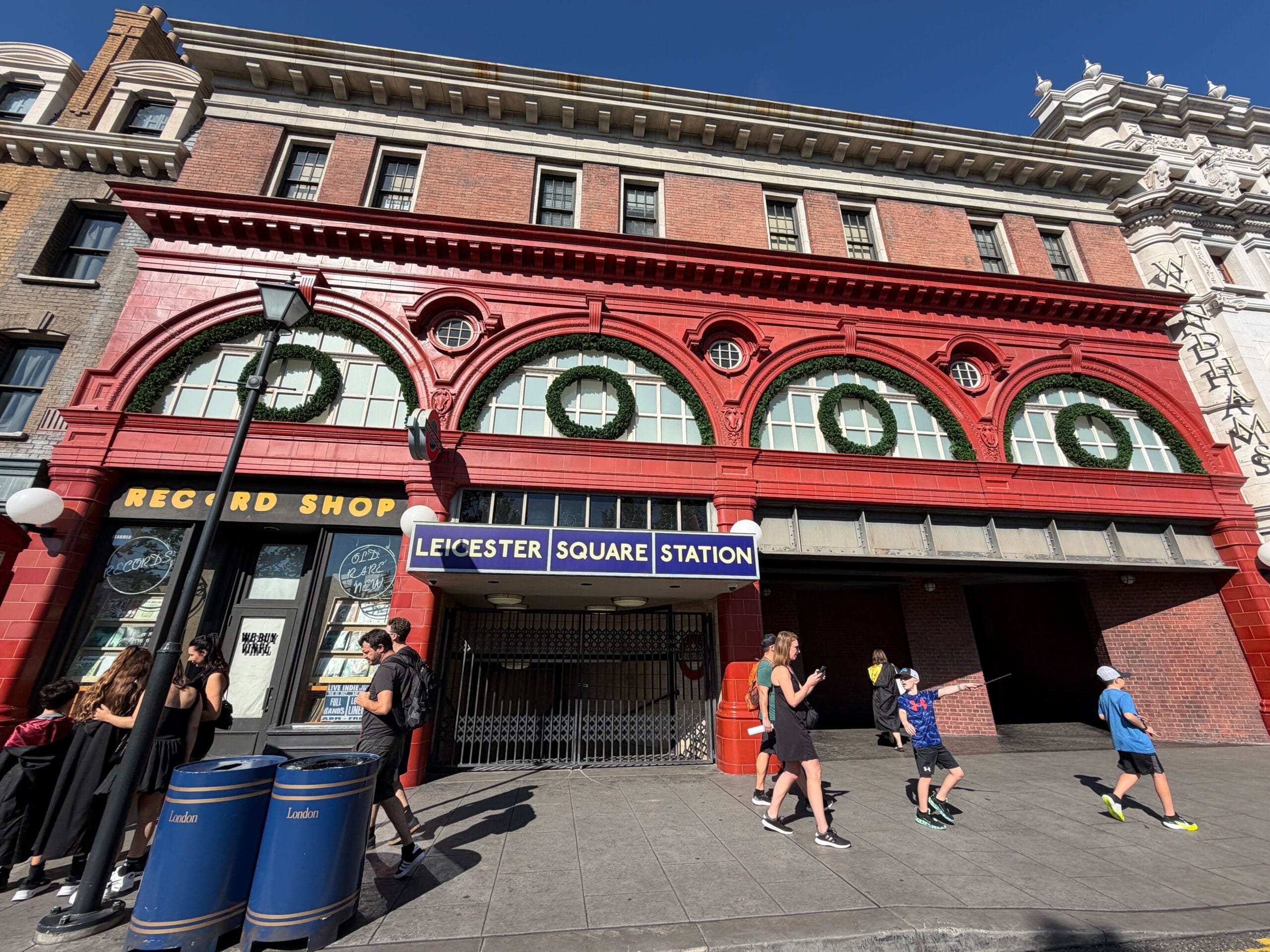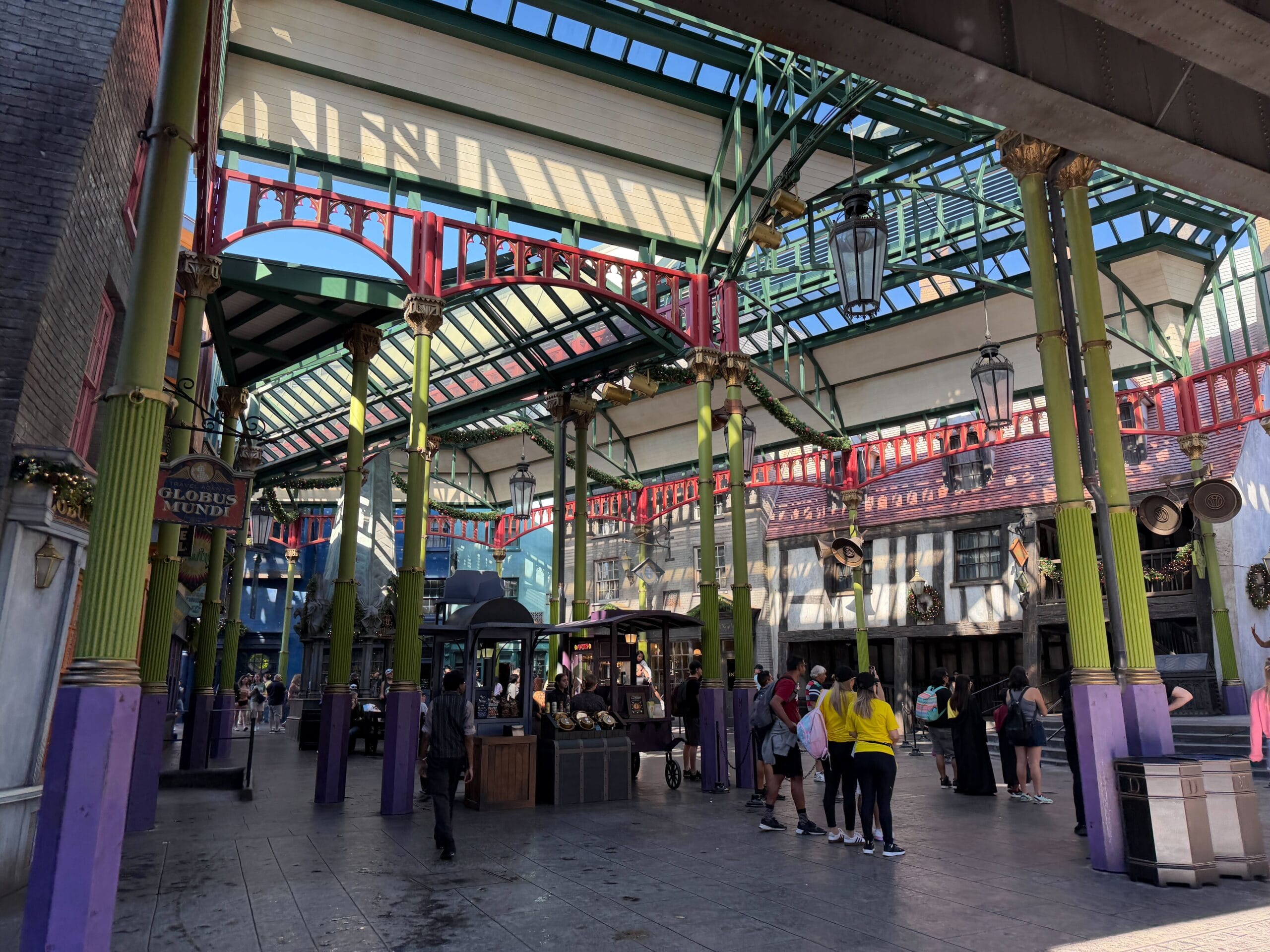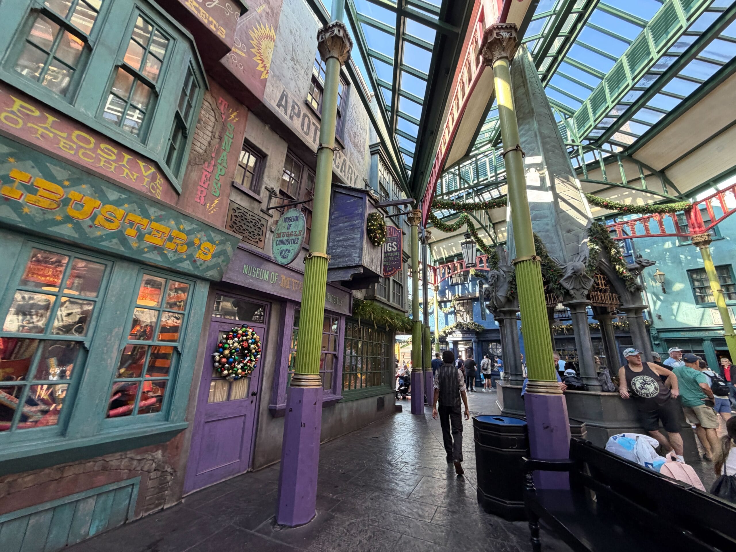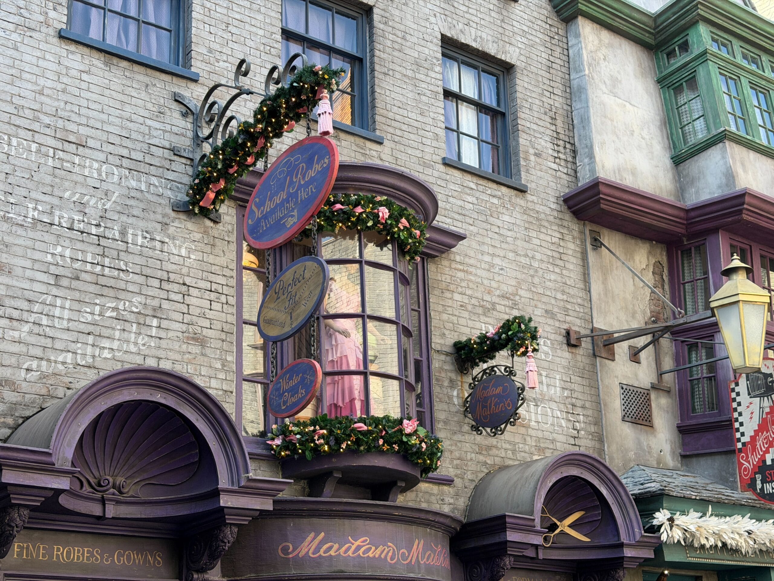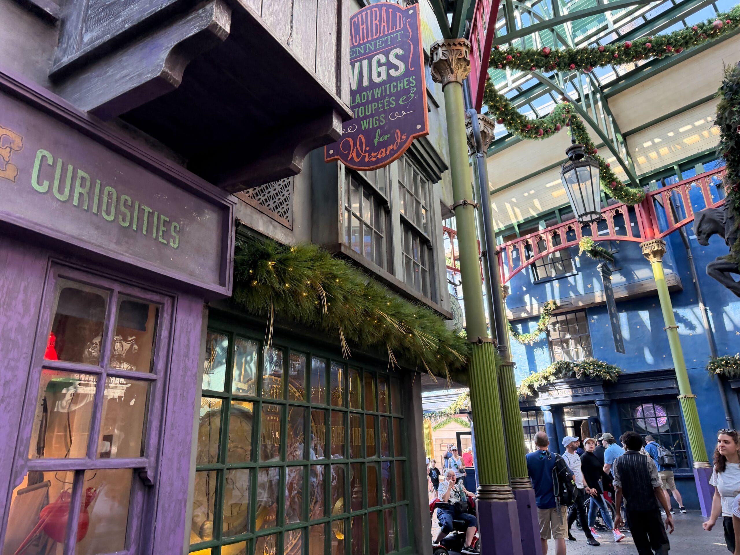 This part of Diagon Alley has garland on the arches.