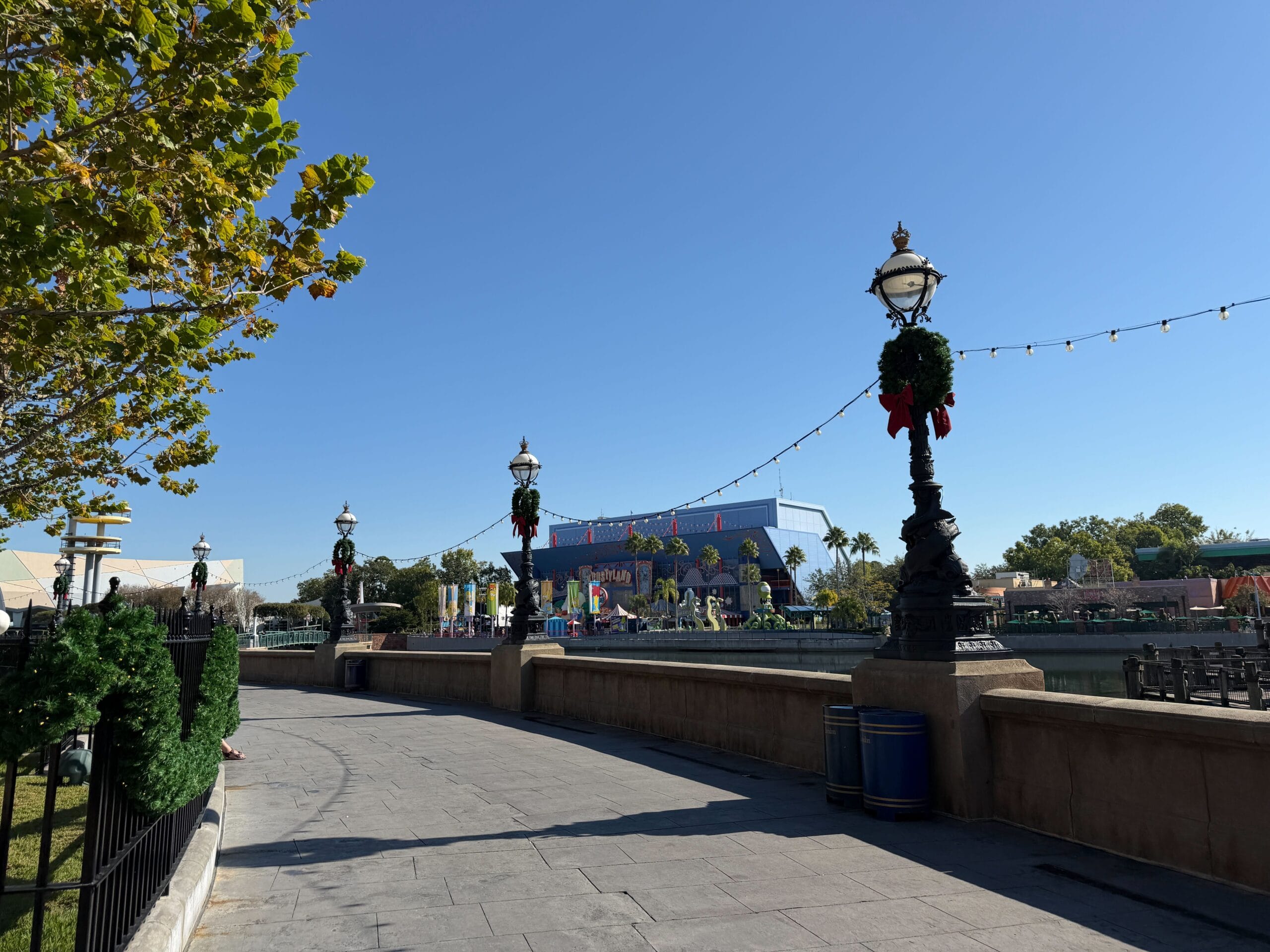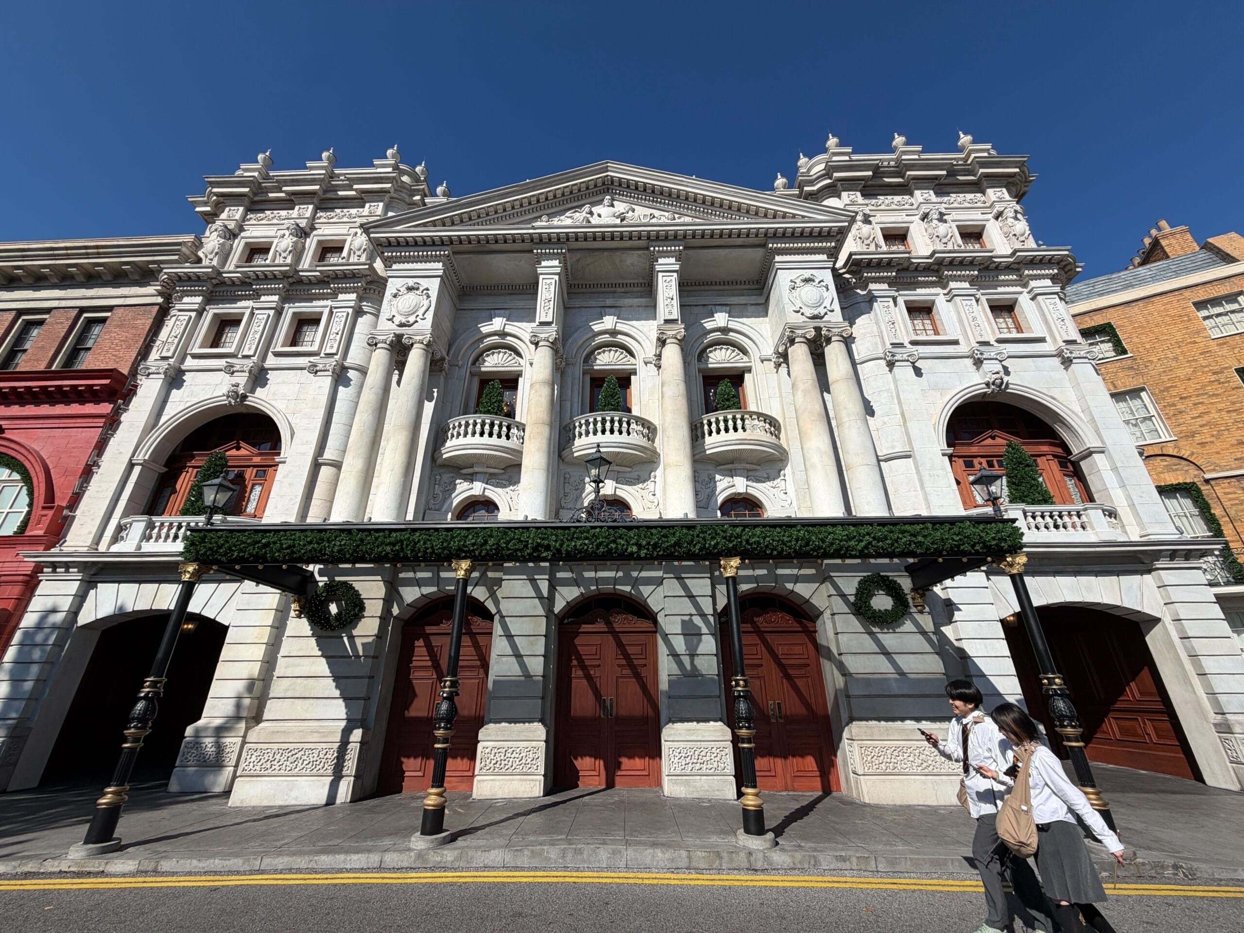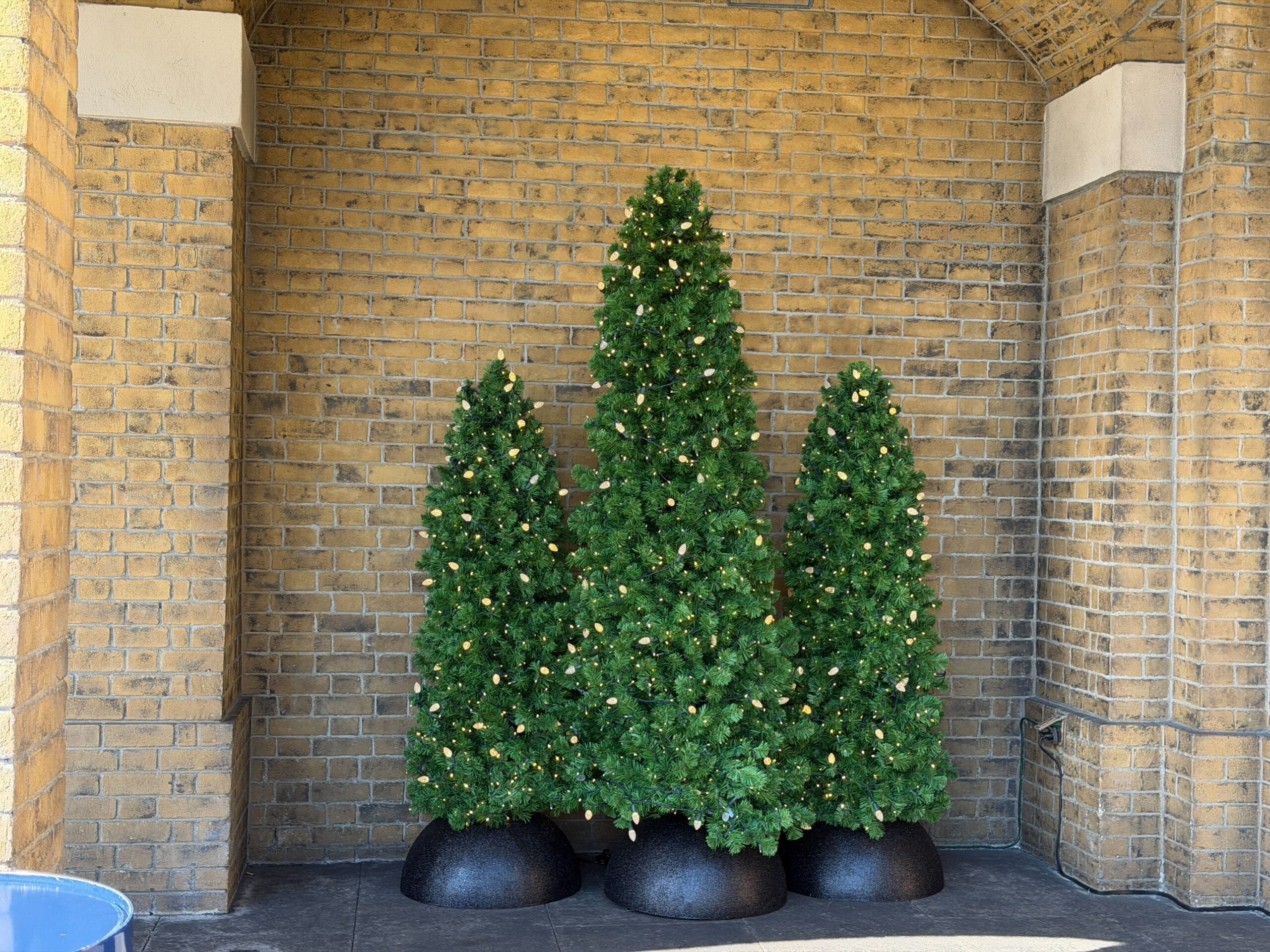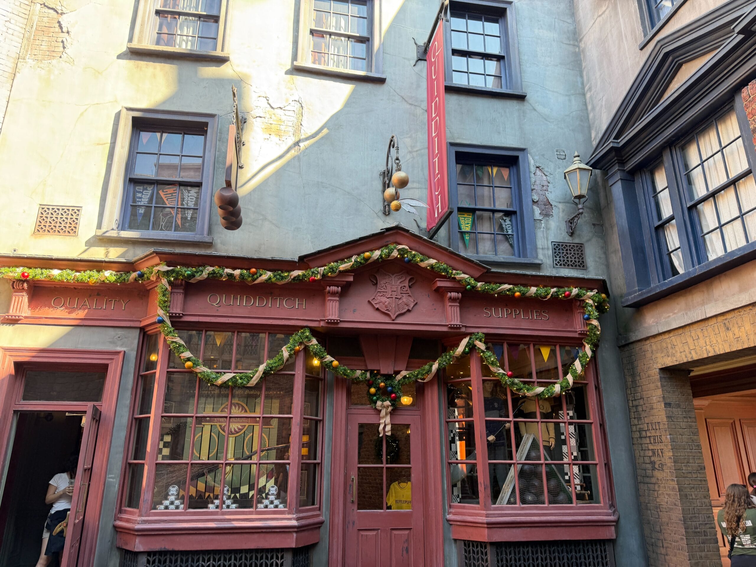 This part of Diagon Alley has garland on the arches.