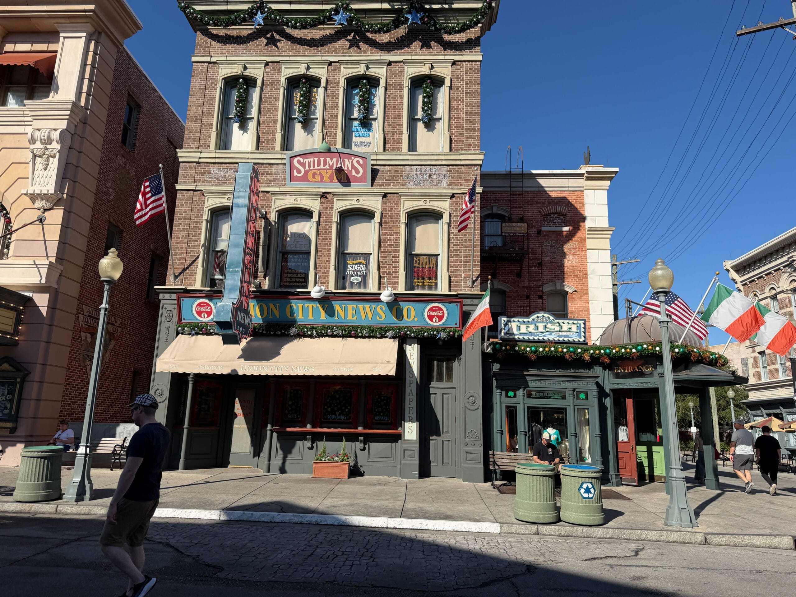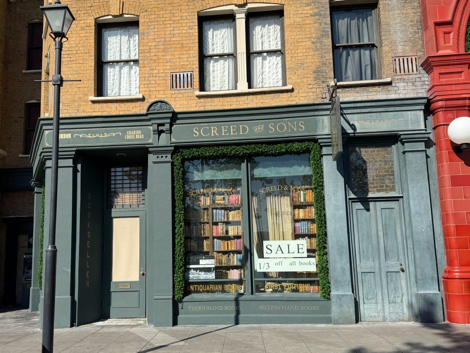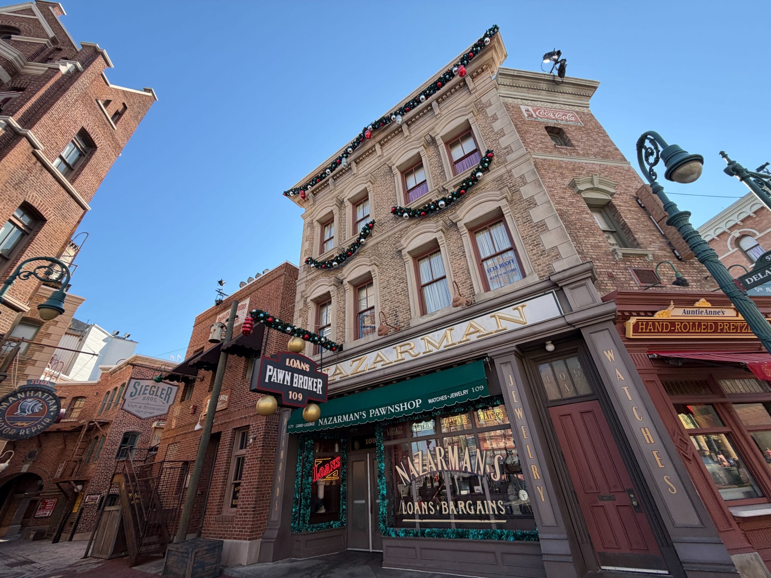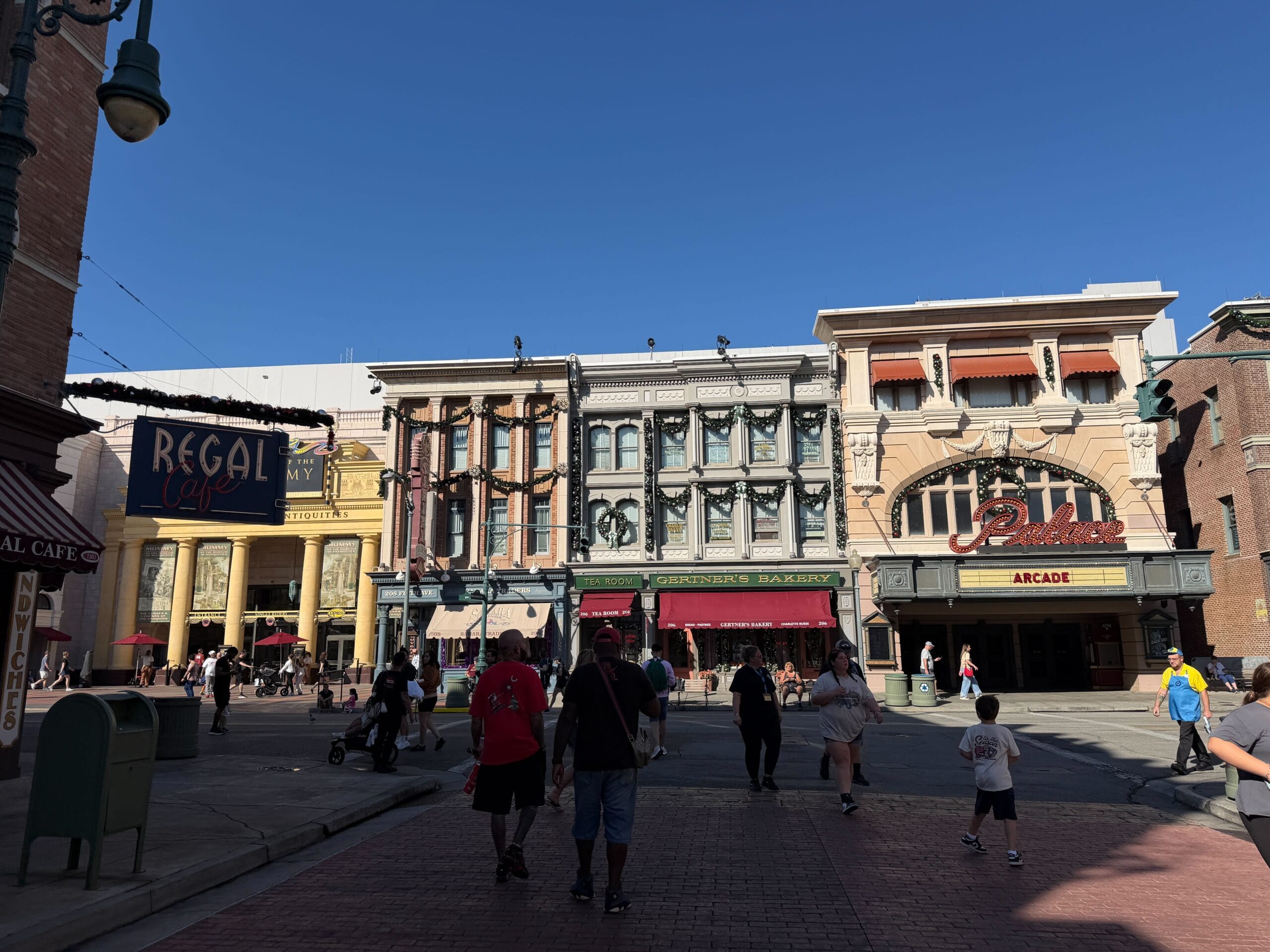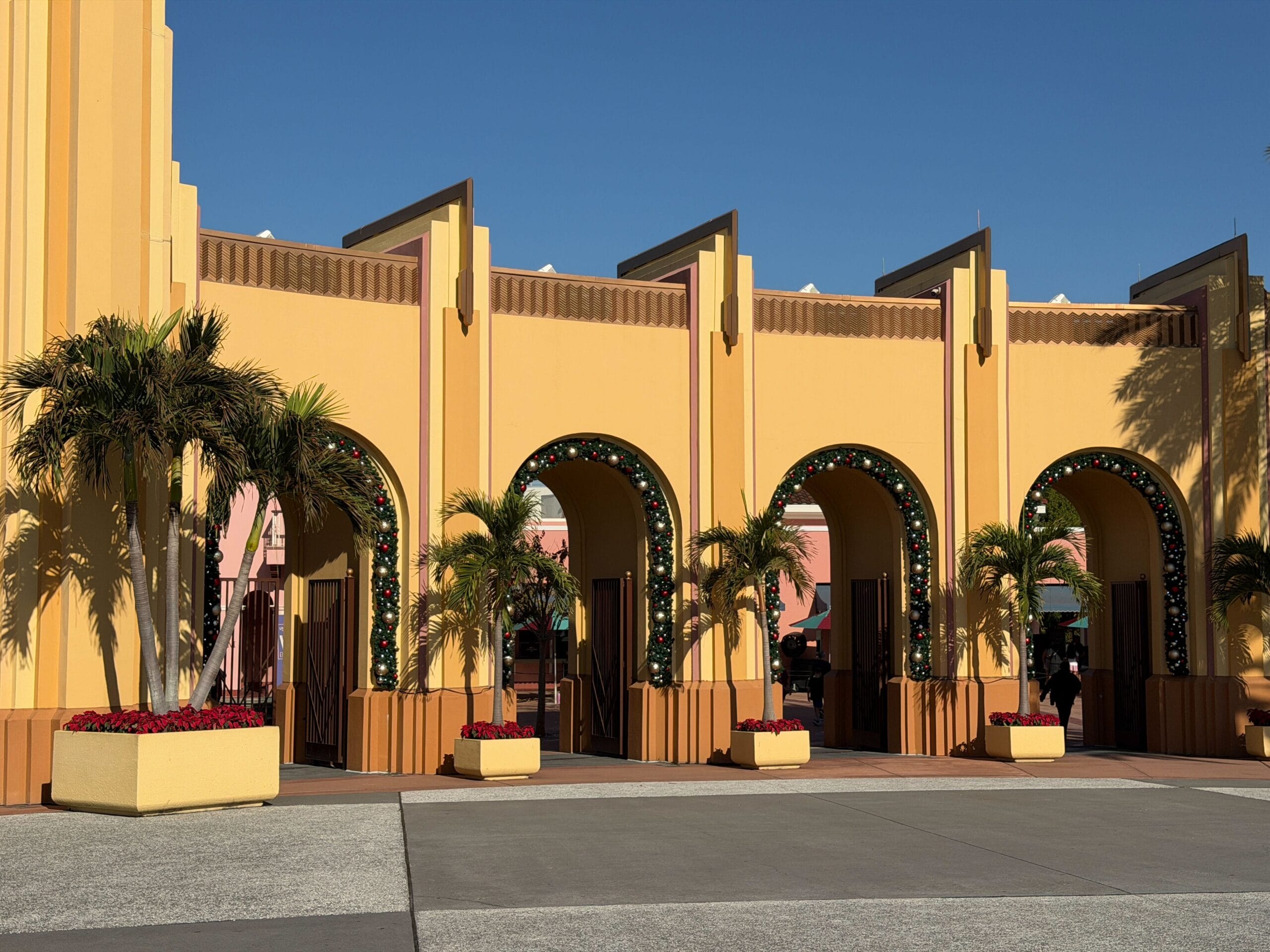 This part of Diagon Alley has garland on the arches.