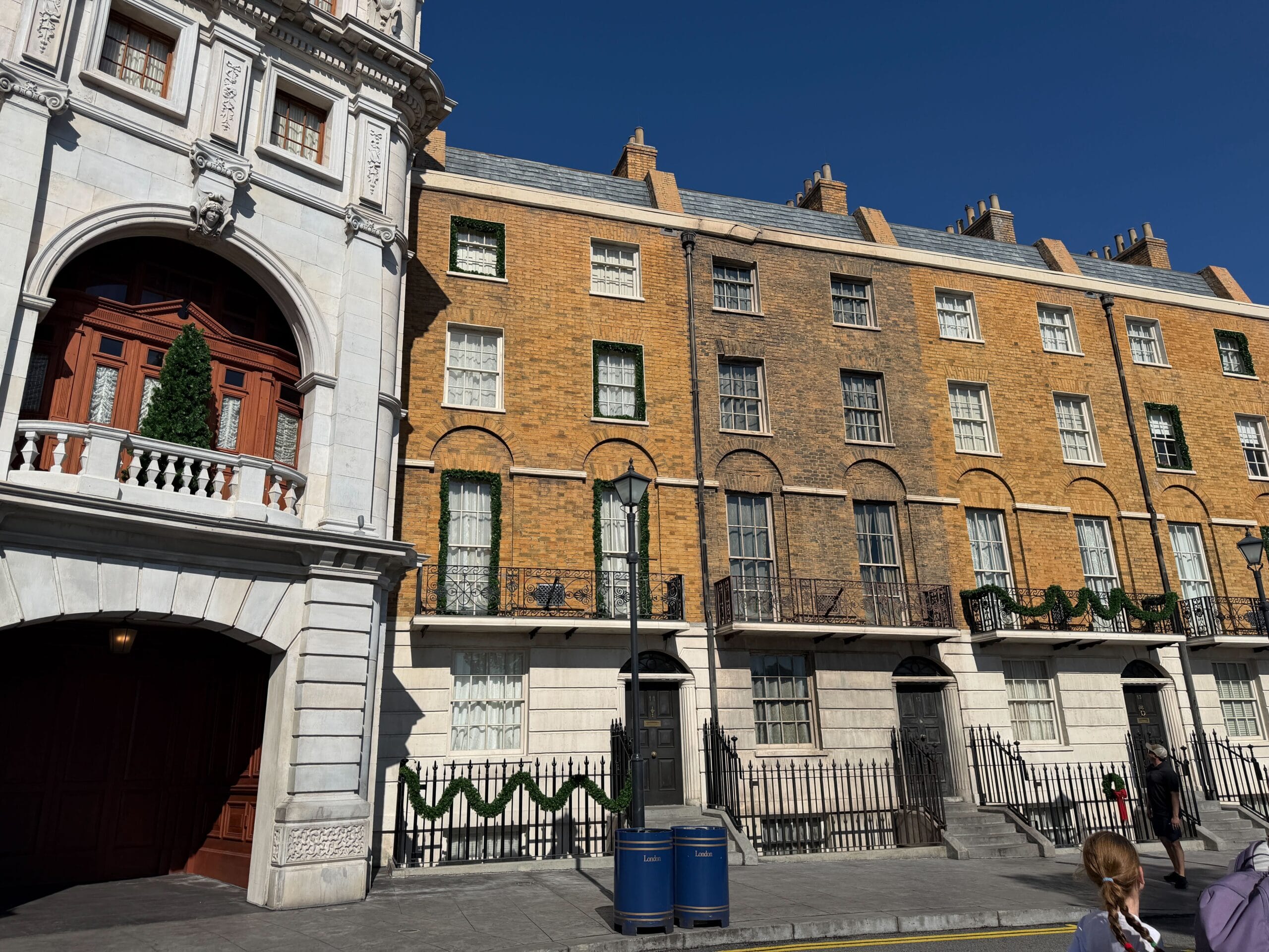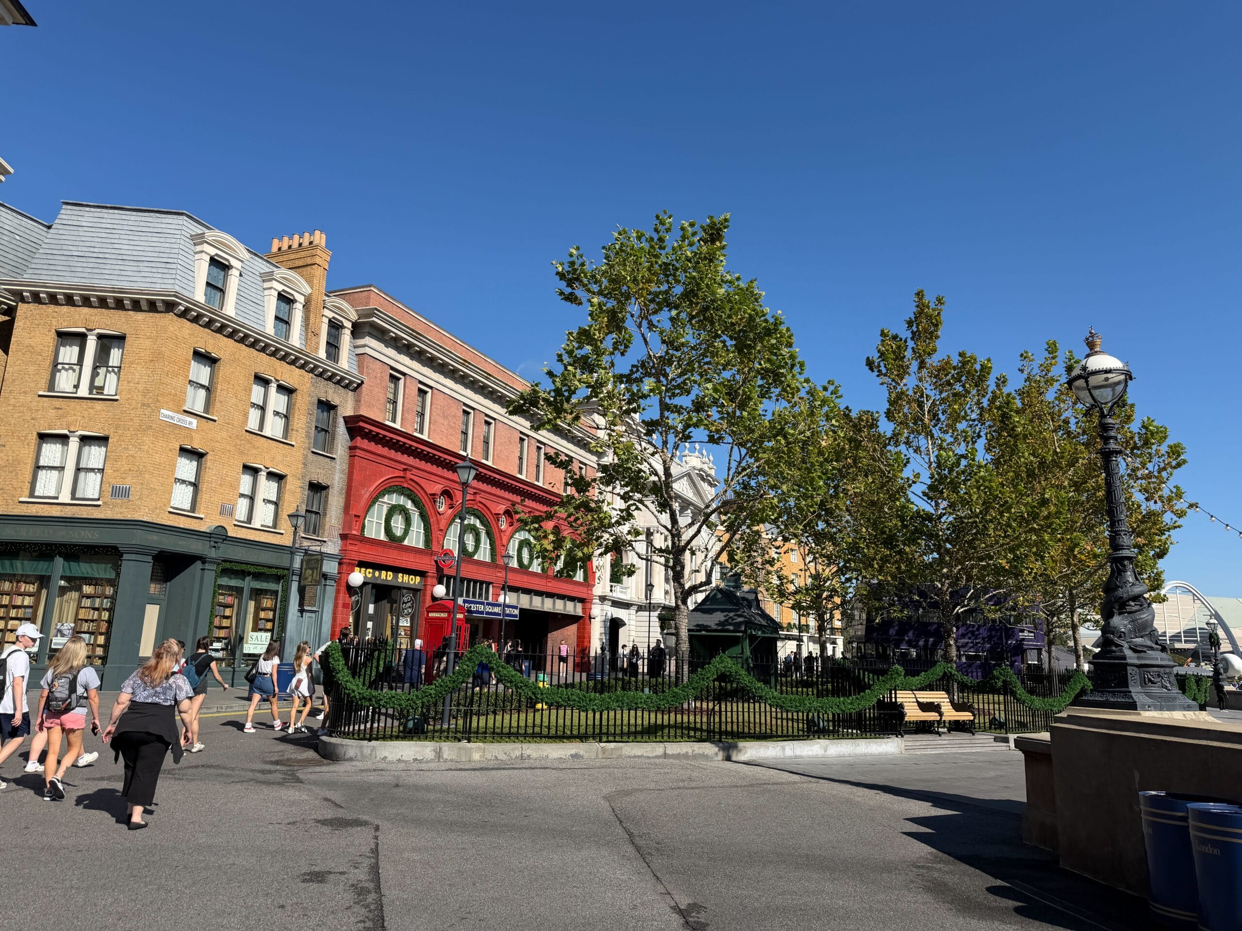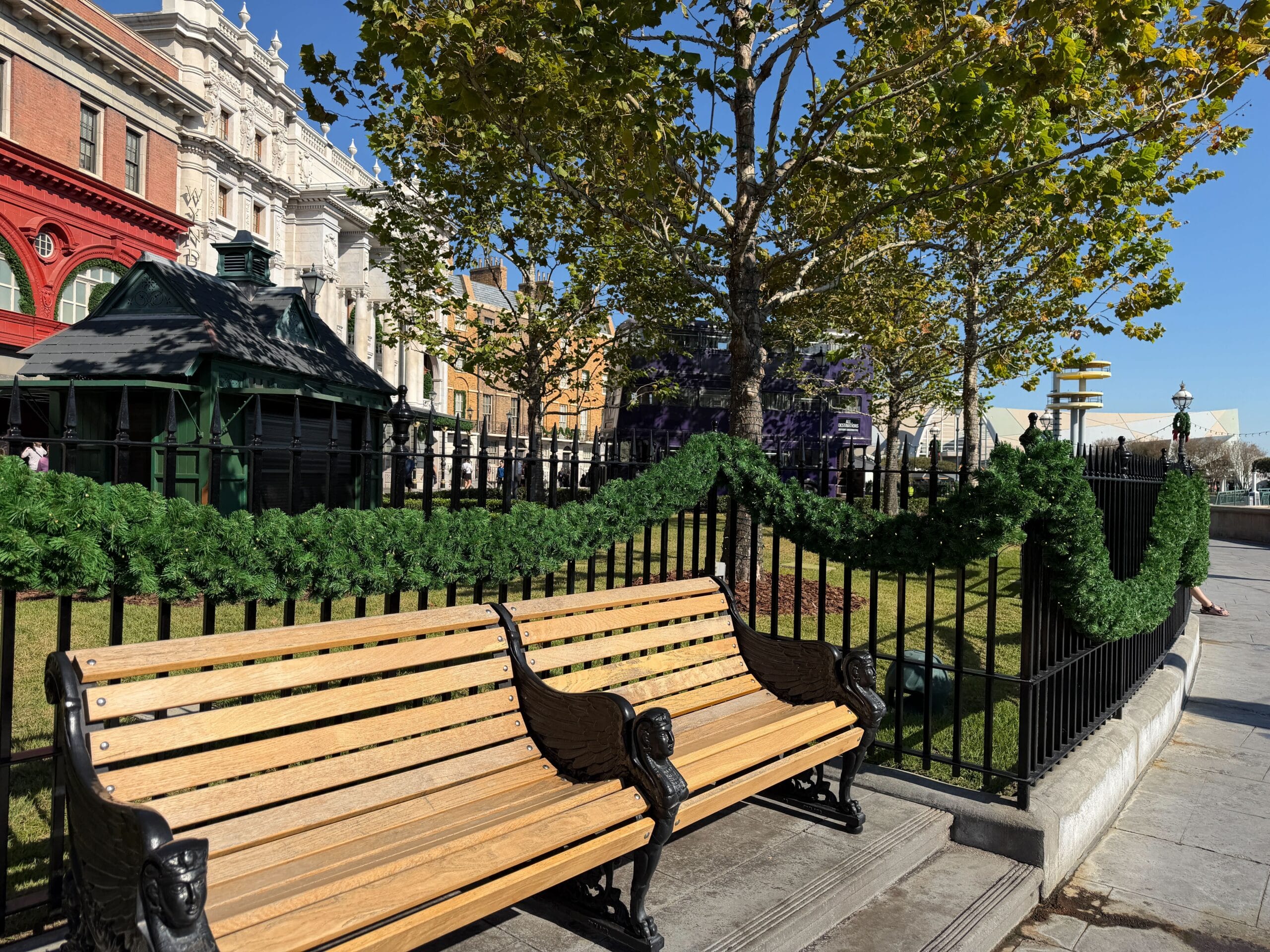 Outside the entrance to Diagon Alley, by the Knight Bus, are fences lined with garland and lampposts with wreaths.
