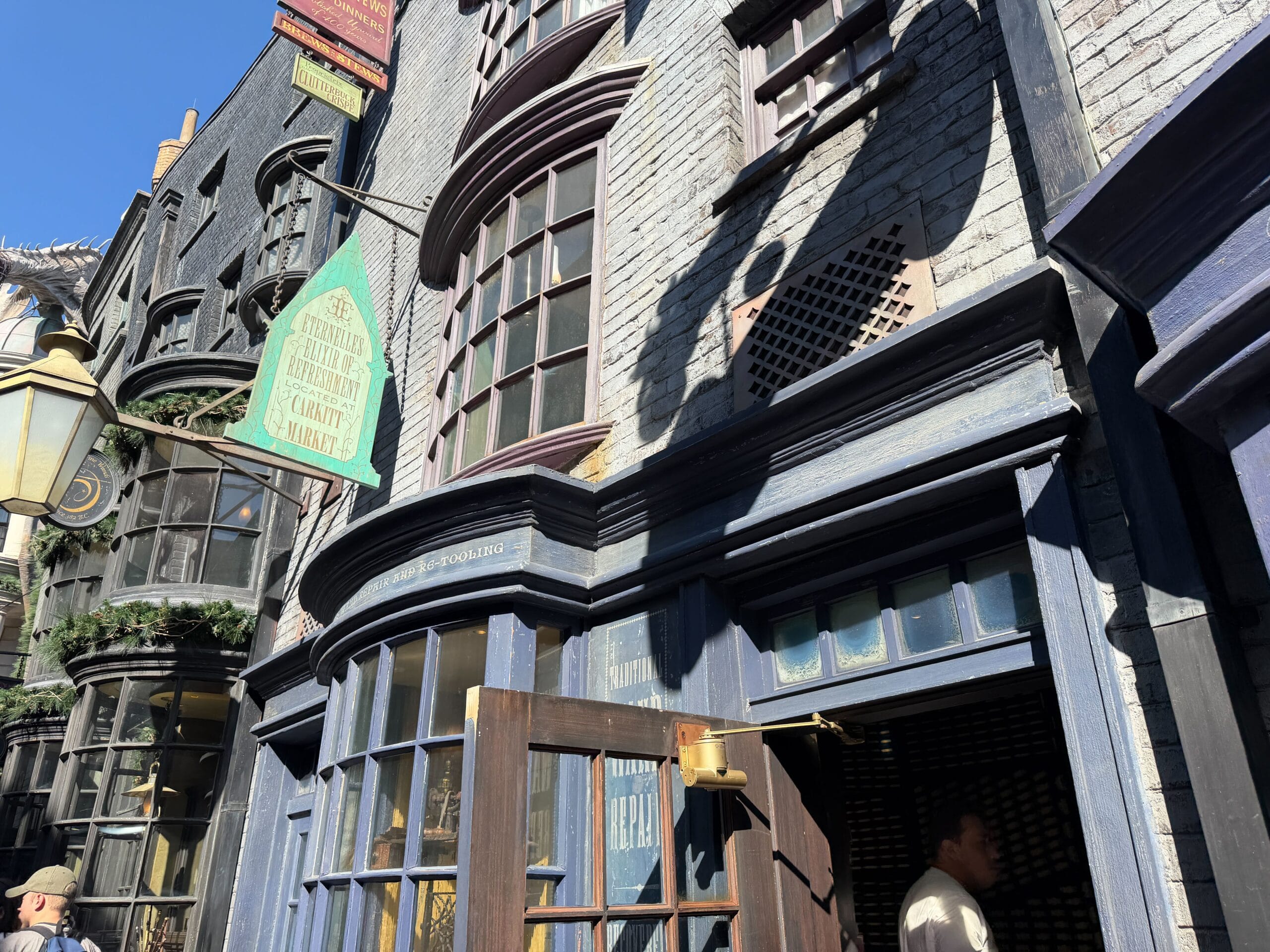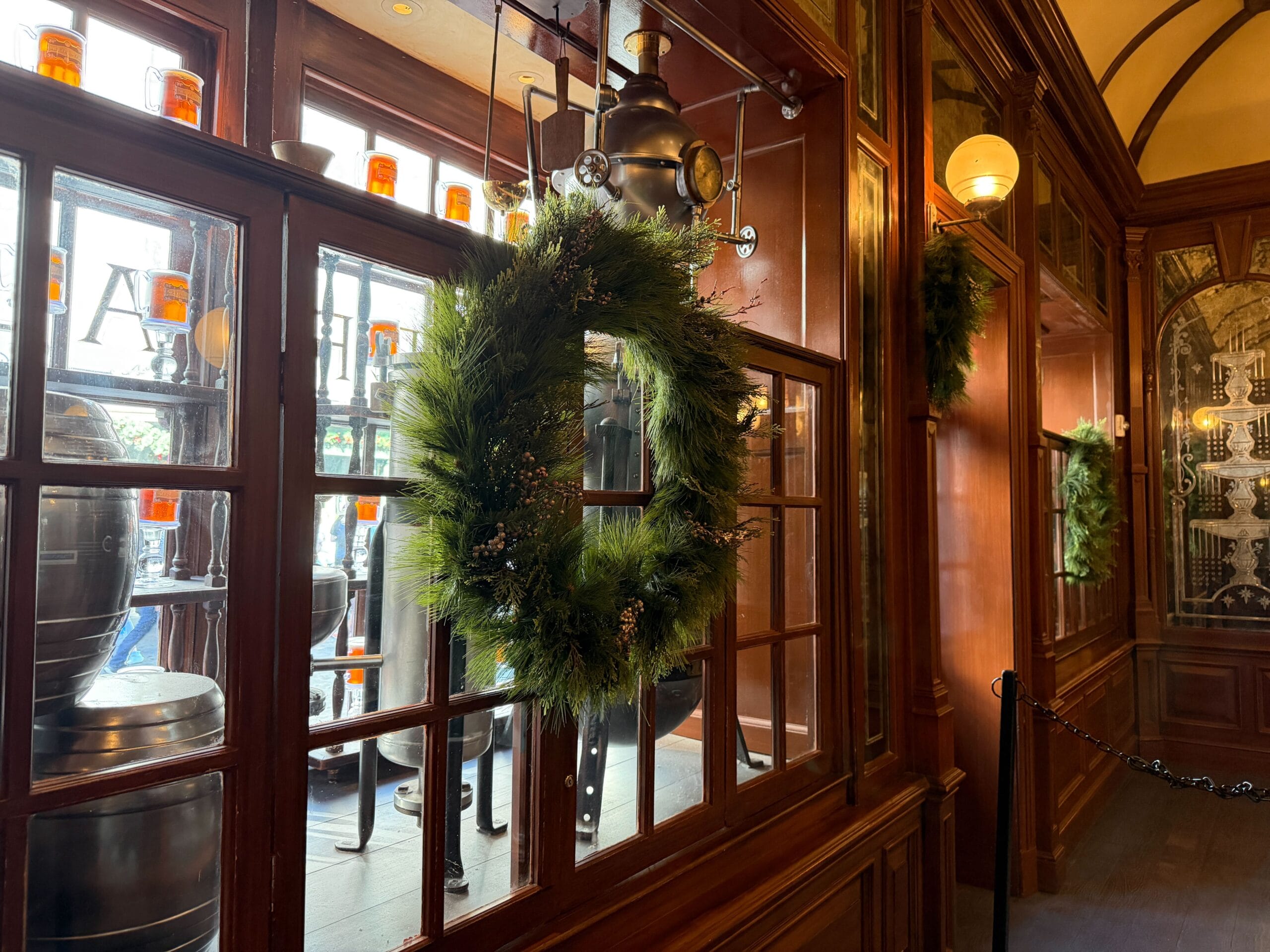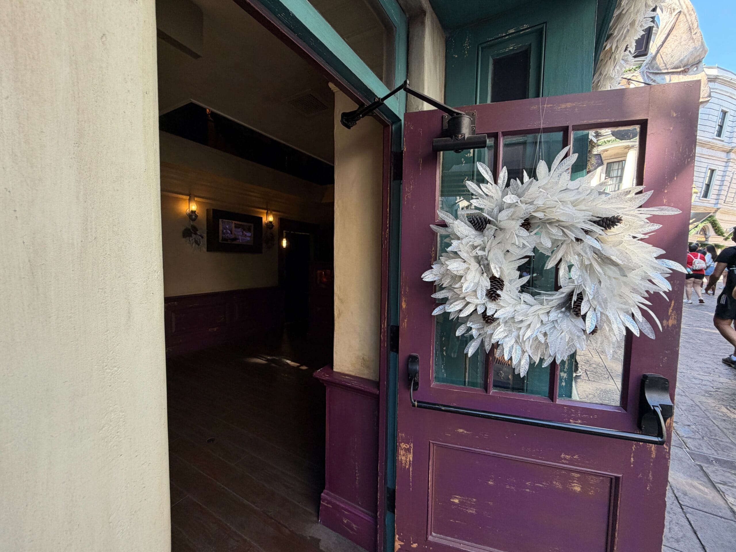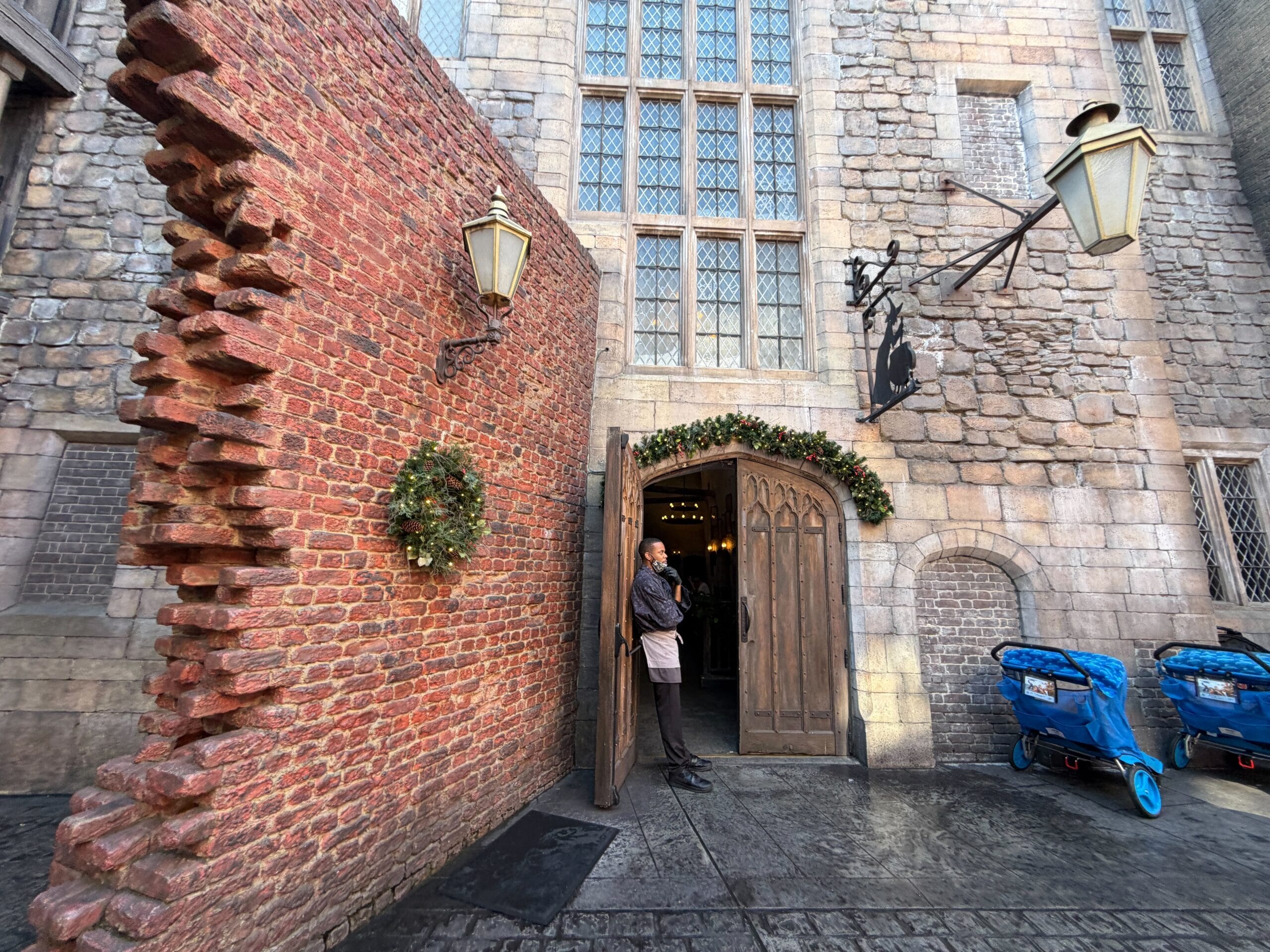 Decorations in Diagon Alley begin right away with a wreath at the magical brick wall entrance. Garland also hangs above the entrance to Leaky Cauldron.