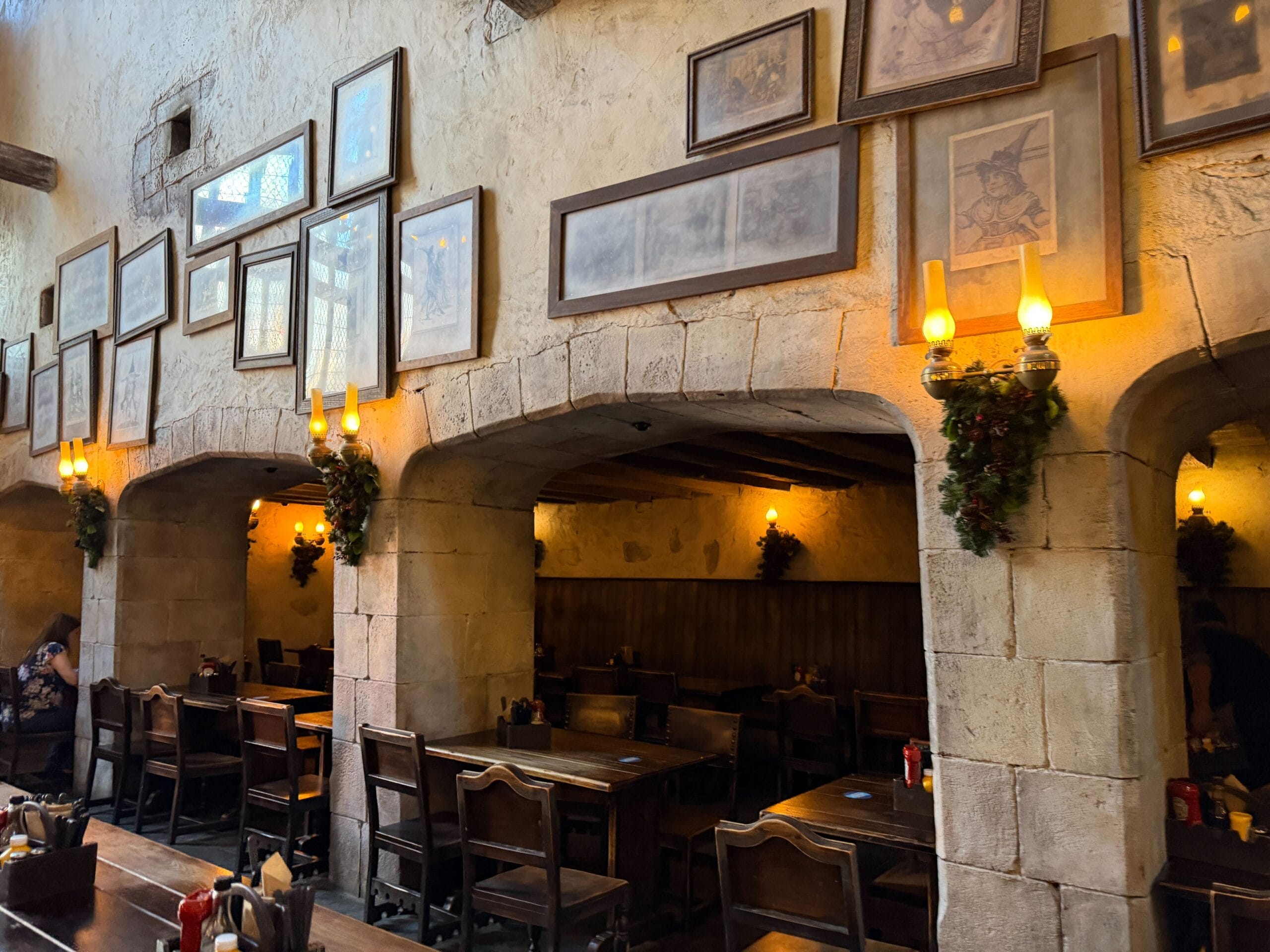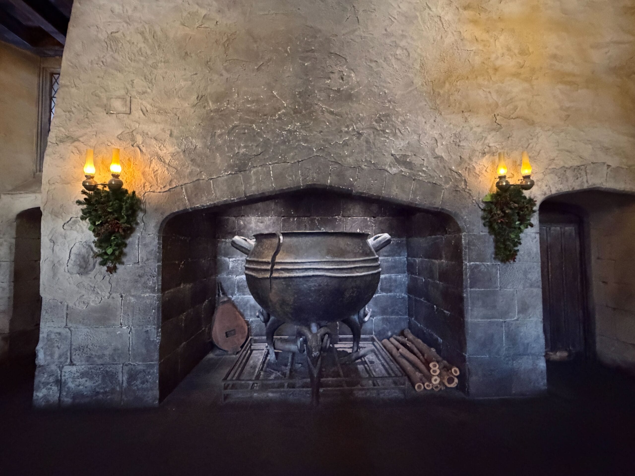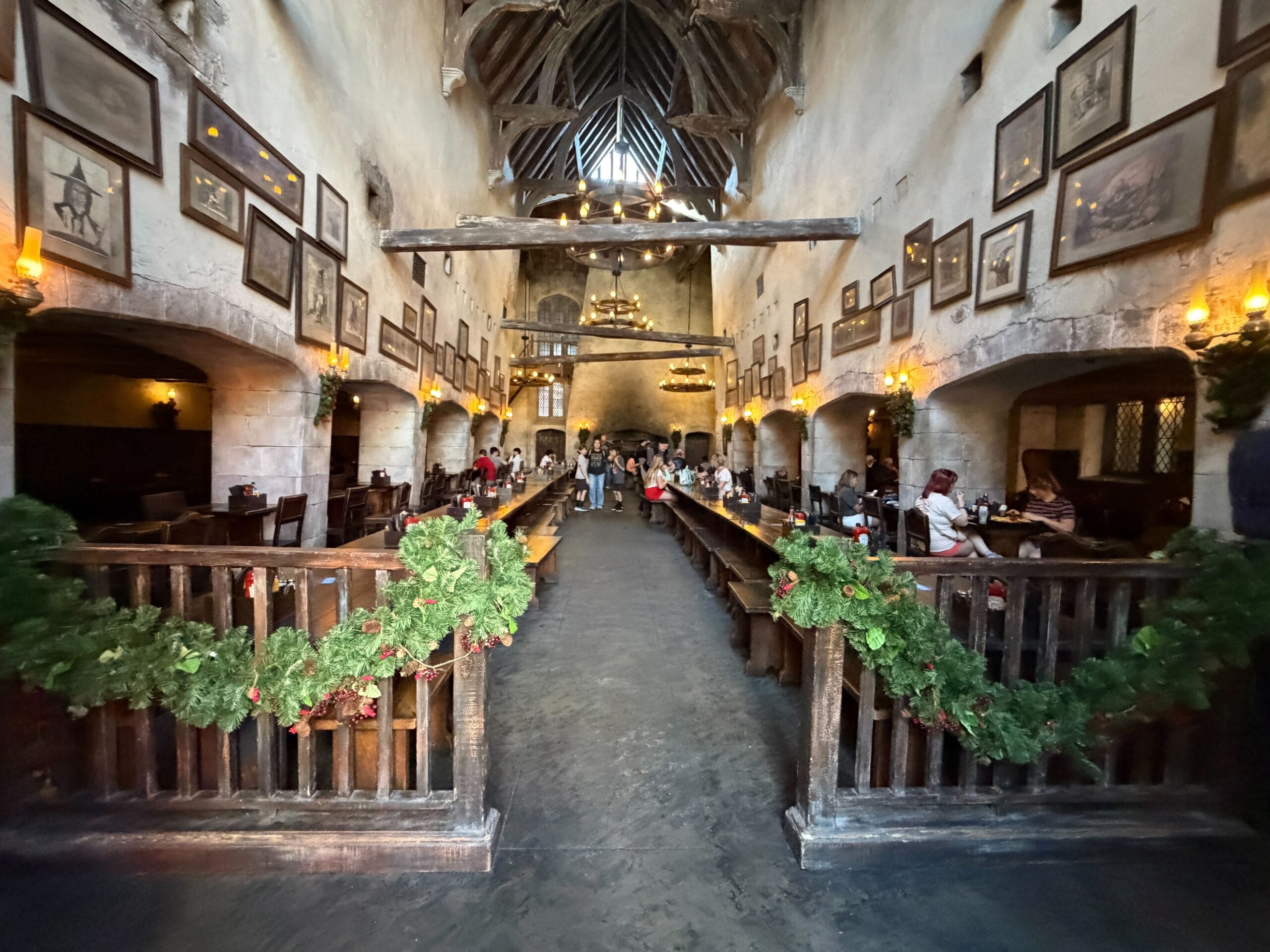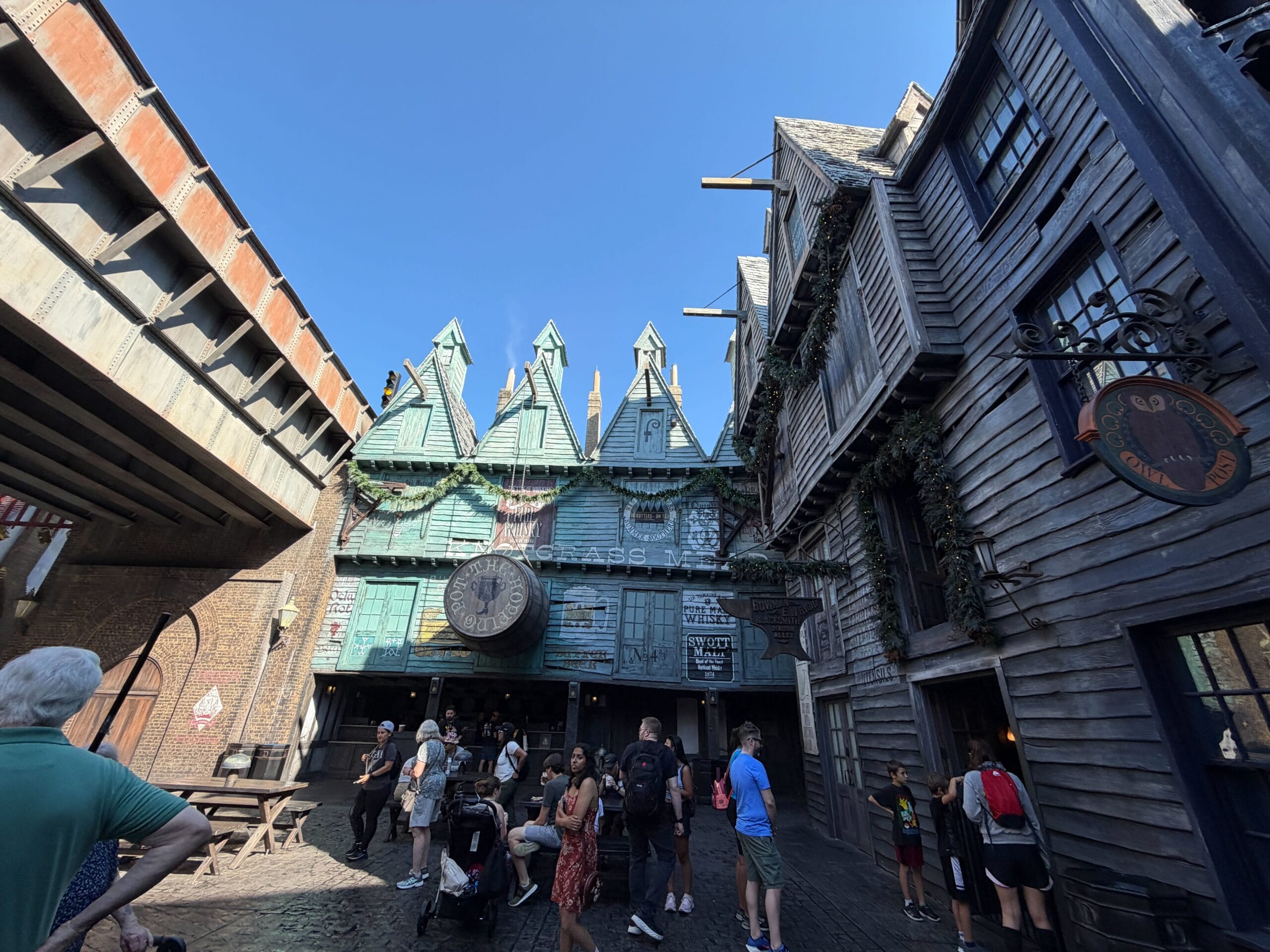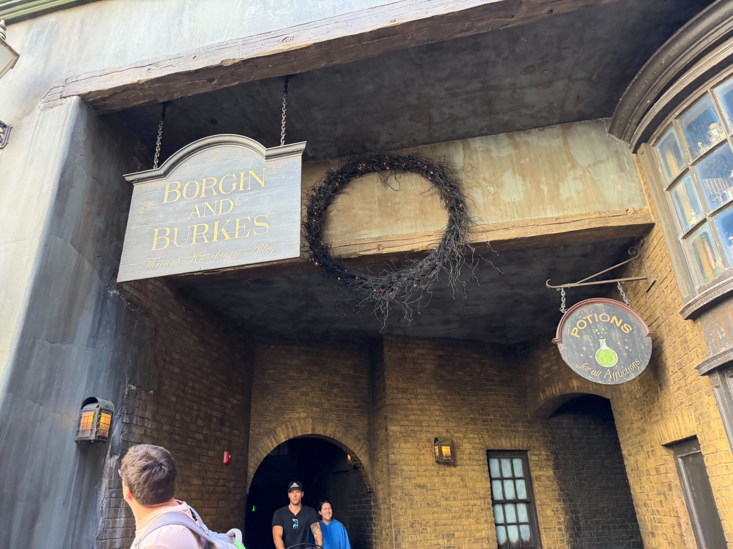 Decorations in Diagon Alley begin right away with a wreath at the magical brick wall entrance. Garland also hangs above the entrance to Leaky Cauldron.