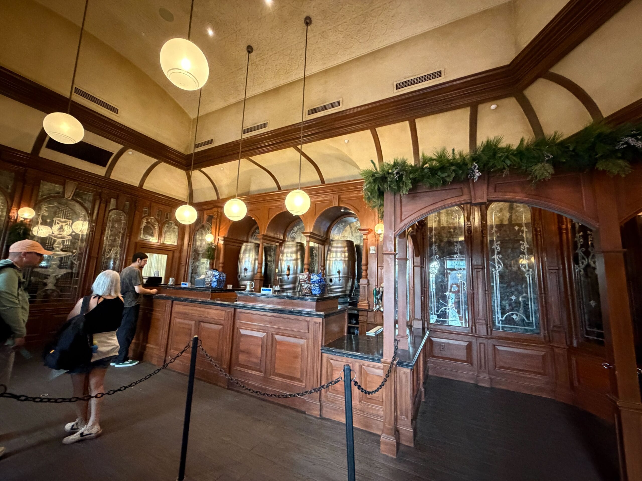 Leaky Cauldron has garland full of berries, pinecones, and twigs along the interior wood banisters.