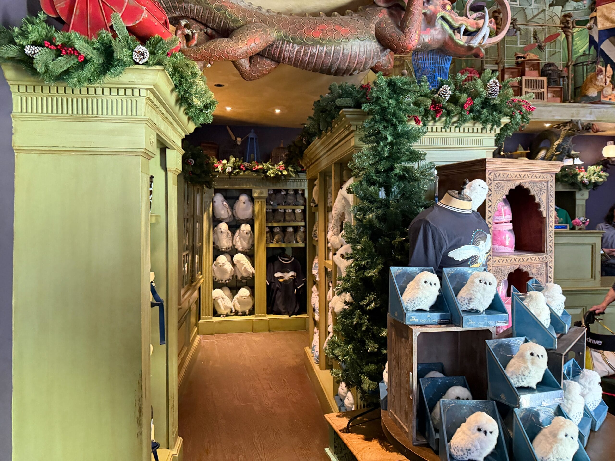 Garland made from white feathers and pinecones line the top of Eeylops Owl Emporium and a matching wreath rests on the entrance door. The decorations continue inside the menagerie with garland covered in pinecones and holly.