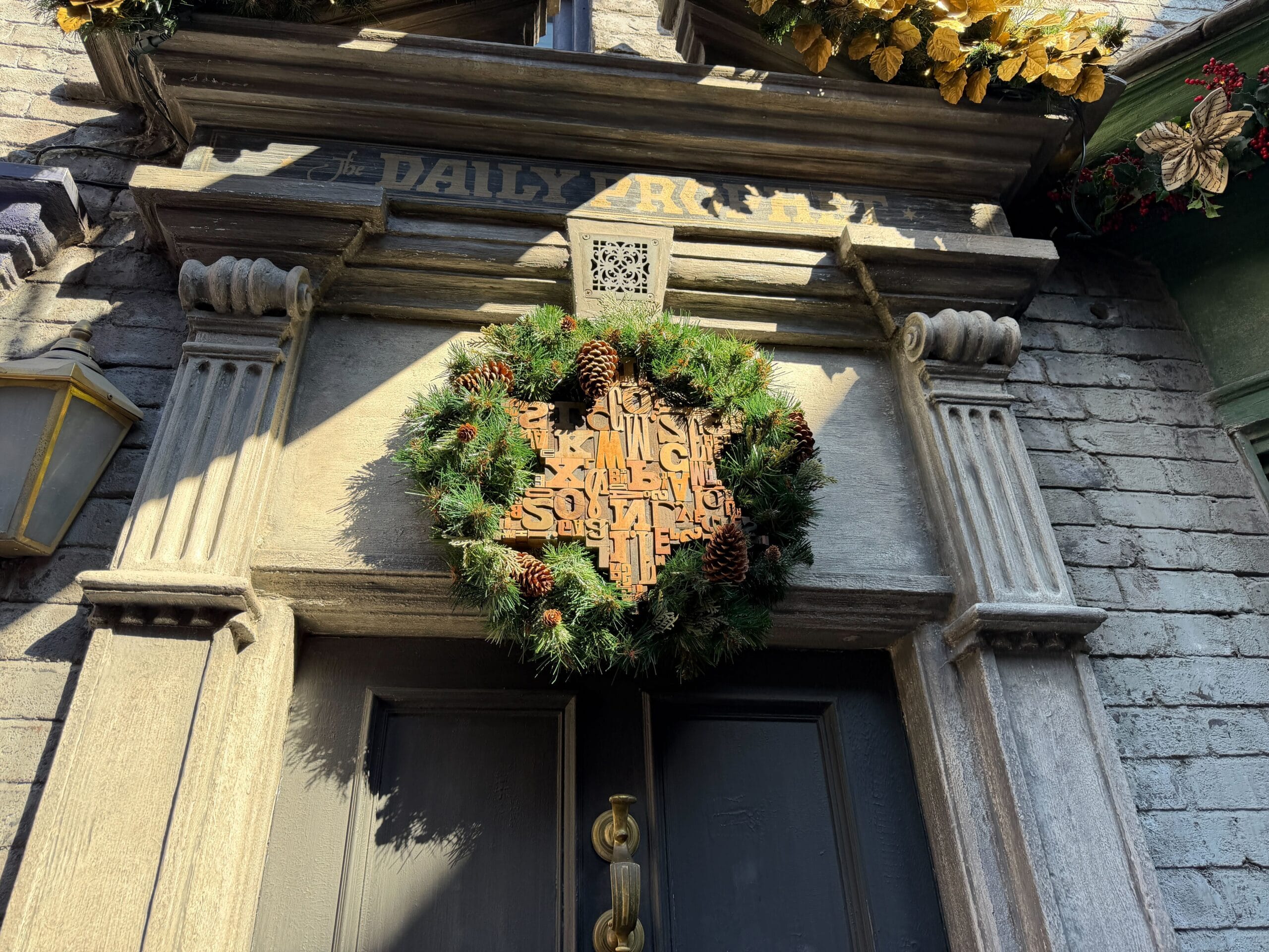 Decorations are on the entrance to The Daily Prophet as well.