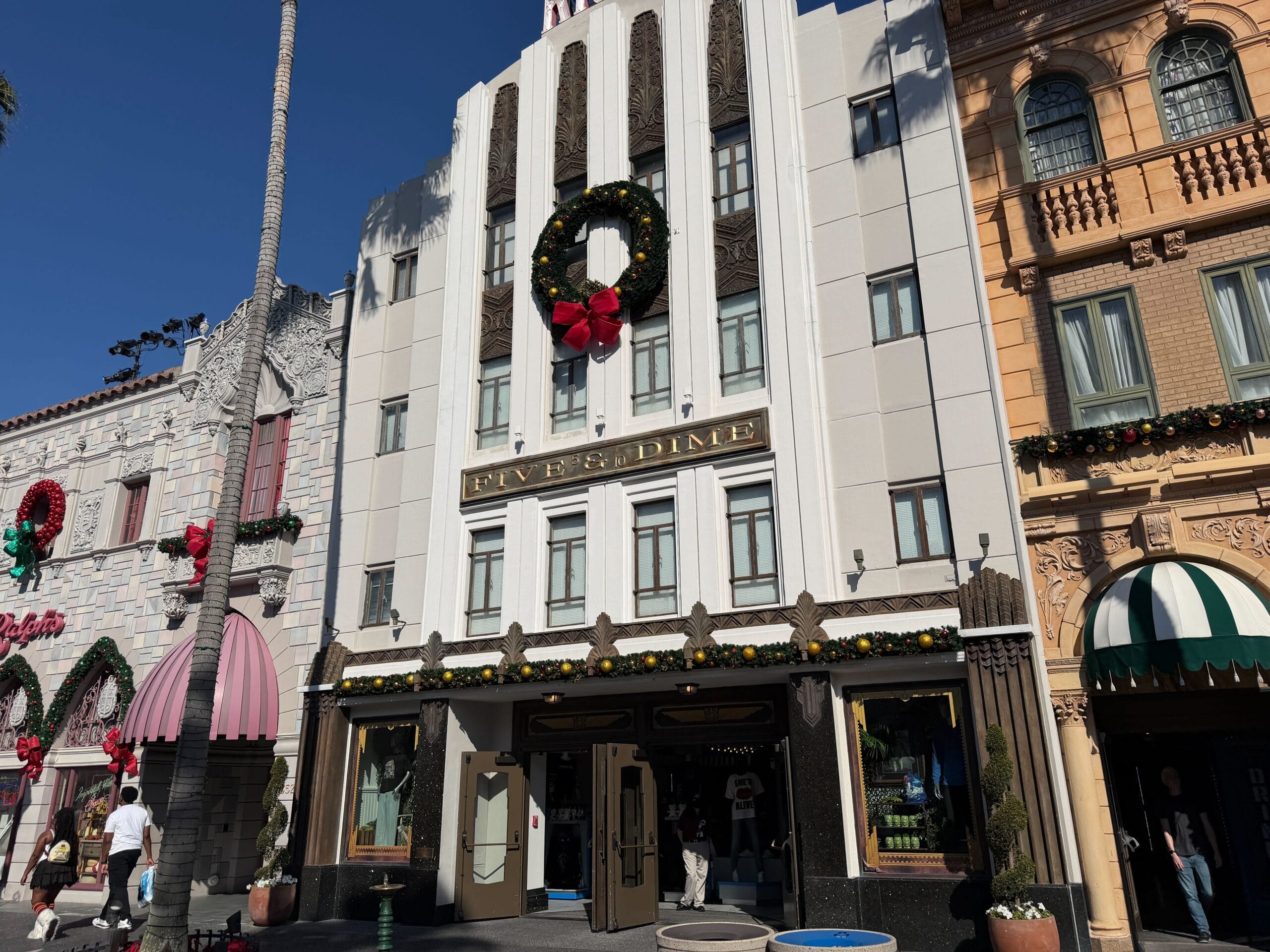 A large wreath and garland decorate the Five & Dime facade.