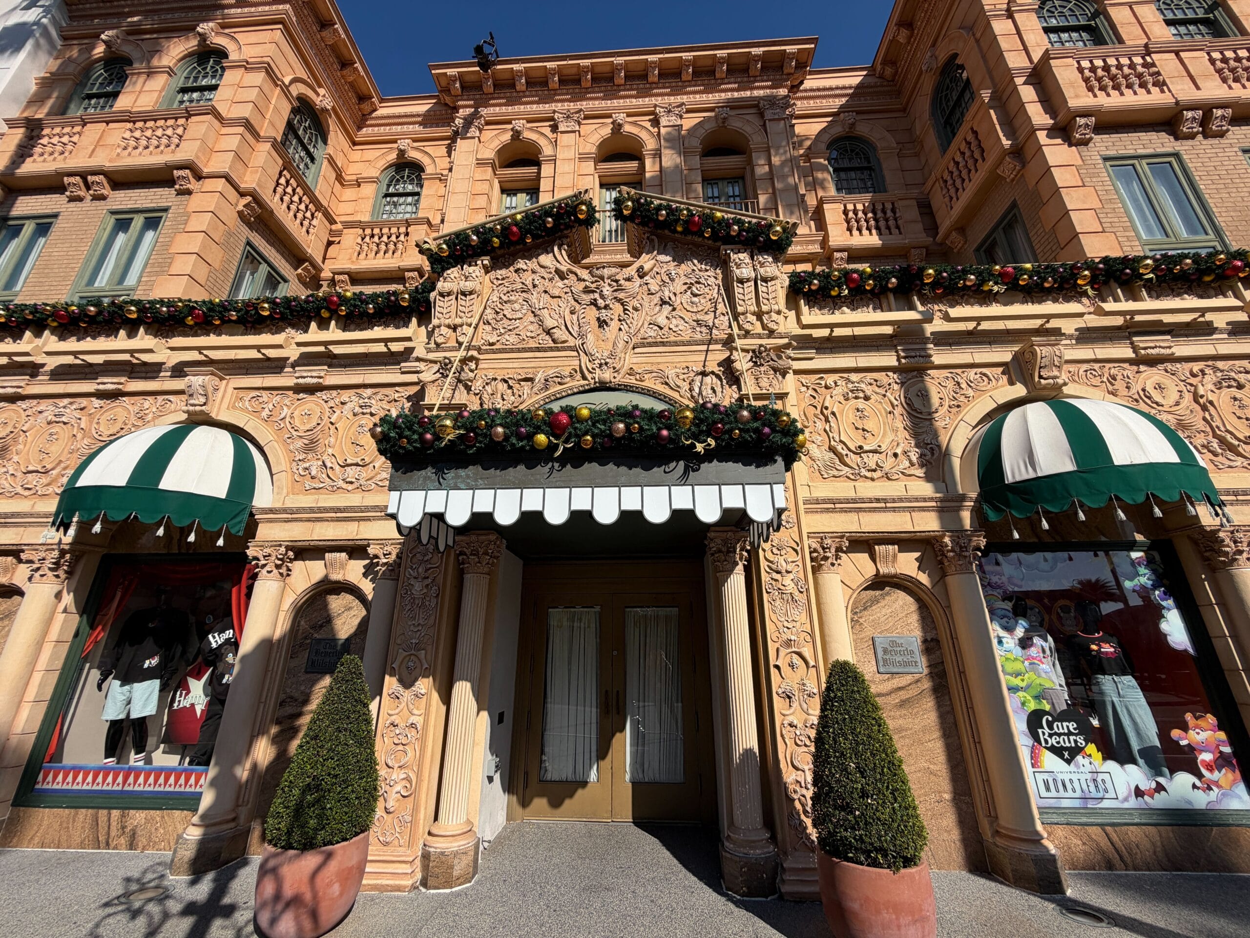 Garland with red and gold ornament balls line the facade for The Beverly.