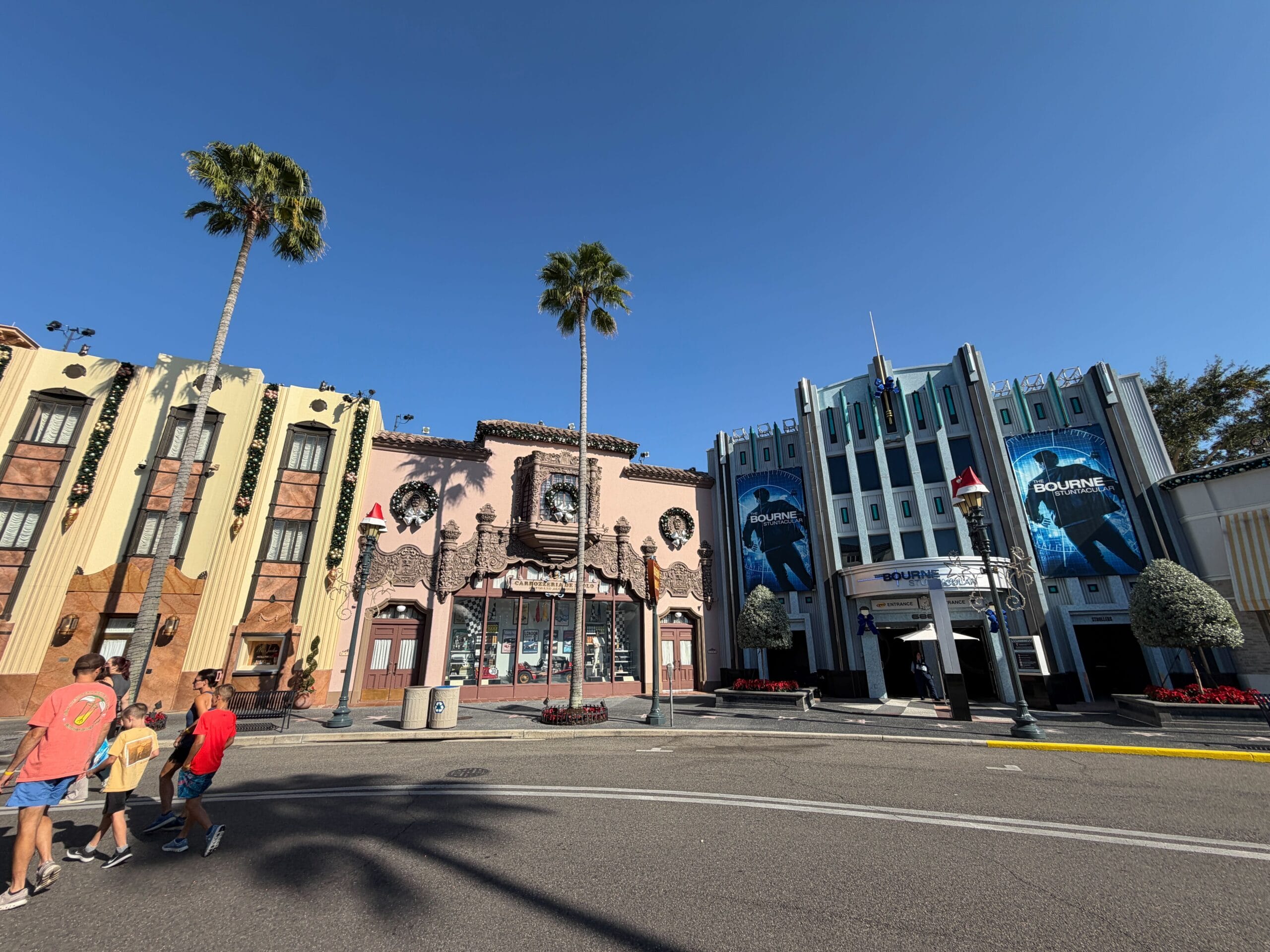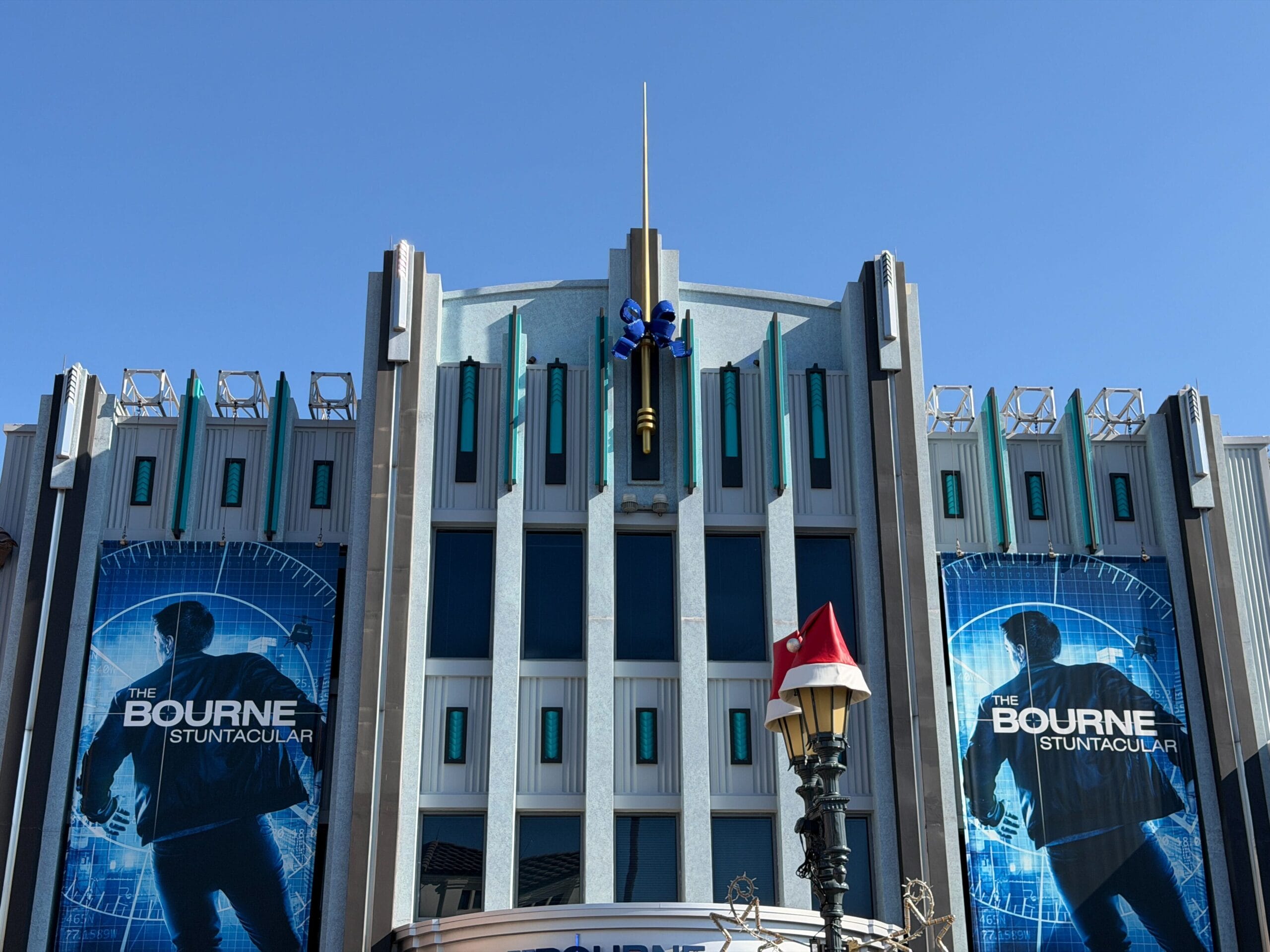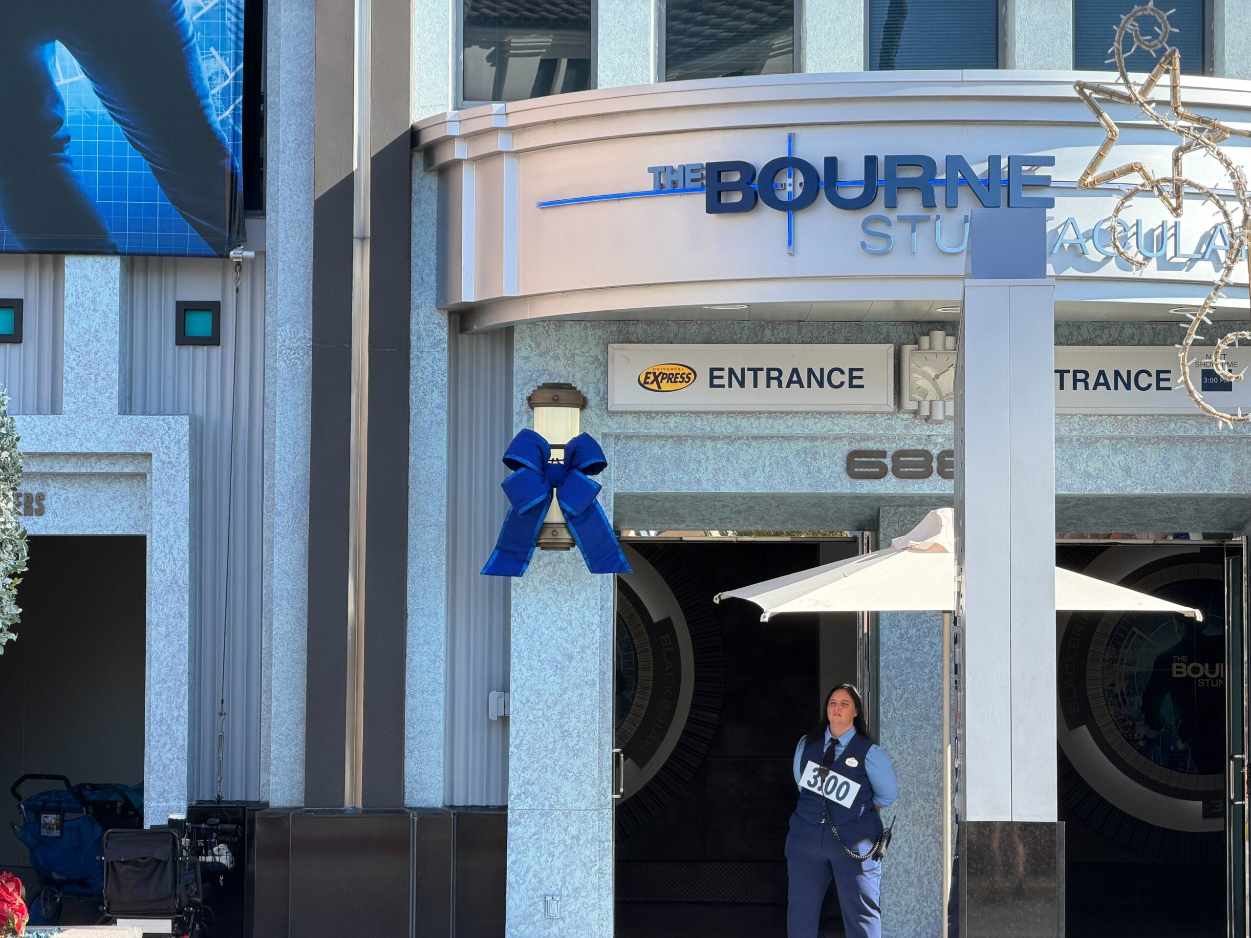 Blue bows decorate the lamps at the entrance to The Bourne Stuntacular, as well as at the very top of the building.