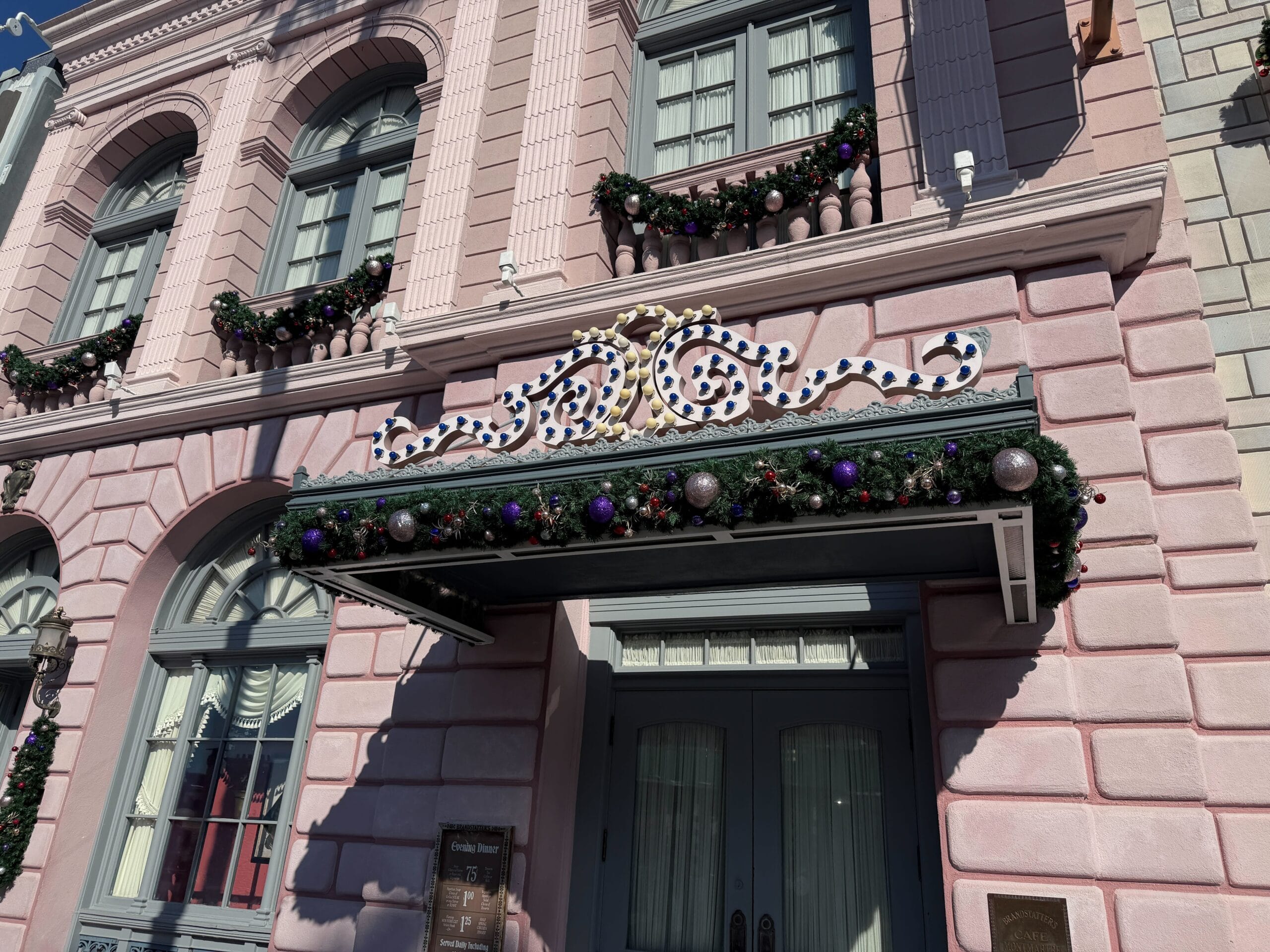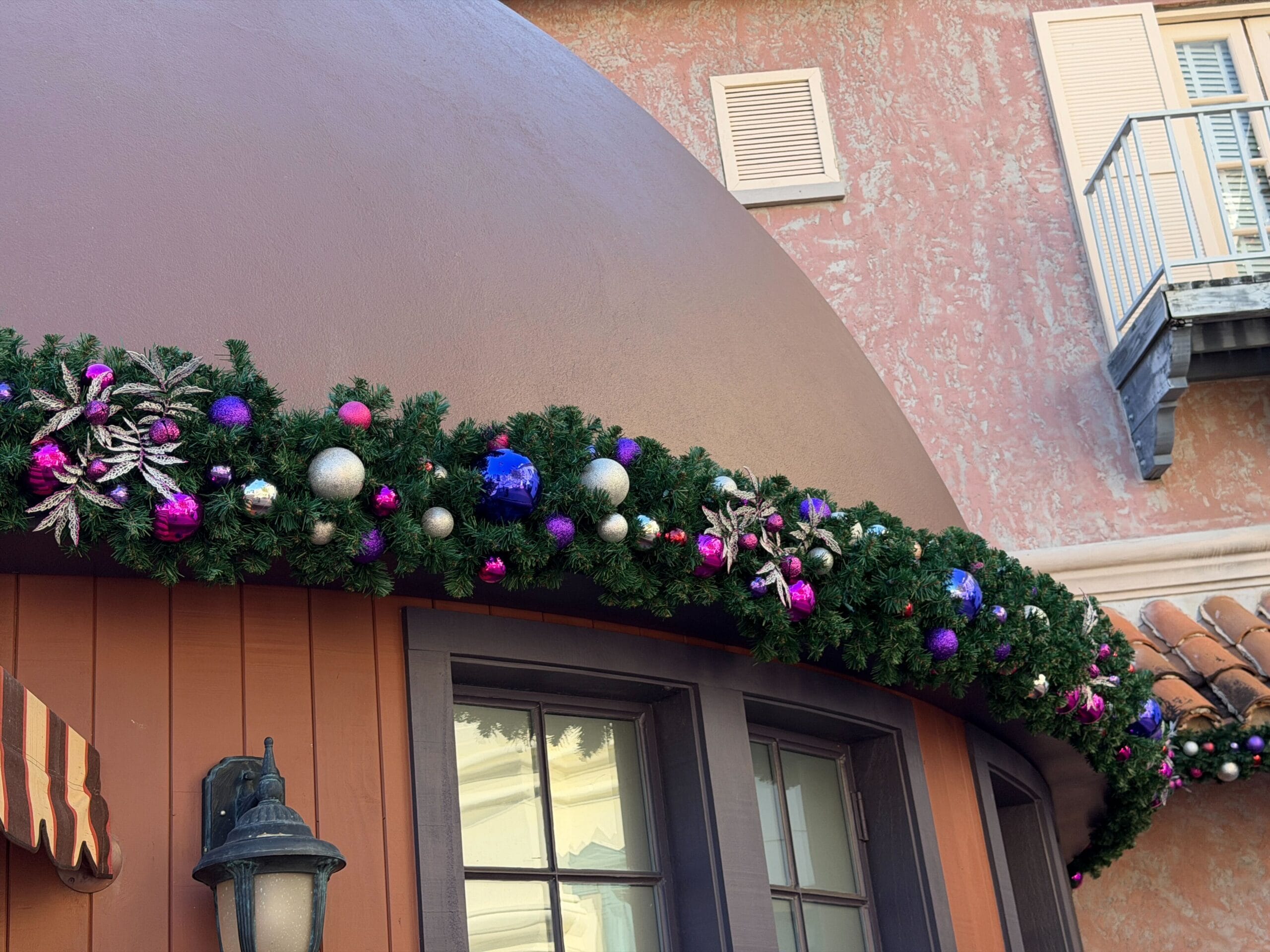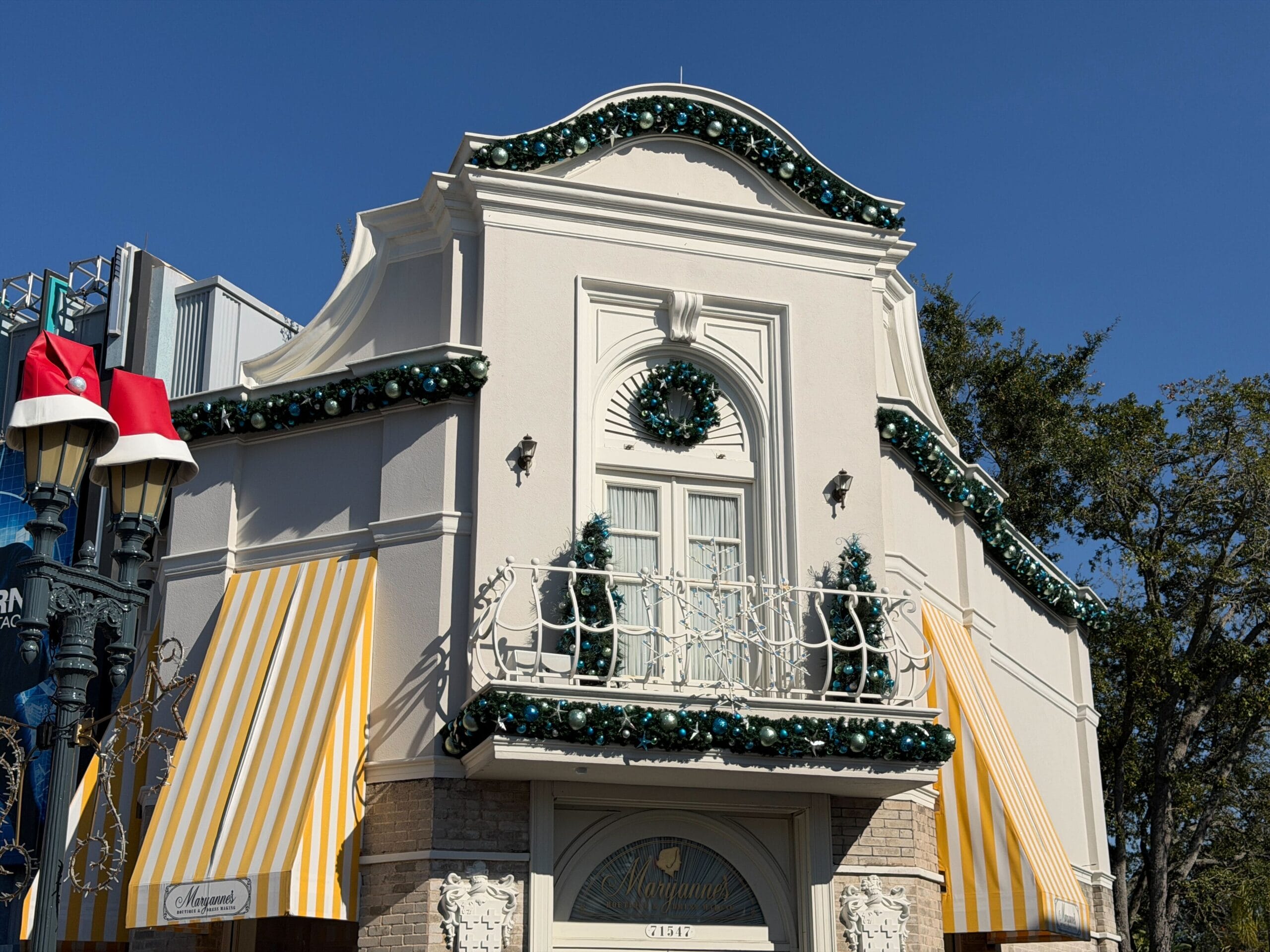 Another façade has garland across the awning over three entry doors and two wreathes bookending them. There are also Christmas trees on the balconies.