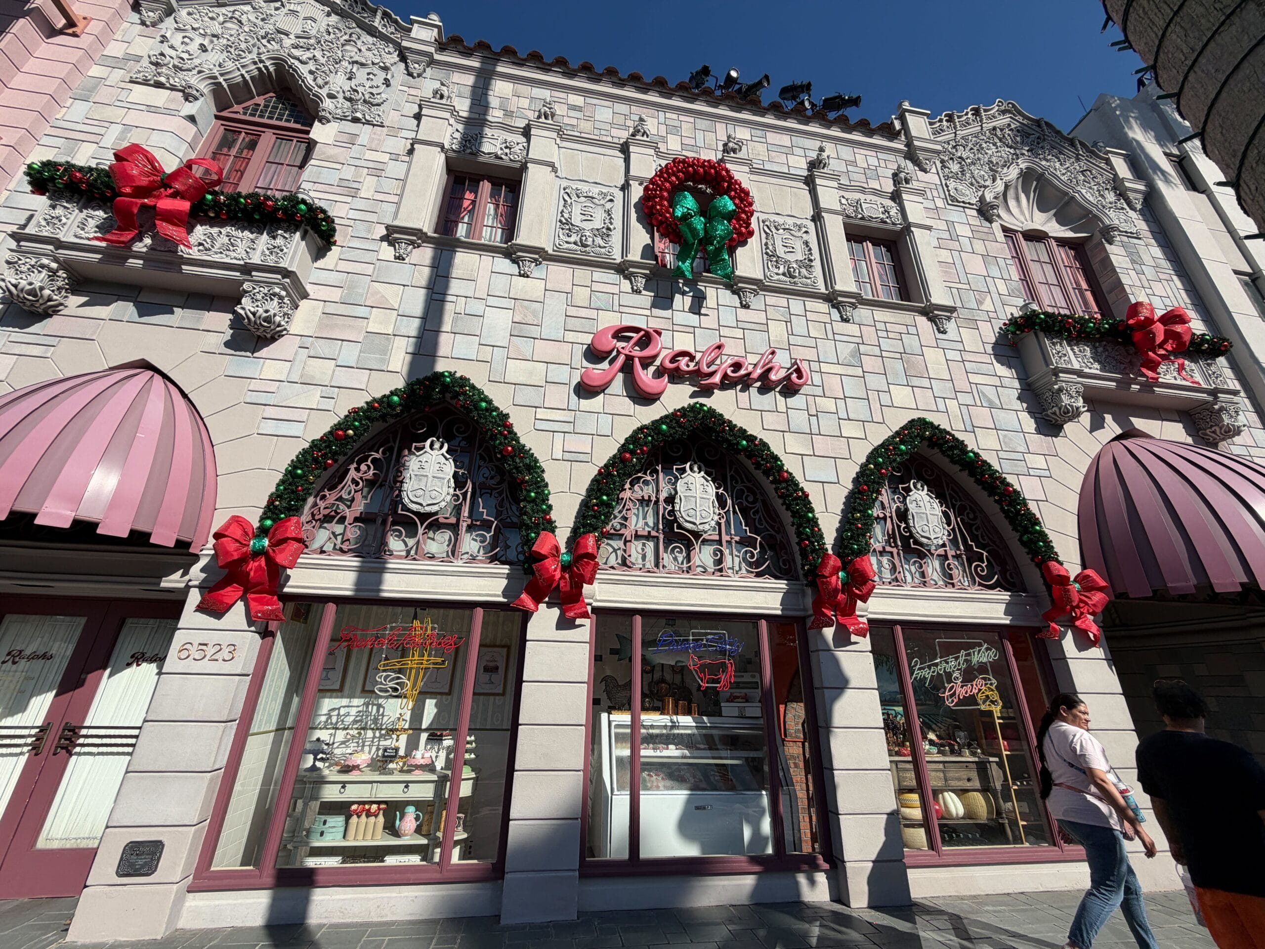 Large red bows, a red ornament wreath, and garland decorate Ralph’s.