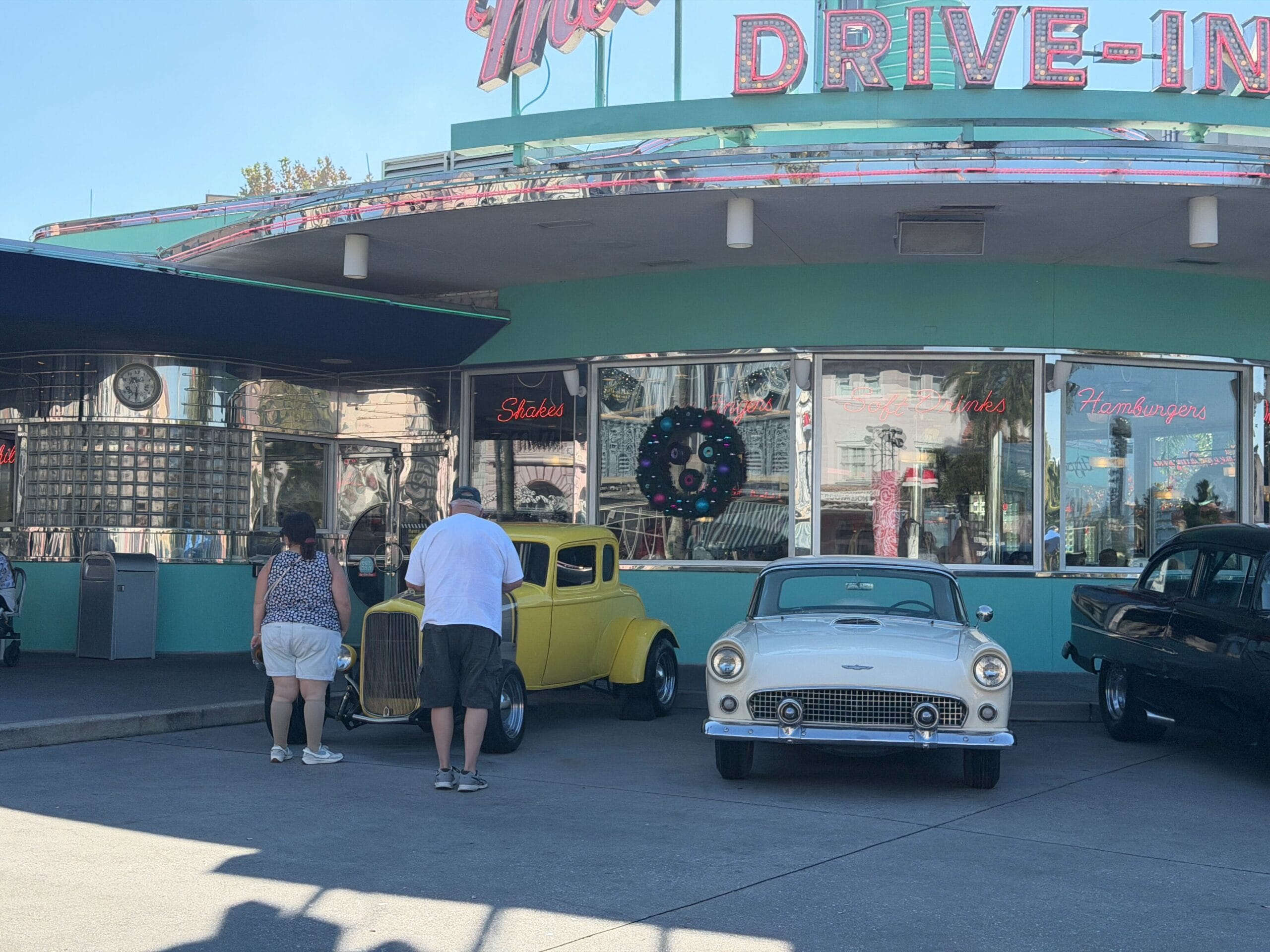 Wreaths with ornaments are placed on the windows of Mel’s Drive-In.