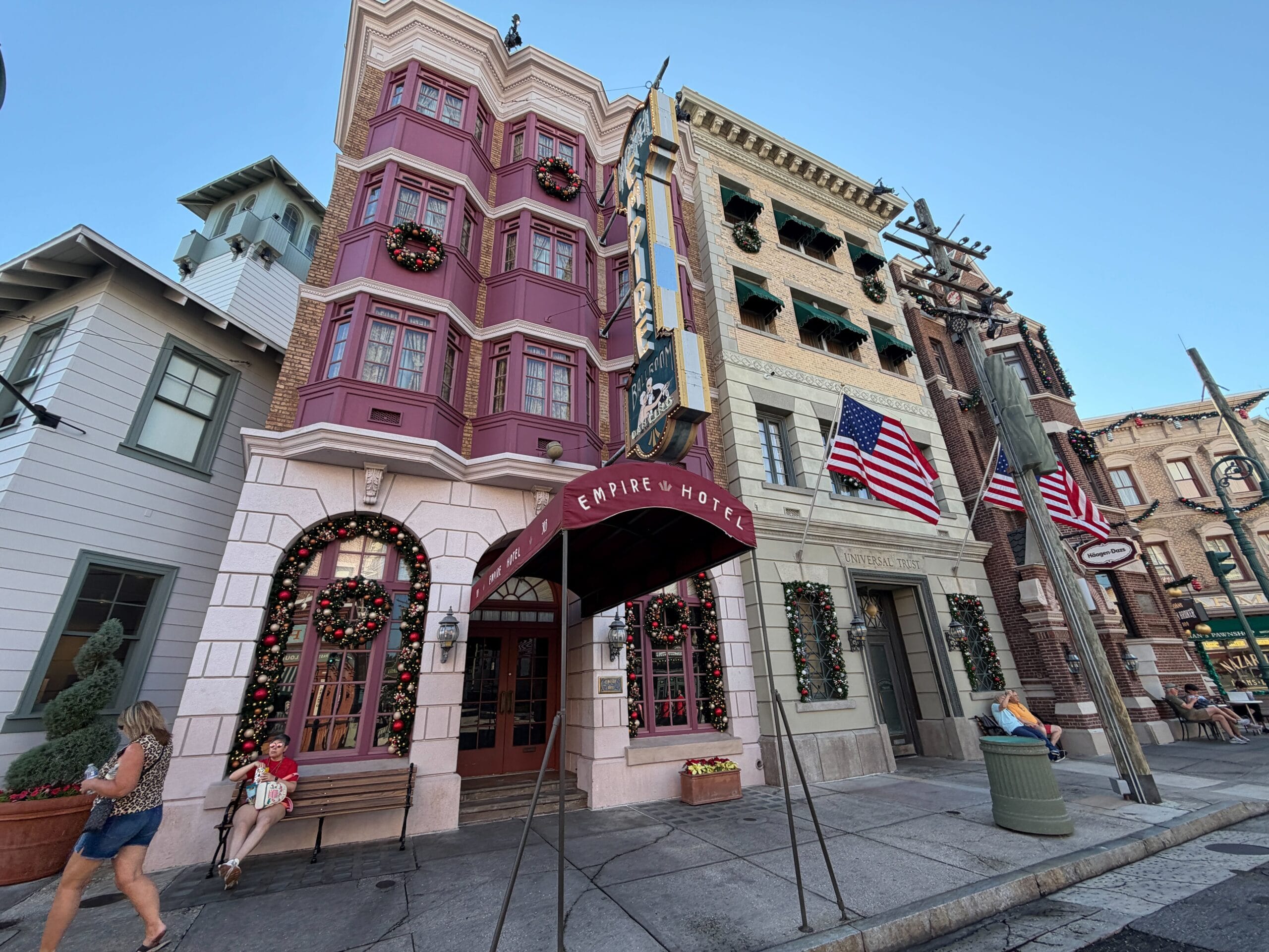 Empire Hotel has garland in the window arches, as well as wreaths on the windows.