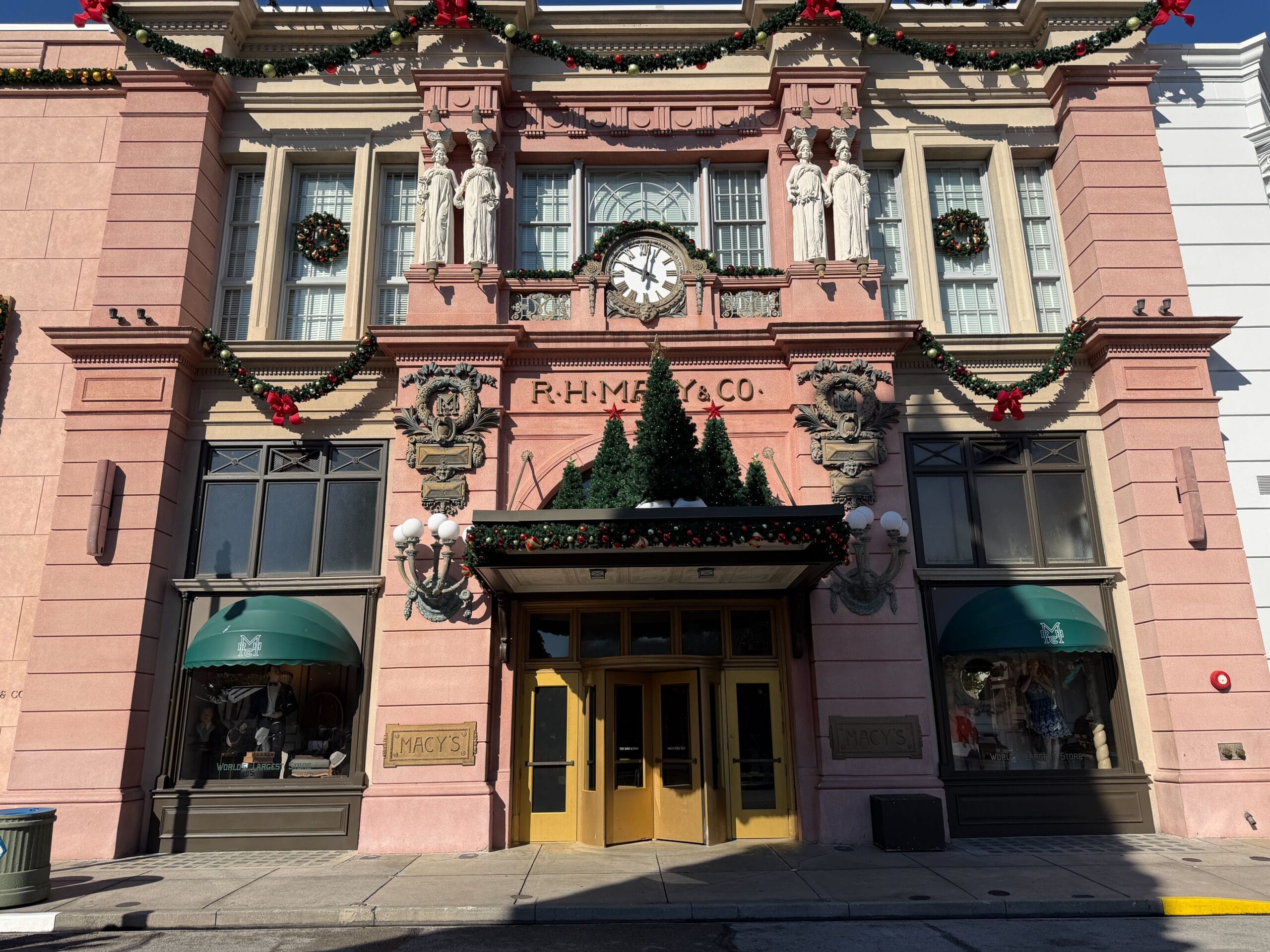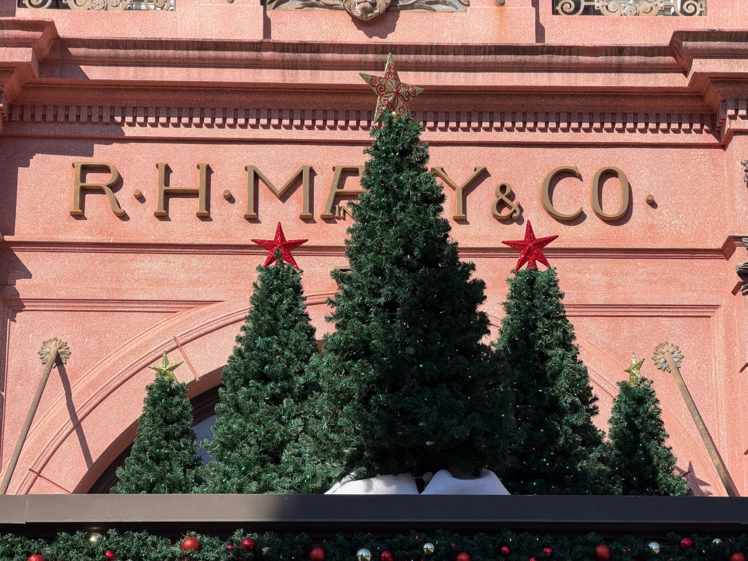 The R.H. Macy & Co. building features garland across the pillars and over the clock above the entrance.