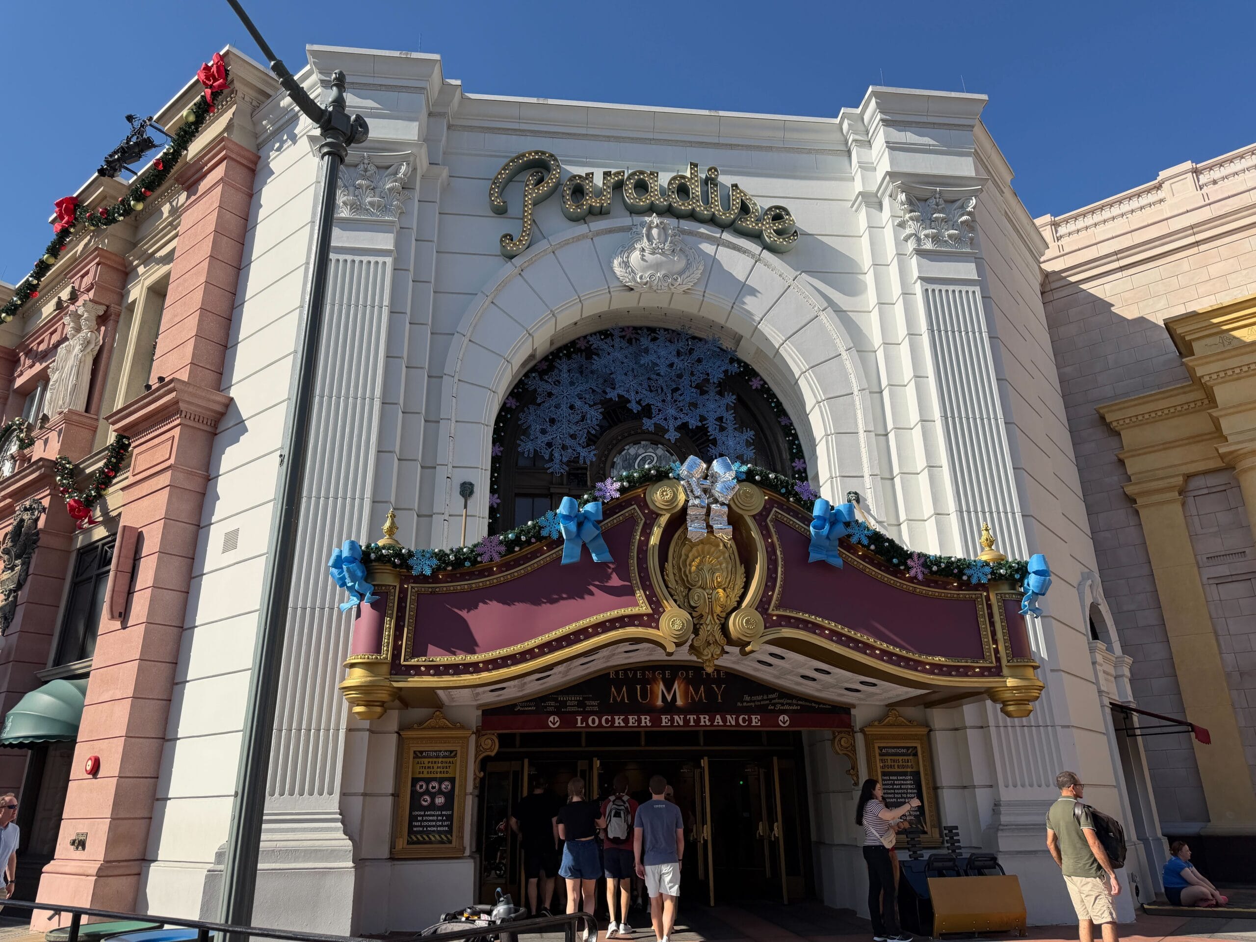 Blue ribbons and garlands line the locker entrance for Revenge of the Mummy. Snowflakes hang from the archway and pink snowflakes line the garland bordering the arch.