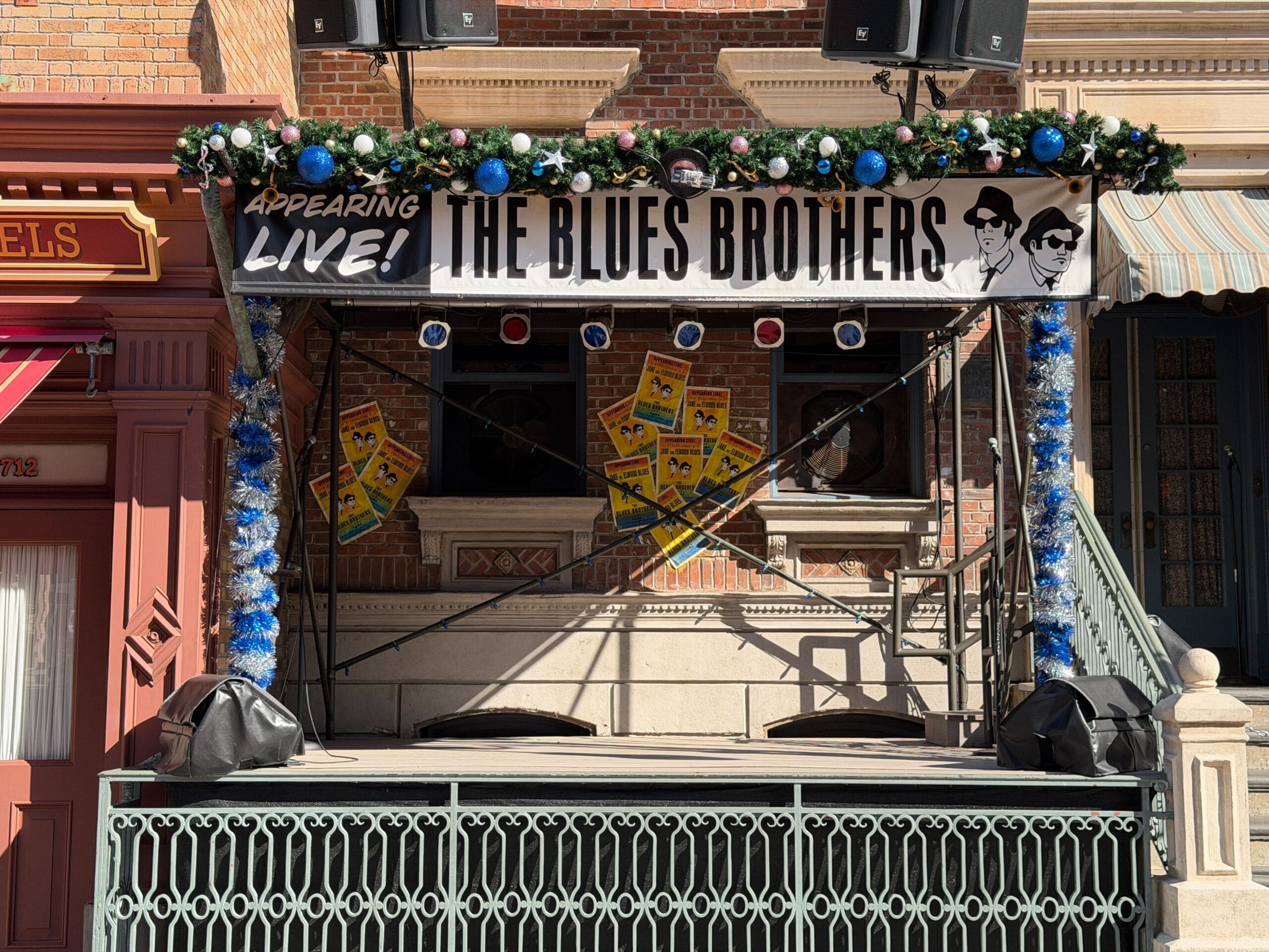 The Blues Brothers stage is adorned with silver and blue tinsel, as well as garland with pink, white, and blue ornaments.