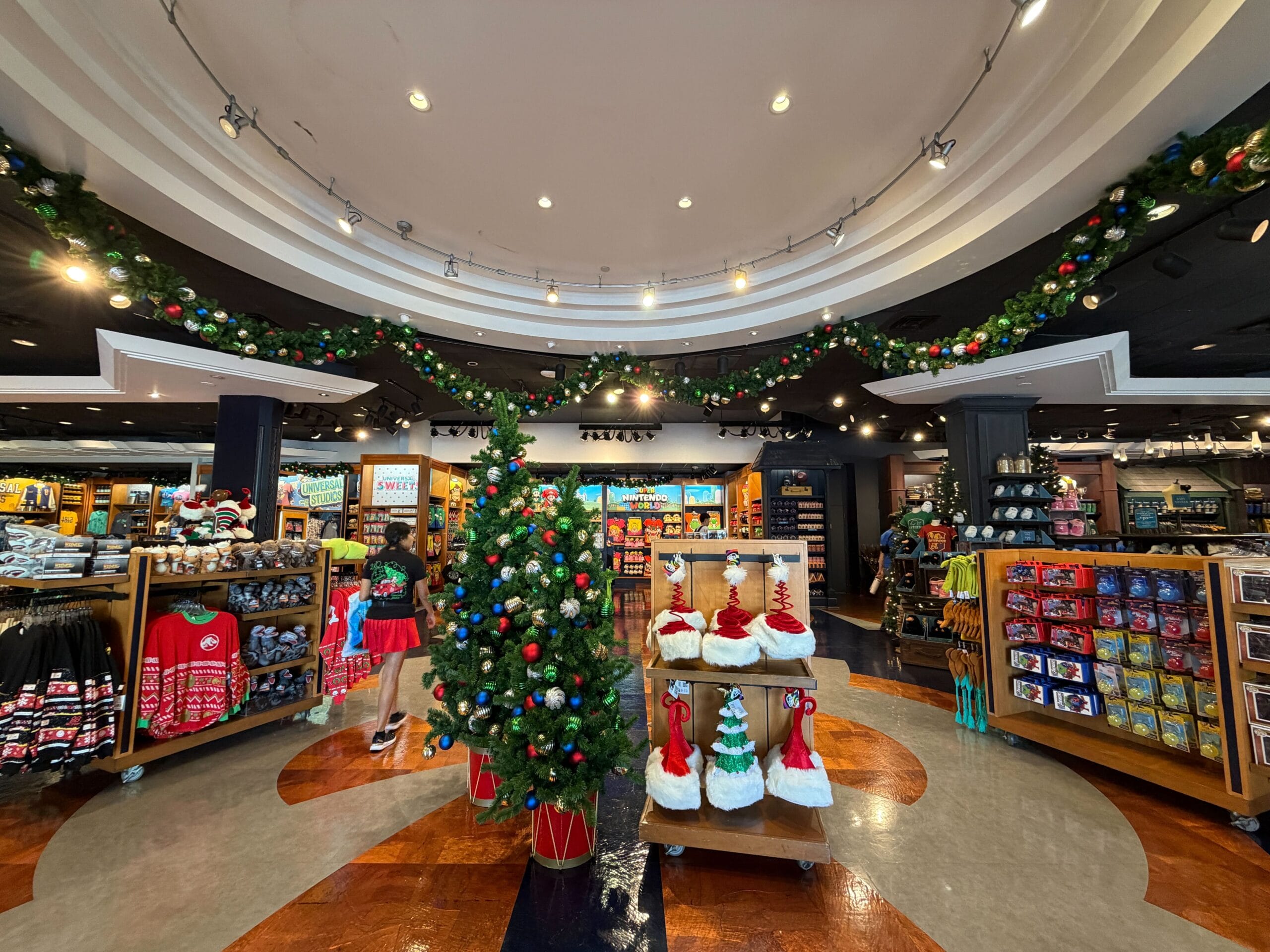Christmas trees with ornaments in a variety of colors are also placed throughout the store.