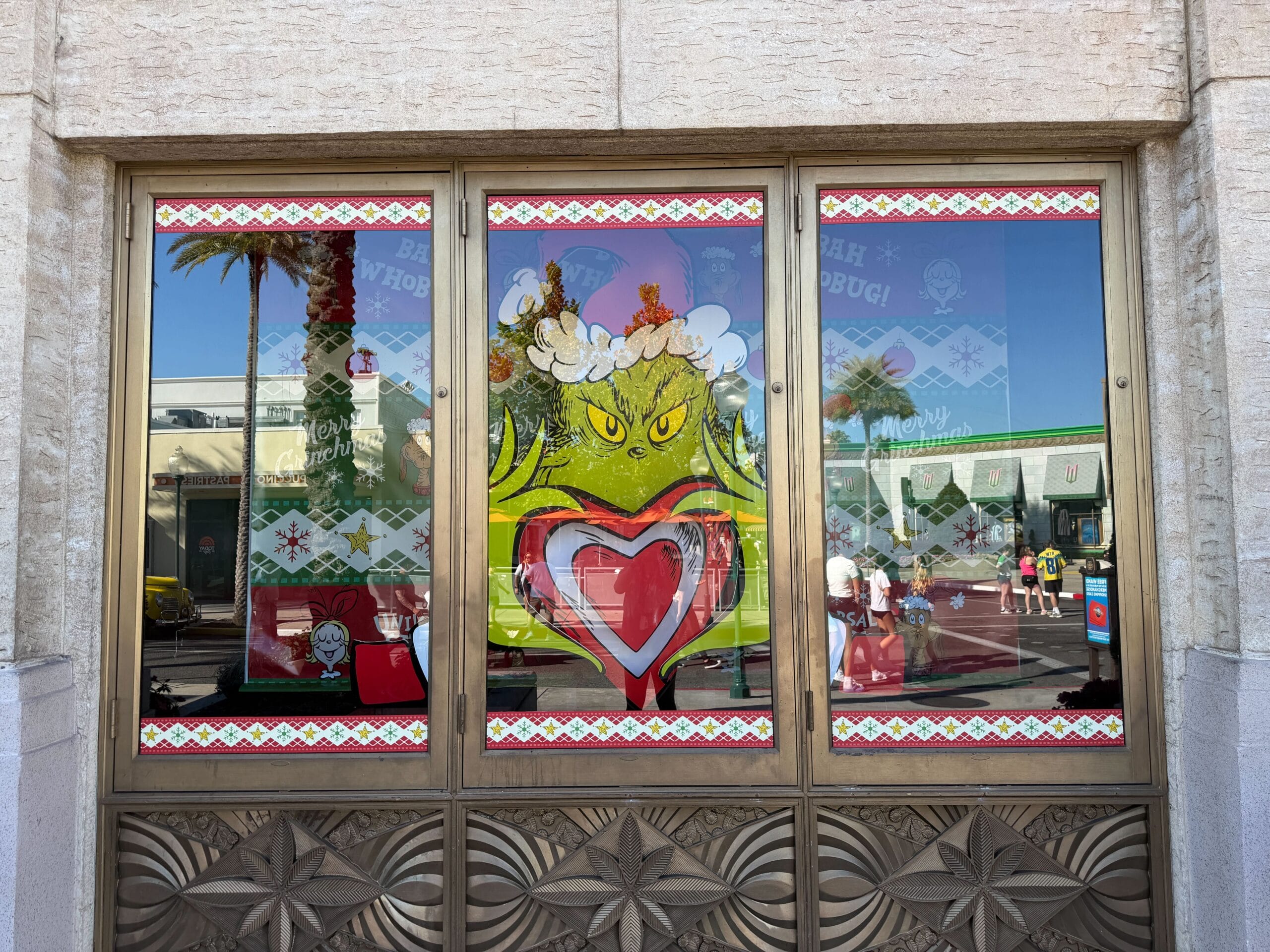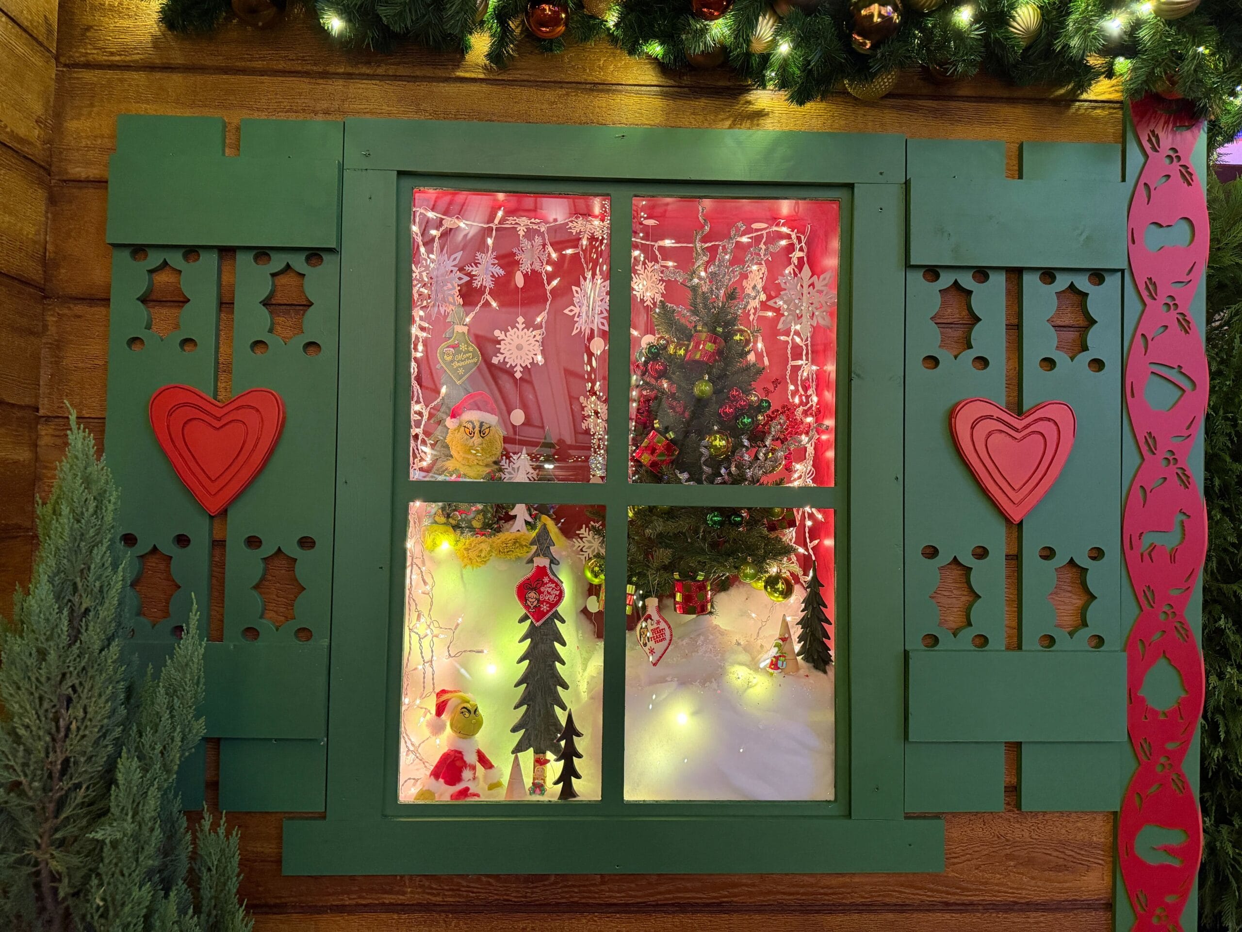 The first window features The Grinch holding a red heart.